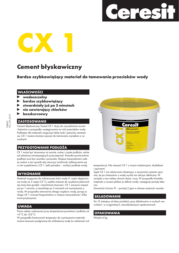 CX 1 Cement błyskawiczny CERESIT CX_1_KT_02.15 Bardzo szybkowiążący materiał do tamowania przecieków wody WŁAŚCIWOŚCI wodoszczelny bardzo szybkowiążący stwardniały już po 3 minutach nie zawierający chlorków bezskurczowy ZASTOSOWANIE Cement błyskawiczny Ceresit CX 1 służy do uszczelniania murów i betonów w przypadku występowania na nich przecieków wody. Podłożem dla materiału mogą być także tynki i jastrychy cementowe. CX 1 można również używać do tamowania wycieków z rur wodnych. PRZYGOTOWANIE PODŁOŻA CX 1 może być stosowany na zwarte, nośne i czyste podłoża, wolne od substancji zmniejszających przyczepność. Ponadto powierzchnia podłoża musi być szorstka i porowata. Miejsce nieszczelności należy rozkuć w ten sposób aby stworzyć możliwość zakleszczenia się w nim wypełnienia z CX 1. Jeśli potrzeba – zwilżyć podłoże wodą. WYKONANIE Materiał wsypywać do odmierzonej ilości wody (1 część objętościowa wody na 3 części CX 1), szybko mieszać do uzyskania jednorodnej masy bez grudek i natychmiast stosować. CX 1 zaczyna wiązać już po 1 minucie, a twardnieje po 3 minutach od wymieszania z wodą. W przypadku tamowania silnego wypływu wody, porcję suchego CX 1 wcisnąć bezpośrednio w miejsce nieszczelności i kilka minut przytrzymać. UWAGA Prace należy wykonywać przy temperaturze powietrza i podłoża od +5°C do +25°C. W przypadku krańcowych temperatur do wymieszania materiału można stosować podgrzaną lub schłodzoną wodę (w zależności od temperatury). Nie mieszać CX 1 z innymi substancjami, dodatkami i spoiwami. Sypki CX 1 ma właściwości drażniące, a zawartość cementu sprawia, że po zmieszaniu z wodą wyrób ma odczyn alkaliczny. W związku z tym należy chronić skórę i oczy. W przypadku kontaktu materiału z oczami płukać je obficie wodą i zasięgnąć porady lekarza. Zawartość chromu VI – poniżej 2 ppm w okresie ważności wyrobu. SKŁADOWANIE Do 12 miesięcy od daty produkcji, przy składowaniu w suchych warunkach i w oryginalnych, nieuszkodzonych opakowaniach. OPAKOWANIA Wiadro 6 kg. DANE TECHNICZNE Baza: mieszanka cementów Gęstość nasypowa: ok. 1,12 kg/dm3 Proporcje mieszania: ok. 0,3 l wody na 1 kg Temperatura stosowania: od +5°C do +25°C Czas zużycia: ok. 50 sek. Wytrzymałość na ściskanie: –po 6 godz. –po 24 godz. –po 28 dniach ≥ 7,0 MPa ≥ 10,0 MPa ≥ 35,0 MPa Wytrzymałość na zginanie: –po 6 godz. –po 24 godz. –po 28 dniach ≥ 0,7 MPa ≥ 2,0 MPa ≥ 5,0 MPa Orientacyjne zużycie: ok. 1,6 kg/dm3 wypełnianej objętości – Wyrób posiada: Aprobatę Techniczną Instytutu Techniki Budowlanej AT-15-4299/2014, Certyfikat Zakładowej Kontroli Produkcji nr ITB – 0431/Z wydany przez ITB, Deklarację Zgodności 00514 / 15-04-2014 oraz atest higieniczny Państwowego Zakładu Higieny na kontakt z wodą pitną HK/W/0942/02/2013. Wszelkie porady techniczne można uzyskać pod numerami telefonów: +48 800 120 241 +48 41 3710124. Informacje zawarte w niniejszej karcie technicznej, w szczególności zalecenia dotyczące sposobu i warunków aplikacji oraz zakresu zastosowania i użytkowania naszych produktów, zostały opracowane na podstawie naszego doświadczenia zawodowego. Niniejsza karta techniczna określa zakres stosowania materiału i zalecany sposób prowadzenia robót, ale nie może zastąpić zawodowego przygotowania wykonawcy. Producent gwarantuje jakość wyrobu, natomiast nie ma wpływu na warunki i sposób jego użycia. Biorąc pod uwagę, że warunki, w których stosowane są produkty mogą ulegać zmianie, w przypadku wątpliwości zalecane jest przeprowadzenie własnych prób. Nie ponosimy odpowiedzialności z tytułu powyżej wymienionych informacji lub jakiejkolwiek rekomendacji słownej z tym związanej, z wyjątkiem przypadków rażącego niedbalstwa lub winy umyślnej. Niniejsza karta techniczna zastępuje wszystkie poprzednie wersje, mające zastosowanie do tego produktu. CERESIT CX_1_KT_02.15 Poza informacjami podanymi w niniejszej karcie technicznej należy przestrzegać zasad sztuki budowlanej, wytycznych branżowych instytutów i stowarzyszeń, przedmiotowych norm krajowych i europejskich, dokumentów aprobacyjnych, przepisów BHP, itp. Wymienione powyżej cechy i właściwości techniczne określone zostały w oparciu o praktyczne doświadczenia oraz przeprowadzone badania. Wszelkie właściwości oraz zastosowania materiałów wykraczające poza zakres podany w niniejszej karcie technicznej wymagają naszego pisemnego potwierdzenia. Wszelkie dane odnoszą się do temperatury podłoża, otoczenia i materiału +23°C oraz wilgotności względnej powietrza 50%, o ile nie podano inaczej. W innych warunkach klimatycznych podane parametry mogą ulec zmianie.