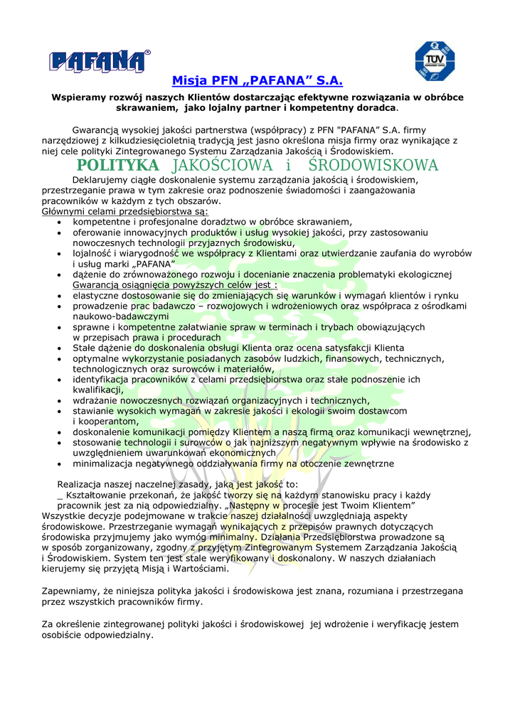 Zintegrowana Polityka Jakości i Środowiskowa Pafana S.A