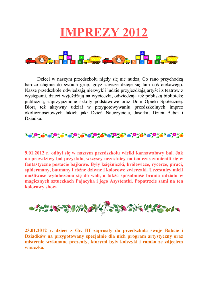 IMPREZY 2012 Dzieci w naszym przedszkolu nigdy się nie nudzą. Co rano przychodzą bardzo chętnie do swoich grup, gdyż zawsze dzieje się tam coś ciekawego. Nasze przedszkole odwiedzają niezwykli ludzie przyjeżdżają artyści z teatrów z występami, dzieci wyjeżdżają na wycieczki, odwiedzają też pobliską bibliotekę publiczną, zaprzyjaźnione szkoły podstawowe oraz Dom Opieki Społecznej. Biorą też aktywny udział w przygotowywaniu przedszkolnych imprez okolicznościowych takich jak: Dzień Nauczyciela, Jasełka, Dzień Babci i Dziadka. 9.01.2012 r. odbył się w naszym przedszkolu wielki karnawałowy bal. Jak na prawdziwy bal przystało, wszyscy uczestnicy na ten czas zamienili się w fantastyczne postacie bajkowe. Były księżniczki, królewicze, rycerze, piraci, spidermany, batmany i różne dziwne i kolorowe zwierzaki. Uczestnicy mieli możliwość wytańczenia się do woli, a także sposobność brania udziału w magicznych sztuczkach Pajacyka i jego Asystentki. Popatrzcie sami na ten kolorowy show. 23.01.2012 r. dzieci z Gr. III zaprosiły do przedszkola swoje Babcie i Dziadków na przygotowany specjalnie dla nich program artystyczny oraz misternie wykonane prezenty, którymi były kolczyki i ramka ze zdjęciem wnuczka. 23.01.2012 r. odbyła się impreza z okazji Dnia Babci i Dziadka w Gr. IV. Dzieci zaprosiły swoich dziadków na atrakcyjny występ artystyczny oraz poczęstunek. Podarowały swoim dziadkom kolorowe laurki i własnoręcznie ozdobiony świecznik z masy papierowej. 23.01.2012 r. swoich kochanych Dziadków i swoje kochane Babcie zaprosiły też dzieci z Gr. V. dzieci wraz z paniami przygotowały fantastyczny program artystyczny, który perfekcyjnie zaprezentowały zgromadzonym gościom. Babciom i Dziadkom podarowały pięknie własnoręcznie wykonane kwiaty z papieru. 24.01.2012 r. swoich Dziadków i swoje Babcie zaprosiły do przedszkola Maluszki. Wraz ze swoją panią przygotowały wierszyki, piosenki i tańce, które zaprezentowały przed szacowną publicznością. Popatrzcie jak to wyglądało. 24.01.2012 r. miały występ artystyczny z okazji Dnia Babci i Dziadka dzieci z Gr. II. Dzieciaki wraz ze swoimi paniami przygotowały fajny program artystyczny, zaprosiły dziadków na przygotowany przez rodziców poczęstunek i wręczyły własnoręcznie. 17.02.2012 r. dzieci z Gr. IV i V wybrały się na wycieczkę do biblioteki przy ul. Ząbkowskiej na wystawę zorganizowaną przez Przedszkole Nr 163 pt. „10 lat Milusia”. Na wystawie dzieci mogły podziwiać fantastyczne postacie Milusia wykonane przez dzieci i rodziców, wystawę prac dzieci, przepiękne dekoracje wykonane przez nauczycielki z Przedszkola 163. Popatrzcie sami. 21.02.2012 r. przyjechał do naszego Przedszkola prawdziwy teatr z fantastycznym przedstawieniem pt. „Mała księżniczka”. Dzieci miały sposobność obejrzeć profesjonalnie zagrane przedstawienie z dobrym przekazem w treści oraz dużą dawką humoru. Spójrzcie na zdjęcia. 5.03.2012 r. dzieci z Gr. II wybrały się na wycieczkę do pobliskiej Biblioteki dla dzieci i młodzieży przy ul. Radzymińskiej. Dzieciaki miały okazję zapoznać się z biblioteką, z osobami w niej pracującymi, księgozbiorem. Wysłuchały też bajki o Czerwonym Kapturku czytanej przez panią bibliotekarkę, a potem kolorowały obrazki związane z bajką. 13.03.2012 r. dzieci z Gr. IV wybrały się na wycieczkę do Pizzerii Dominium w Carrefourze. Na miejscu dzieci dowiedziały się skąd się wzięła pizza, poznały legendę o Margaricie, miały okazję zobaczyć jak się przygotowuje pizzę oraz zdegustować wybrany jej rodzaj. Naprawdę bardzo pysznie było. 21.03.2012 r. dzieci z Gr. IV i V wybrały się na wycieczkę do Szkoły Podstawowej przy ul. Białostockiej. Podczas wyprawy miały okazję obejrzeć przedstawienie specjalnie dla nich przygotowane przez uczniów i nauczycieli, zwiedzić wszystkie najważniejsze pomieszczenia szkolne, poczuć atmosferę panującą w szkole. Popatrzcie na zdjęcia. 27.03.2012 r. dzieci z Gr. IV i V pojechały do sali zabaw Kolorado. Jest to piękna, kolorowa, wyposażona w przeróżne sprzęty do zabawy sala. Dzieciaki miały okazję naprawdę zdrowo poszaleć w bardzo bezpiecznym i atrakcyjnym dla nich miejscu. Spójrzcie na nasze wesołe miny. 2.04.2012 r. dzieci z Gr. II i IV zaprosiły swoich rodziców na zajęcia, podczas których rodziny miały okazję przemienić jaja w piękne kolorowe pisanki oraz wykonać do nich różnorodne koszyczki. 3.04.2012 r. na zajęcia zaprosiły swoich rodziców dzieci z Gr. I, III i V. podczas zajęć dzieci pokazały rodzicom, jak potrafią pracować i bawić się w przedszkolu, a także zaprosiły rodziców do wspólnego malowania i ozdabiania jaj. Zobaczcie zdjęcia z zajęć. Zajęcia z rodzicami w Gr. I (zdjęcia) Zajęcia z rodzicami w Gr. III (zdjęcia) Zajęcia z rodzicami w Gr. V (zdjęcia) 5.04.2012 r. dzieci z Gr. III, IV i V wybrały się na wycieczkę do sąsiedniego Przedszkola na ul. Markowską na wielkanocny teatrzyk przygotowany przez dzieci i ich panie. Dzieci biorące udział w przedstawieniu dały z siebie wszystko, wspaniale zaprezentowały przygotowany program artystyczny, obdarowały też nas, gości drobnymi upominkami. Było co wspominać. 13.04.2012 r. odwiedził nasze Przedszkole ciekawy teatrzyk pt. „Witaj wiosno”. Dzieci wspólnie z aktorami zaklinały wiosnę, śpiewały, tańczyły i świetnie się przy tym bawiły. Popatrzcie na zdjęcia. 23.04.2012 r. dzieci z Gr. IV odwiedził nietypowy gość. Tym gościem była mama Mateusza, która jest z zawodu lekarzem stomatologiem. Przybyła, by opowiedzieć dzieciom o prawidłowej higienie jamy ustnej i pokazać jak należy prawidłowo myć zęby i dbać o nie na co dzień. Zobaczcie jak wyglądały te niecodzienne zajęcia. 25.04.2012 r. dzieci z Gr. III i V odwiedziły Nadleśnictwo Chojnów w Pilawie. Uczestniczyły w zajęciach edukacyjnych. Miały okazję na własne oczy poobser