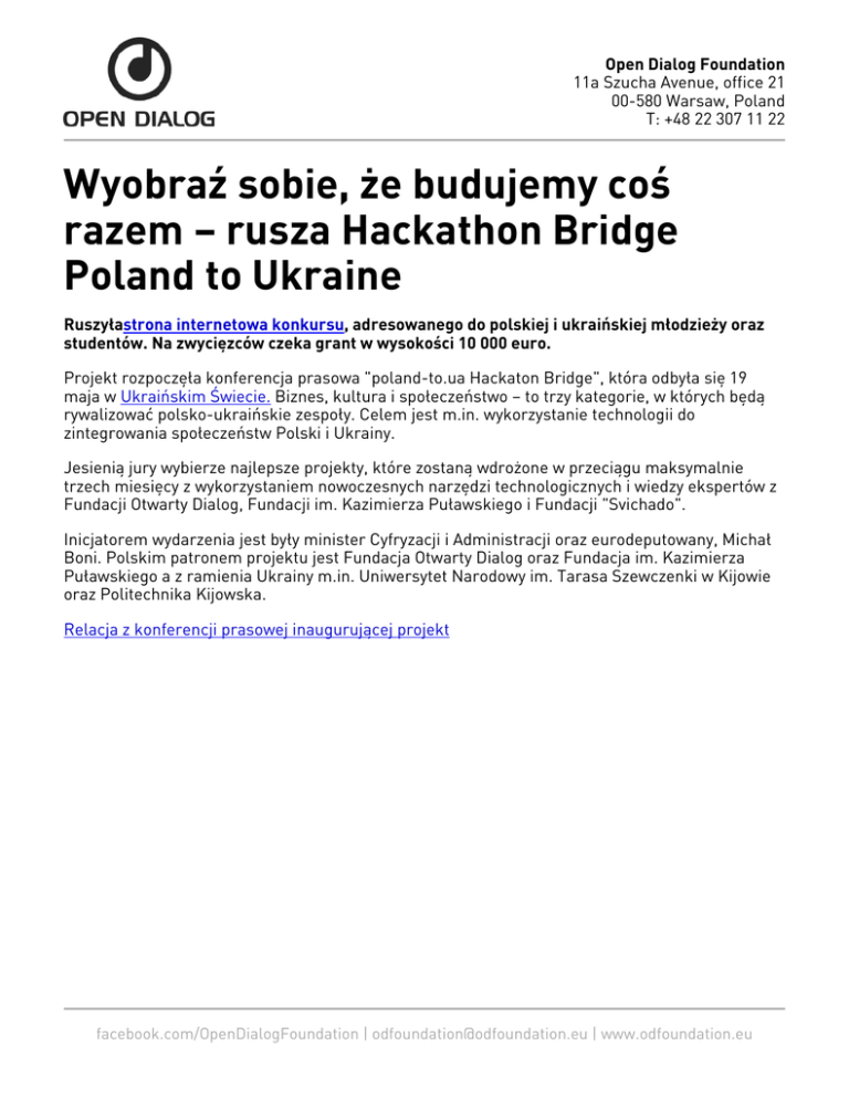 Open Dialog Foundation 11a Szucha Avenue, office 21 00-580 Warsaw, Poland T: +48 22 307 11 22 Wyobraź sobie, że budujemy coś razem – rusza Hackathon Bridge Poland to Ukraine Ruszyłastrona internetowa konkursu, adresowanego do polskiej i ukraińskiej młodzieży oraz studentów. Na zwycięzców czeka grant w wysokości 10 000 euro. Projekt rozpoczęła konferencja prasowa "poland-to.ua Hackaton Bridge", która odbyła się 19 maja w Ukraińskim Świecie. Biznes, kultura i społeczeństwo – to trzy kategorie, w których będą rywalizować polsko-ukraińskie zespoły. Celem jest m.in. wykorzystanie technologii do zintegrowania społeczeństw Polski i Ukrainy. Jesienią jury wybierze najlepsze projekty, które zostaną wdrożone w przeciągu maksymalnie trzech miesięcy z wykorzystaniem nowoczesnych narzędzi technologicznych i wiedzy ekspertów z Fundacji Otwarty Dialog, Fundacji im. Kazimierza Puławskiego i Fundacji "Svichado". Inicjatorem wydarzenia jest były minister Cyfryzacji i Administracji oraz eurodeputowany, Michał Boni. Polskim patronem projektu jest Fundacja Otwarty Dialog oraz Fundacja im. Kazimierza Puławskiego a z ramienia Ukrainy m.in. Uniwersytet Narodowy im. Tarasa Szewczenki w Kijowie oraz Politechnika Kijowska. Relacja z konferencji prasowej inaugurującej projekt facebook.com/OpenDialogFoundation | [email protected] | www.odfoundation.eu