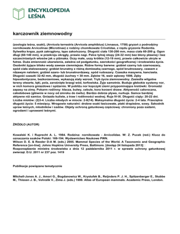 karczownik ziemnowodny (zoologia leśna, ssaki), (Arvicola terrestris (Arvicola amphibius) Linnaeus, 1758) gryzoń z podrodziny nornikowate Arvicolinae (Microtinae) z rodziny chomikowate Cricetidae, z rzędu gryzonie Rodentia. Sylwetka krępa, pysk zakrąglony, tępo zakończony. Długość ciała 130-200 mm, masa ciała 60-200 g. Ogon długi (60-140 mm), w przekroju okrągły, prawie nagi. Palce tylnej stopy (24-32 mm) bez błony pławnej i bez szczeciniastych włosów jak u piżmaka. Oczy małe, uszy krótkie (12-19 mm), prawie całkowicie ukryte w futrze. Duża zmienność ubarwienia, zależna od podgatunku, szerokości geograficznej i środowiska życia. Osobniki żyjące blisko wody zawsze ciemniejsze. Różne formy barwne: grzbiet czarny lub czarnoszary, spód ciała stalowoszary; grzbiet brunatny z różną domieszką czarnego, spód brudnoszary, czasem z rdzawym nalotem; grzbiet szaro- lub brunatnordzawy, spód rudoszary. Czaszka masywna, kanciasta. Długość czaszki 32-42 mm, długość żuchwy < 30 mm. Zębów 16, wzór zębowy 1006. Zęby hipsodontyczne, bezkorzeniowe, wykazują stały wzrost. Tryb życia ziemnowodny. Zasiedla wilgotne tereny otwarte, łąki, pola, zarośnięte brzegi wód, torfowiska. Żyje samotnie. Buduje głebokie systemy nor, w nich komora gniazdowa i spiżarnie. W pobliżu nor kopczyki ziemi przypominające kretówki. Gromadzi zapasy na zimę. Pokarm roślinny: kłacza, bulwy, cebule, kora korzeni drzew. Aktywność całoroczna, całodobowa (głównie w nocy od zmroku do świtu). Bardzo dobrze pływa, nurkuje. Samce bardziej aktywne niż samice. Gniazdo kuliste, z traw i rośłinności wodnej. Ruja IV-IX. Długość ciąży: 20-22 dni. Liczba miotów: (2)3-4. Liczba młodych w miocie: 2-8(14). Maksymalna długość życia: 2-4 lata. Przeciętna długość życia: 5 miesięcy. Wrogowie naturalni: drobne ssaki łasicowate, ptaki drapieżne, sowy. Szkodnik upraw leśnych, młodników i sadów. Objety ochroną gatunkową częściową: chroniony poza sadami, ogrodami i uprawami leśnymi. ŹRÓDŁO (AUTOR) Kowalski K. i Ruprecht A. L. 1984. Rodzina: nornikowate - Arvicolidae. W: Z. Pucek (red.) Klucz do oznaczania ssaków Polski: 169-194. Wydawnictwo Naukowe PWN. Wilson D. E. & Reeder D-A M. (eds.) 2005. Mammal Species of the World. A Taxonomic and Geographic Reference [on-line]. Johns Hopkins University Press, Baltimore. [dostęp 24 listopada 2013] Rozporządzenie ministra środowiska z dnia 12 października 2011 r. w sprawie ochrony gatunkowej zwierząt. D.U. 2011 nr 237 poz. 1419 Publikacje powiązane tematycznie Mitchell-Jones A. J., Amori G., Bogdanowicz W., Krystufek B., Reijnders P. J. H., Spitzenberger E., Stubbe M., Thissen J. B., Vohralik V., Zima J. (eds.) 1999. Atlas of European mammals. Academic Press, London.