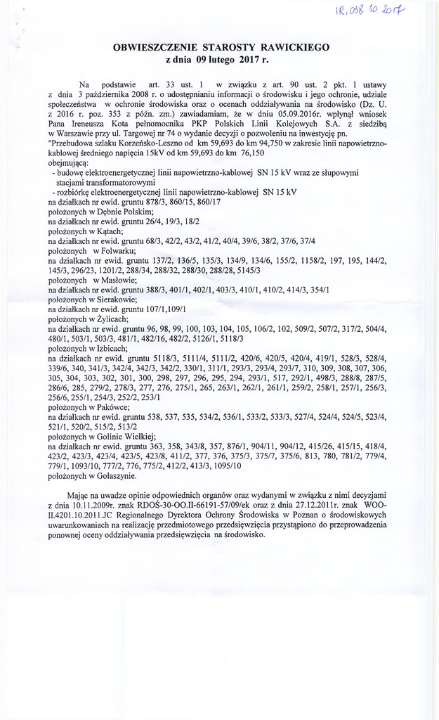 |£,0$ to foip OBWIESZCZENIE STAROSTY RAWICKIEGO z dnia 09 lutego 2017 r. Na podstawie art. 33 ust. 1 w związku z art. 90 ust. 2 pkt. 1 ustawy z dnia 3 października 2008 r. o udostępnianiu informacji o środowisku i jego ochronie, udziale społeczeństwa w ochronie środowiska oraz o ocenach oddziaływania na środowisko (Dz. U. z 2016 r. poz. 353 z późn. zm.) zawiadamiam, że w dniu 05.09.2016r. wpłynął wniosek Pana Ireneusza Kota pełnomocnika PKP Polskich Linii Kolejowych S.A. z siedzibą w Warszawie przy ul. Targowej nr 74 o wydanie decyzji o pozwoleniu na inwestycję pn. "Przebudowa szlaku Korzeńsko-Leszno od km 59,693 do km 94,750 w zakresie linii napowietrznokablowej średniego napięcia 15kV od km 59,693 do km 76,150 obejmującą: - budowę elektroenergetycznej linii napowietrzno-kablowej SN 15 kV wraz ze słupowymi stacjami transformatorowymi - rozbiórkę elektroenergetycznej linii napowietrzno-kablowej SN 15 kV na działkach nr ewid. gruntu 878/3, 860/15, 860/17 położonych w Dębnie Polskim; na działkach nr ewid. gruntu 26/4, 19/3, 18/2 położonych w Kątach; na działkach nr ewid. gruntu 68/3, 42/2, 43/2, 41/2, 40/4, 39/6, 38/2, 37/6, 37/4 położonych w Folwarku; na działkach nr ewid. gruntu 137/2, 136/5, 135/3, 134/9, 134/6, 155/2, 1158/2, 197, 195, 144/2, 145/3, 296/23, 1201/2, 288/34, 288/32, 288/30, 288/28, 5145/3 położonych w Masłowie; na działkach nr ewid. gruntu 388/3, 401/1, 402/1, 403/3, 410/1, 410/2, 414/3, 354/1 położonych w Sierakowie; na działkach nr ewid. gruntu 107/1,109/1 położonych w Żylicach; na działkach nr ewid. gruntu 96, 98, 99, 100, 103, 104, 105, 106/2, 102, 509/2, 507/2, 317/2, 504/4, 480/1, 503/1, 503/3, 481/1, 482/16, 482/2, 5126/1, 5118/3 położonych w Izbicach; na działkach nr ewid. gruntu 5118/3, 5111/4, 5111/2, 420/6, 420/5, 420/4, 419/1, 528/3, 528/4, 339/6, 340, 341/3, 342/4, 342/3, 342/2, 330/1, 311/1, 293/3, 293/4, 293/7, 310, 309, 308, 307, 306, 305, 304, 303, 302, 301, 300, 298, 297, 296, 295, 294, 293/1, 517, 292/1, 498/3, 288/8, 287/5, 286/6, 285, 279/2, 278/3, 277, 276, 275/1, 265, 263/1, 262/1, 261/1, 259/2, 258/1, 257/1, 256/3, 256/6, 255/1, 254/3, 252/2, 253/1 położonych w Pakówce; na działkach nr ewid. gruntu 538, 537, 535, 534/2, 536/1, 533/2, 533/3, 527/4, 524/4, 524/5, 523/4, 521/1,520/2,515/2,513/2 położonych w Golinie Wielkiej; na działkach nr ewid. gruntu 363, 358, 343/8, 357, 876/1, 904/11, 904/12, 415/26, 415/15, 418/4, 423/2, 423/3, 423/4, 423/5, 423/8, 411/2, 377, 376, 375/3, 375/7, 375/6, 813, 780, 781/2, 779/4, 779/1, 1093/10, 777/2, 776, 775/2, 412/2, 413/3, 1095/10 położonych w Gołaszynie. Mając na uwadze opinie odpowiednich organów oraz wydanymi w związku z nimi decyzjami z dnia 10.11.2009r. znak RDOŚ-30-OO.II-66191-57/09/ek oraz z dnia 27.12.201 lr. znak WOO11.4201.10.201 l.JC Regionalnego Dyrektora Ochrony Środowiska w Poznan o środowiskowych uwarunkowaniach na realizację przedmiotowego przedsięwzięcia przystąpiono do przeprowadzenia ponownej oceny oddziaływania przedsięwzięcia na środowisko. Jednocześnie informuję: - o możliwości zapoznania się z dokumentacją sprawy, która jest wyłożona do wglądu w tut. Starostwie - Wydziale Architektury, Budownictwa i Ochrony Środowiska (Rawicz, Wały Dąbrowskiego 2, pok.14, 15, w godzinach pracy urzędu); - o możliwości składania uwag i wniosków w formie pisemnej, ustnie do protokołu, za pomocą środków komunikacji elektronicznej bez konieczności opatrywania ich bezpiecznym podpisem elektronicznym, o którym mowa w ustawie z dnia 18 września 2001 roku o podpisie elektronicznym (Dz. U. z 2013 r. poz. 262 z poźn. zm.) w tutejszym Starostwie - Wydziale Architektury Budownictwa i Ochrony Środowiska (Rawicz, Wały Dąbrowskiego nr 2, pok. 14,15, w godzinach pracy urzędu), w terminie 30 dni od dnia publicznego ogłoszenia; - o pozostawieniu bez rozpatrzenia uwag i wniosków złożonych po upływie w/w terminu; - iż organem właściwym do rozpatrzenia w/w uwag i wniosków będzie Regionalny Dyrektor Ochrony Środowiska w Poznaniu. Podanie obwieszczenia do publicznej wiadomości uważa się za dokonane: - poprzez udostępnienie na stronie Biuletynu Informacji Publicznej Starostwa Powiatowego w Rawiczu; - w sposób zwyczajowo przyjęty (na tablicy ogłoszeń) w siedzibie Starostwa Powiatowego w Rawiczu; - w sposób zwyczajowo przyjęty w siedzibie urzędu Miejskiego w Bojanowie i w miejscu planowanego przedsięwzięcia zgodnie z art. 3 ust. 1 pkt 1 lc, d ww. ustawy z dnia 03 października 2008 r. oraz art. 49 Kpa. - w miejscowości właściwej na przedmiot postępowania - Urząd Miejski w Rawiczu zgodnie z art. 3 ust. 1 pkt l i c ww. ustawy z dnia 03 października2008 r. oraz art. 49 Kpa. z up. Starosty (-) EwaKośmider Naczelnik Wydziału Architektury, Budownictwa i Ochrony Środowiska 1 KZĄl) MlKJSKI GMIWl U \VVICZ Wydział Inwestycji i Rozwoju ul. M arszałka Józefa Piłsudskiego 21 63-900 Rawicz OĄj, tlp\$( *1 hjiUtiCfrO Ka ak