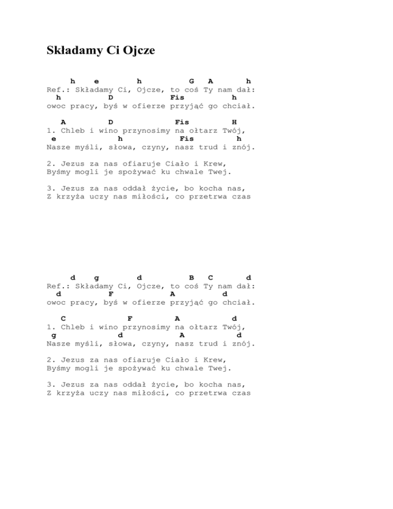 Składamy Ci Ojcze h e h G A h Ref.: Składamy Ci, Ojcze, to coś Ty nam dał: h D Fis h owoc pracy, byś w ofierze przyjąć go chciał. A D Fis H 1. Chleb i wino przynosimy na ołtarz Twój, e h Fis h Nasze myśli, słowa, czyny, nasz trud i znój. 2. Jezus za nas ofiaruje Ciało i Krew, Byśmy mogli je spożywać ku chwale Twej. 3. Jezus za nas oddał życie, bo kocha nas, Z krzyża uczy nas miłości, co przetrwa czas d g d B C d Ref.: Składamy Ci, Ojcze, to coś Ty nam dał: d F A d owoc pracy, byś w ofierze przyjąć go chciał. C F A d 1. Chleb i wino przynosimy na ołtarz Twój, g d A d Nasze myśli, słowa, czyny, nasz trud i znój. 2. Jezus za nas ofiaruje Ciało i Krew, Byśmy mogli je spożywać ku chwale Twej. 3. Jezus za nas oddał życie, bo kocha nas, Z krzyża uczy nas miłości, co przetrwa czas