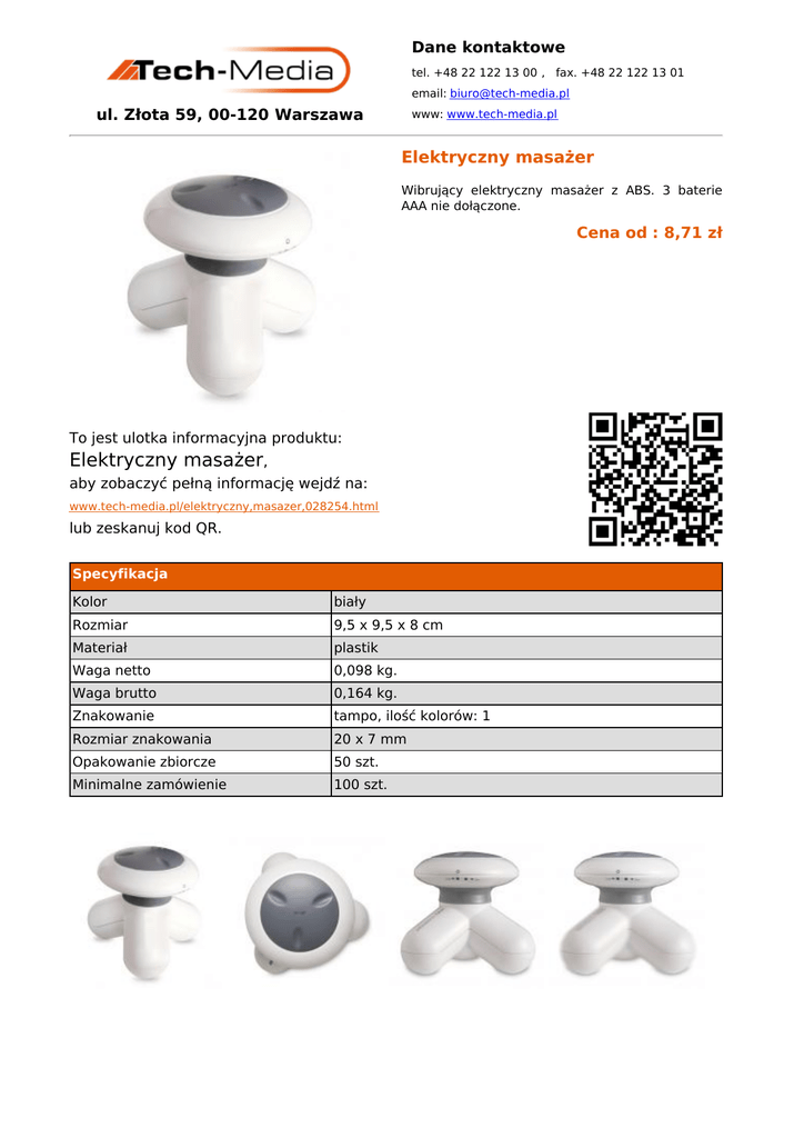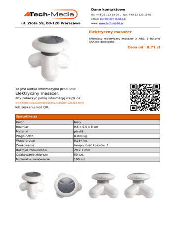 Dane kontaktowe tel. +48 22 122 13 00 , fax. +48 22 122 13 01 email: [email protected] ul. Złota 59, 00-120 Warszawa www: www.tech-media.pl Elektryczny masażer Wibrujący elektryczny masażer z ABS. 3 baterie AAA nie dołączone. Cena od : 8,71 zł To jest ulotka informacyjna produktu: Elektryczny masażer, aby zobaczyć pełną informację wejdź na: www.tech-media.pl/elektryczny,masazer,028254.html lub zeskanuj kod QR. Specyfikacja Kolor biały Rozmiar 9,5 x 9,5 x 8 cm Materiał plastik Waga netto 0,098 kg. Waga brutto 0,164 kg. Znakowanie tampo, ilość kolorów: 1 Rozmiar znakowania 20 x 7 mm Opakowanie zbiorcze 50 szt. Minimalne zamówienie 100 szt.