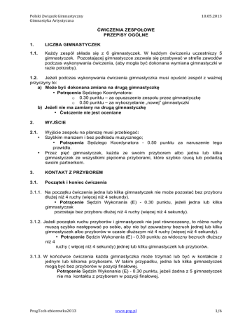 Polski Związek Gimnastyczny Gimnastyka Artystyczna 10.05.2013 ĆWICZENIA ZESPOŁOWE PRZEPISY OGÓLNE 1. LICZBA GIMNASTYCZEK 1.1. Każdy zespół składa się z 6 gimnastyczek. W każdym ćwiczeniu uczestniczy 5 gimnastyczek. Pozostającej gimnastyczce zezwala się przebywać w strefie zawodów podczas wykonywania ćwiczenia, (aby mogła być dokonana wymiana gimnastyczki w razie potrzeby). 1.2. Jeżeli podczas wykonywania ćwiczenia gimnastyczka musi opuścić zespół z ważnej przyczyny to: a) Może być dokonana zmiana na drugą gimnastyczkę • Potrącenia Sędziego Koordynatora: o 0.30 punktu – za opuszczenie zespołu przez gimnastyczkę o 0.50 punktu – za wykorzystanie „nowej” gimnastyczki b) Jeżeli nie ma zamiany na drugą gimnastyczkę • Ćwiczenie nie jest oceniane 2. WYJŚCIE 2.1. • Wyjście zespołu na planszę musi przebiegać: Szybkim marszem i bez podkładu muzycznego; • Potrącenia Sędziego Koordynatora - 0.50 punktu za naruszenie tego prawidła. Przez pięć gimnastyczek, każda ze swoim przyborem albo jedna lub kilka gimnastyczek ze wszystkimi pięcioma przyborami, które szybko rzucą lub podadzą swoim partnerkom. • 3. KONTAKT Z PRZYBOREM 3.1. Początek i koniec ćwiczenia 3.1.1. Na początku ćwiczenia jedna lub kilka gimnastyczek nie może pozostać bez przyboru dłużej niż 4 ruchy (więcej niż 4 sekundy). • Potrącenie Sędzin Wykonania (Е) - 0.30 punktu, jeżeli jedna lub kilka gimnastyczek pozostaje bez przyboru dłużej niż 4 ruchy (więcej niż 4 sekundy). 3.1.2. Jeżeli początek ruchu przyborów i gimnastyczek nie jest równoczesny, to różne ruchy muszą szybko następować po sobie, aby nie był zauważony bezruch jednej lub kilku gimnastyczek albo przyborów w czasie dłuższym niż 4 ruchy (więcej niż 4 sekundy). • Potrącenie Sędzin Wykonania (Е) - 0.30 punktu za widoczny bezruch dłuższy niż 4 ruchy ( więcej niż 4 sekundy) jednej lub kilku gimnastyczek lub przyborów. 3.1.3. W końcówce ćwiczenia każda gimnastyczka może trzymać lub być w kontakcie z jednym lub kilkoma przyborami. W takim przypadku, jedna lub kilka gimnastyczek mogą być bez przyborów w pozycji finałowej. Potrącenie Sędzin Wykonania (Е) - 0.30 punktu, jeżeli żadna z 5 gimnastyczek nie ma kontaktu z przyborem w pozycji finałowej. ProgTech-‐zbiorowka2013 www.pzg.pl 1/6 Polski Związek Gimnastyczny Gimnastyka Artystyczna 10.05.2013 PROGRAM TECHNICZNY DLA ĆWICZEŃ ZESPOŁOWYCH SENIOREK KL.M TRUDNOŚĆ (мax.12 Difficulties; (D) 10.00 punktów maksimum 1.1. Тrudności (D) skoordynowane z Technicznymi elementami Przyboru Маx. 10 Тrudności 5 Тrudności bez wymiany 5 Тrudności z wymianą 1.1.1. Trudności bez wymiany 1.1.2. Trudności z wymianą Wartość: 0.10 0.20 0.30 0.40 0.50 1.2. Kombinacja kroków tanecznych 1.3. Elementy dynamiczne z rzutem i rotacją S (min.1), skoordynowanych z Fundamentalnymi Grupami Technicznymi, specyficznymi dla każdego przyboru, i elementami z pozostałych Grup Technicznych Przyborów Wartość: 0.30 1.4. Elementy współpracy między gimnastyczkami z lub bez Rotacji ciała Мax. 1 Мin. 6 Uczestnictwo: w zawodach maja prawo startu zawodniczki urodzone w roku 1997 i starsze posiadające minimum klasę I Punktacja: w wieloboju (suma ocen z dwóch wykonań) i w poszczególnych układach (bez finałów) OBOWIĄZUJĄCE PRZYBORY 2013 10 3 2 2014 10 3 2 2015 5 6 2 2016 5 6 2 ProgTech-‐zbiorowka2013 www.pzg.pl 2/6 Polski Związek Gimnastyczny Gimnastyka Artystyczna 10.05.2013 PROGRAM TECHNICZNY DLA ĆWICZEŃ ZESPOŁOWYCH JUNIOREK Kl.I Trudność (мax.12 Difficulties;(D) 8.00 punktów maksimum Тrudności (D) skoordynowane z Technicznymi elementami Przyboru Маx. 8 Тrudności 4 Тrudności bez wymiany 4 Тrudności z wymianą Trudności bez wymiany Trudności z wymianą Wartość: 0.10 0.20 0.30 0.40 0.50 Uczestnictwo: Kombinacja kroków tanecznych S (min.1), skoordynowanych z Fundamentalnymi Grupami Technicznymi, specyficznymi dla każdego przyboru, i elementami z pozostałych Grup Technicznych Przyborów Wartość: 0.30 Elementy dynamiczne z rzutem i rotacją Elementy współpracy między gimnastyczkami z lub bez Rotacji ciała Мax. 1 Мin. 6 w zawodach maja prawo startu zawodniczki urodzone w roku 2000, 1999, 1998 i młodsze posiadające minimum klasę II I Punktacja: w wieloboju (suma ocen z dwóch wykonań) i w poszczególnych układach (bez finałów) OBOWIĄZUJĄCE PRZYBORY 2013 5 2014 5 2015 5 ProgTech-‐zbiorowka2013 www.pzg.pl 3/6 Polski Związek Gimnastyczny Gimnastyka Artystyczna 10.05.2013 PROGRAM TECHNICZNY DLA ĆWICZEŃ ZESPOŁOWYCH JUNIOREK MŁODSZYCH KL.II Trudność (D) 8.00 punktów maksimum Тrudności (D) skoordynowane z Technicznymi elementami Przyboru Маx. 8 Тrudności 4 Тrudności bez wymiany 4 Тrudności z wymianą Trudności bez wymiany Trudności z wymianą Wartość: 0.10 0.20 0.30 0.40 0.50 Uczestnictwo: Kombinacja kroków tanecznych S (min.1), skoordynowanych z Fundamentalnymi Grupami Technicznymi, specyficznymi dla każdego przyboru, i elementami z pozostałych Grup Technicznych Przyborów Wartość: 0.30 Elementy dynamiczne z rzutem i rotacją Elementy współpracy między gimnastyczkami z lub bez Rotacji ciała Мax. 1 Мin. 5 w zawodach maja prawo startu zawodniczki urodzone w roku 2001, 2002 i młodsze posiadające minimum kl III I Punktacja: w wieloboju (suma ocen z dwóch wykonań) i w poszczególnych układach (bez finałów) OBOWIĄZUJĄCE PRZYBORY 2013 12 2014 6 2015 6 ProgTech-‐zbiorowka2013 www.pzg.pl 4/6 Polski Związek Gimnastyczny Gimnastyka Artystyczna 10.05.2013 PROGRAM TECHNICZNY DLA ĆWICZEŃ ZESPOŁOWYCH MŁODZICZEK KL.III Trudność (D) 6.00 punktów maksimum Тrudności (D) skoordynowane z Technicznymi elementami Przyboru Маx. 6 Тrudności 3 Тrudności bez wymiany 3 Тrudności z wymianą Trudności bez wymiany Trudności z wymianą Wartość: 0.10 0.20 0.30 0.40 0.50 Max 3 Kombinacja kroków tanecznych S (min.1), skoordynowanych z Fundamen