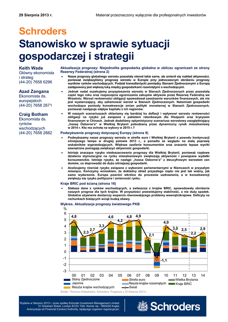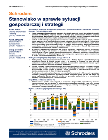 Materiał przeznaczony wyłącznie dla profesjonalnych inwestorów 29 Sierpnia 2013 r. Schroders Stanowisko w sprawie sytuacji gospodarczej i strategii Keith Wade Główny ekonomista i strateg (44-20) 7658 6296 Azad Zangana Aktualizacja prognozy: Niejednolita gospodarka globalna w obliczu ograniczeń ze strony Rezerwy Federalnej (strona 2) Nasze prognozy globalnego wzrostu pozostały niemal takie same, ale zmienił się rozkład aktywności, ponieważ zwiększyliśmy prognozę wzrostu w Europie przy jednoczesnym obniżeniu prognozy wyników rynków wschodzących. Podział transatlantycki pomiędzy Stanami Zjednoczonymi a Europą zastępowany jest większą luką między gospodarkami rozwiniętymi a wschodzącymi. Jednak nadal oczekujemy przyspieszenia wzrostu w Stanach Zjednoczonych przez pozostałą część tego roku oraz rozpoczęcia ograniczania zakupów aktywów przez Rezerwę Federalną we Wrześniu. Wzrost rentowności obligacji spowodował zaostrzenie warunków finansowych, ale nie jest wystarczający, aby zahamować wzrost w Stanach Zjednoczonych. Natomiast gospodarki wschodzące poniosły konsekwencje zmian polityki monetarnej w Stanach Zjednoczonych, ponieważ następuje odpływ kapitału z ich regionów. W naszych scenariuszach skłaniamy się bardziej ku deflacji i wpływowi wzrostu rentowności obligacji na ryzyko już związane z pakietem ratunkowym dla Hiszpanii oraz kryzysem finansowym w Chinach. Jednak dodaliśmy optymistyczny scenariusz wzrostowy uwzględniający „hossę Osborne’a” w Wielkiej Brytanii pobudzaną przez dynamiczny rynek mieszkaniowy w 2014 r. Kto ma ochotę na wybory w 2015 r.? • • Ekonomista ds. europejskich (44-20) 7658 2671 Craig Botham • Ekonomista ds. rynków wschodzących (44-20) 7658 2882 Podwyższenie prognozy dotyczącej Europy (strona 9) Podwyższamy nasze prognozy wzrostu w strefie euro i Wielkiej Brytanii z powodu kontynuacji silniejszego tempa w drugiej połowie 2013 r., a ponadto ze względu na stałą poprawę wskaźników wyprzedzających. Większe zaufanie konsumentów oraz znacznie lepsze wyniki zewnętrzne pomagają zwiększyć aktywność gospodarki. Istnieje znaczące ryzyko niedoszacowania prognozy dla Wielkiej Brytanii, ponieważ rządowe działania stymulacyjne na rynku mieszkaniowym zwiększają aktywność i powiązane wydatki konsumenckie. Istnieje ryzyko, że nastąpi „hossa Osborne’a” z dwucyfrowym wzrostem cen domów, co doprowadzi do dużo silniejszej gospodarki. Analizujemy również ryzyko związane z wyborami parlamentarnymi w Niemczech w przyszłym miesiącu. Kończymy wnioskiem, że dokładny skład przyszłego rządu nie jest tak ważny, jak samo wydarzenie. Europa powróci wkrótce do procesów uzdrawiania, a w konsekwencji zwiększy się ryzyko polityczne i zmienność rynku. • • • Kraje BRIC pod ścianą (strona 16) Słabsze dane z rynków wschodzących, a zwłaszcza z krajów BRIC, spowodowały obniżenie naszych prognoz dla tych krajów. W przyszłości przewidujemy stabilność, a nie duży spadek. Globalne ożywienie dostarczy wsparcia równoważącego problemy wewnątrzkrajowe. Deficyty na rachunkach bieżących wciąż budzą obawy. • Wykres. Aktualizacja prognozy światowego PKB % 6 5 4.8 4,8 4,6 4.6 4 2,3 2.3 3 2.7 2,7 4.2 4,2 4.9 4.8 4,9 4,8 4.0 4,0 3.3 3,3 3.0 3,0 2,5 2.5 2.1 2,1 2.9 2,9 2.2 2,2 2 1 0 -1 -1.1 -1,1 -2 -3 00 01 02 03 04 05 Stany Zjednoczone US JaponiaJapan Reszta Rest krajówofwschodzących emerging 06 07 08 09 10 Strefa euro Eurozone Reszta rozwiniętych Rest ofkrajów advanced Świat World Źródło: Thomson Datastream, Schroders. Prognoza z 23 Sierpnia 2013 r. Wydane w Sierpniu 2013 r. przez spółkę Schroder Investment Management Limited. 31 Gresham Street, Londyn EC2V 7QA. Numer rej.: 1893220 Anglia. Autoryzacja od Financial Conduct Authority, będącego organem regulacyjnym. 11 12 13 14 Wielka UK Brytania BRICS Kraje BRIC Materiał przeznaczony wyłącznie dla profesjonalnych inwestorów 29 Sierpnia 2013 r. Aktualizacja prognozy: Niejednolita gospodarka globalna w obliczu ograniczeń ze strony Rezerwy Federalnej Europa przyczynia się ponownie do wzrostu na świecie, Wzrost na rynkach rozwiniętych poprawił się w drugim kwartale roku: rynek amerykański wciąż rośnie, a produkcja w strefie euro zwiększa się po sześciu kolejnych kwartałach spadku aktywności. Podobnie jak w przypadku poprzednich wzrostów Niemcy i gospodarki krajów rdzenia Europy zajmowały czołowe pozycje pod względem wyników, natomiast we Włoszech i w Hiszpanii wciąż występowały spadki. Jednak w ogólnym ujęciu szerzej pojmowana gospodarka europejska w połączeniu z silnym odbiciem w Wielkiej Brytanii ponownie przyczynia się do globalnej aktywności (patrz wykres 1). Wykres 1. Ożywienie na rynku globalnym — dotychczasowy przebieg Indeks (100 = IV kw. 2007 r.) 106 Stany Zjednoczone 104 Niemcy 102 100 Strefa euro 98 Wielka Brytania 96 94 Hiszpania 92 90 2008 Włochy 2009 2010 2011 2012 2013 Źródło: Thomson Reuters Datastream, 28 Sierpnia 2013 r. ...ale rynki wschodzące hamują poprawę Jednak szerszy obraz globalnej aktywności jest w większym stopniu niejednolity, ponieważ wyniki na rynkach wschodzących nie dorównały poprawie sytuacji na rynkach rozwiniętych. Na przykład globalny indeks PMI wzrósł w Lipcu i zasygnalizował poprawę aktywności globalnej, przy czym najlepsze wyniki uzyskały Stany Zjednoczone i Europa, natomiast kraje BRIC i Meksyk doświadczyły spadku złożonego indeksu PMI. W konsekwencji obserwujemy rozbieżność pomiędzy zagregowanym globalnym indeksem PMI a jego odpowiednikiem na rynkach wschodzących (patrz wykres 2). Wykres 2. Rozbieżność: indeks PMI na rynkach rozwiniętych i wschodzących Indeks 60 55 50 45 40 35 30 2006 2007 2008 Źródło: Markit, Schroders. 23 Sierpnia 2013 r. 2 Wydane w Sierpniu 2013 r. przez spółkę Schroder Investment Management Limited. 31 Gresham Street, Londyn EC2V 7QA. Numer rej.: 1893220 Anglia.