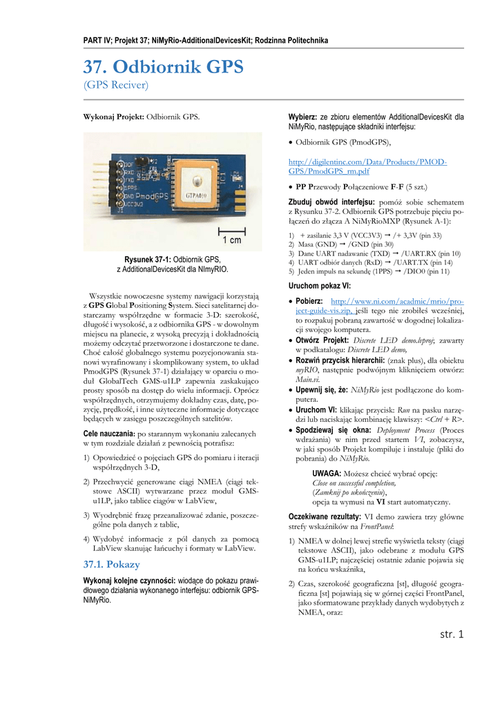 PART IV; Projekt 37; NiMyRio-AdditionalDevicesKit; Rodzinna Politechnika 37. Odbiornik GPS (GPS Reciver) Wykonaj Projekt: Odbiornik GPS. Wybierz: ze zbioru elementów AdditionalDevicesKit dla NiMyRio, następujące składniki interfejsu: Odbiornik GPS (PmodGPS), http://digilentinc.com/Data/Products/PMODGPS/PmodGPS_rm.pdf PP Przewody Połączeniowe F-F (5 szt.) Zbuduj obwód interfejsu: pomóż sobie schematem z Rysunku 37-2. Odbiornik GPS potrzebuje pięciu połączeń do złącza A NiMyRioMXP (Rysunek A-1): Rysunek 37-1: Odbiornik GPS, z AdditionalDevicesKit dla NImyRIO. 1) 2) 3) 4) 5) + zasilanie 3,3 V (VCC3V3) /+ 3,3V (pin 33) Masa (GND) /GND (pin 30) Dane UART nadawanie (TXD) /UART.RX (pin 10) UART odbiór danych (RxD) /UART.TX (pin 14) Jeden impuls na sekundę (1PPS) /DIO0 (pin 11) Uruchom pokaz VI: Wszystkie nowoczesne systemy nawigacji korzystają z GPS Global Positioning System. Sieci satelitarnej dostarczamy współrzędne w formacie 3-D: szerokość, długość i wysokość, a z odbiornika GPS - w dowolnym miejscu na planecie, z wysoką precyzją i dokładnością możemy odczytać przetworzone i dostarczone te dane. Choć całość globalnego systemu pozycjonowania stanowi wyrafinowany i skomplikowany system, to układ PmodGPS (Rysunek 37-1) działający w oparciu o moduł GlobalTech GMS-u1LP zapewnia zaskakująco prosty sposób na dostęp do wielu informacji. Oprócz współrzędnych, otrzymujemy dokładny czas, datę, pozycję, prędkość, i inne użyteczne informacje dotyczące będących w zasięgu poszczególnych satelitów. Cele nauczania: po starannym wykonaniu zalecanych w tym rozdziale działań z pewnością potrafisz: 1) Opowiedzieć o pojęciach GPS do pomiaru i iteracji współrzędnych 3-D, 2) Przechwycić generowane ciągi NMEA (ciągi tekstowe ASCII) wytwarzane przez moduł GMSu1LP, jako tablice ciągów w LabView, Pobierz: http://www.ni.com/acadmic/mrio/project-guide-vis.zip, jeśli tego nie zrobiłeś wcześniej, to rozpakuj pobraną zawartość w dogodnej lokalizacji swojego komputera. Otwórz Projekt: Discrete LED demo.lvproj; zawarty w podkatalogu: Discrete LED demo, Rozwiń przycisk hierarchii: (znak plus), dla obiektu myRIO, następnie podwójnym kliknięciem otwórz: Main.vi. Upewnij się, że: NiMyRio jest podłączone do komputera. Uruchom VI: klikając przycisk: Run na pasku narzędzi lub naciskając kombinację klawiszy: <Ctrl + R>. Spodziewaj się okna: Deployment Process (Proces wdrażania) w nim przed startem VI, zobaczysz, w jaki sposób Projekt kompiluje i instaluje (pliki do pobrania) do NiMyRio. UWAGA: Możesz chcieć wybrać opcję: Close on successful completion, (Zamknij po ukończeniu), opcja ta wymusi na VI start automatyczny. 3) Wyodrębnić frazę przeanalizować zdanie, poszczególne pola danych z tablic, Oczekiwane rezultaty: VI demo zawiera trzy główne strefy wskaźników na FrontPanel: 4) Wydobyć informacje z pól danych za pomocą LabView skanując łańcuchy i formaty w LabView. 1) NMEA w dolnej lewej strefie wyświetla teksty (ciągi tekstowe ASCII), jako odebrane z modułu GPS GMS-u1LP; najczęściej ostatnie zdanie pojawia się na końcu wskaźnika, 37.1. Pokazy Wykonaj kolejne czynności: wiodące do pokazu prawidłowego działania wykonanego interfejsu: odbiornik GPSNiMyRio. 2) Czas, szerokość geograficzna [st], długość geograficzna [st] pojawiają się w górnej części FrontPanel, jako sformatowane przykłady danych wydobytych z NMEA, oraz: str. 1 3) NMEA pola danych (prawa strona) z $GPRMC (Recommended Minimum Navigation Information). Znajdź czas letni i wprowadzić tę wartość do kontroli strefy czasowej. Na przykład, czas strefy wschodniej w Stanach Zjednoczonych jest – (5) pięć godzin na Za- Rysunek 37-2: Układ pokazowy Projekt: Odbiornik GPS, schemat ideowy, proponowane połączenia. Uruchom demoVI, masz szansę zobaczyć nowy komunikat z NMEA pojawiający się raz na sekundę. Na ColdStart odbiornik GPS GMS-u1LP, wymaga około minuty do rozpoczęcia generowania prawidłowych informacji; w tym czasie wskaźniki "1PPS" zarówno na FrontPanel jak i na NiMyRio LED0 zaczną migać. Należy pamiętać, że pochmurna pogoda, zakłócenia obszarami zabudowanymi mogą pogarszać warunki i zwiększać czas przetwarzania odbiornika, aby uzyskać poprawkę od wystarczającej liczby satelitów. Jeśli masz akumulator dla NiMyRio i komputer mobilny możesz obserwować wskazania przenosząc się do lepszych lokalizacji. Jak dobrze dopasować prędkość przemieszczania się po gruncie? Widzisz wskazania długości i szerokości geograficznej, zmieniają się wartość? chód od uniwersalnego czasu koordynowanego (UTC) oznaczonego dla PrimeMeridian, przecinającej Greenwich w Anglii. Porównaj wartość wskaźnika czasu (lewy górny róg) z oficjalnym czasem prowadzonego przez NIST Narodowy Instytut Standardów i Technologii: http://nist.time.gov. Czy można zauważyć jakąś różnicę? Kliknij przycisk: Stop lub wybierz z klawiatury komputera przycisk <Esc>, aby zatrzymać VI i zresetować NiMyRio; reset spowoduje powrót NiMyRio do trybu początkowego, czyli ustawień początkowych. W stanie reset, do pamięci układu nie muszą być wpisane same str. 2 zera lub same jedynki w rejestrach, reset - to powrót układu do stanu początkowego. Wskazówki dotyczące rozwiązywania problemów: nie widzisz oczekiwanych rezultatów? Potwierdź prawdziwość poniższych zdarzeń: LED wskazująca poprawność zasilania w NiMyRio świeci jaskrawym światłem, Przycisk Run, na pasku narzędzi jest czarny, co oznacza, że VI jest w RunMode - trybie pracy, Złącze A MXP i jego końcówki, zapewniają odpowiednie przypisanie styków, Odbiornik GPS jest prawidłowo połączony z NiMyRio UART do wejścia Recive do odbiornika GPS wyjście Transmit; potwierdź poprawność połączeń zasilacza. 37.2. Teoria interfejsu Obwód interfejsu: GlobalTech GMS-u1LP jest samodzielnym modułem GPS z wbudowaną anteną. Moduł GPS generuje