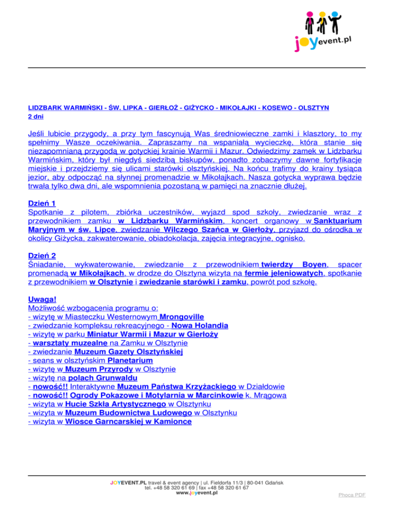 LIDZBARK WARMIŃSKI - ŚW. LIPKA - GIERŁOŻ - GIŻYCKO - MIKOŁAJKI - KOSEWO - OLSZTYN 2 dni Jeśli lubicie przygody, a przy tym fascynują Was średniowieczne zamki i klasztory, to my spełnimy Wasze oczekiwania. Zapraszamy na wspaniałą wycieczkę, która stanie się niezapomnianą przygodą w gotyckiej krainie Warmii i Mazur. Odwiedzimy zamek w Lidzbarku Warmińskim, który był niegdyś siedzibą biskupów, ponadto zobaczymy dawne fortyfikacje miejskie i przejdziemy się ulicami starówki olsztyńskiej. Na końcu trafimy do krainy tysiąca jezior, aby odpocząć na słynnej promenadzie w Mikołajkach. Nasza gotycka wyprawa będzie trwała tylko dwa dni, ale wspomnienia pozostaną w pamięci na znacznie dłużej. Dzień 1 Spotkanie z pilotem, zbiórka uczestników, wyjazd spod szkoły, zwiedzanie wraz z przewodnikiem zamku w Lidzbarku Warmińskim, koncert organowy w Sanktuarium Maryjnym w św. Lipce, zwiedzanie Wilczego Szańca w Gierłoży, przyjazd do ośrodka w okolicy Giżycka, zakwaterowanie, obiadokolacja, zajęcia integracyjne, ognisko. Dzień 2 Śniadanie, wykwaterowanie, zwiedzanie z przewodnikiem twierdzy Boyen, spacer promenadą w Mikołajkach, w drodze do Olsztyna wizyta na fermie jeleniowatych, spotkanie z przewodnikiem w Olsztynie i zwiedzanie starówki i zamku, powrót pod szkołę. Uwaga! Możliwość wzbogacenia programu o: - wizytę w Miasteczku Westernowym Mrongoville - zwiedzanie kompleksu rekreacyjnego - Nowa Holandia - wizytę w parku Miniatur Warmii i Mazur w Gierłoży - warsztaty muzealne na Zamku w Olsztynie - zwiedzanie Muzeum Gazety Olsztyńskiej - seans w olsztyńskim Planetarium - wizytę w Muzeum Przyrody w Olsztynie - wizytę na polach Grunwaldu - nowość!! Interaktywne Muzeum Państwa Krzyżackiego w Działdowie - nowość!! Ogrody Pokazowe i Motylarnia w Marcinkowie k. Mrągowa - wizyta w Hucie Szkła Artystycznego w Olsztynku - wizyta w Muzeum Budownictwa Ludowego w Olsztynku - wizyta w Wiosce Garncarskiej w Kamionce JOYEVENT.PL travel & event agency | ul. Fieldorfa 11/3 | 80-041 Gdańsk tel. +48 58 320 61 69 | fax +48 58 320 61 67 www.joyevent.pl Phoca PDF Cena: od 216 PLN (przy grupie min. 45 os.) Cena zawiera: zakwaterowanie w ośrodku w pobliżu Giżycka, pokoje 3-5 osobowe, łazienki na korytarzu (WC, umywalka, prysznic), wyżywienie zgodne z programem, przejazd autokarem klasy turystycznej, opieka i pomoc pilota / reprezentanta biura, usługi przewodnickie, podatek VAT. Bilety wstępu do zwiedzanych obiektów płatne dodatkowo – 38 zł / os. Program imprezy jest ramowy, kolejność zwiedzania może ulec zmianie. Planujesz zorganizować klasową wycieczkę „z klasą”? Szukasz transportu, przewodnika, pilota, programu wycieczki? Nasze biuro podróży z przyjemnością Ci w tym pomoże. Joytrip.pl to organizator wycieczek szkolnych nastawiony przede wszystkim na satysfakcję klientów. W ramach turystyki szkolnej oferujemy autorskie programy wyjazdów szkolnych, zielonych szkół, biwaków i wycieczek krajoznawczych. Najchętniej wybierane przez naszych klientów programy i regiony to: Kraków, Warszawa, Lwów, Praga, Łeba, Zakopane, Poznań, Mazury, Pomorze, Bieszczady, Tatry, Szlak Piastowski, Pomorze. Podróżujemy zawsze bezpiecznie autokarem, busem lub pociągiem. Każda z naszych wycieczek daje możliwość aktywnego wypoczynku, naturalnego poszerzenia wiedzy uczniów i ich integracji przez zabawę, której tak często brakuje w dobie intensywnej komputeryzacji. mapa strony kontakt my i nasi ludzie referencje polityka prywatności BIURO PODRÓŻY JOYTRIP.PL Fieldorfa 11/3 Organizujemy: Wpis do Rejestru Wycieczki Organizatorów Szkolne Turystyki i Wyjazdy dla JOYEVENT.PL travel & event agency | ul. Fieldorfa 11/3 | 80-041 Gdańsk tel. +48 58 320 61 69 | fax +48 58 320 61 67 www.joyevent.pl Phoca PDF 80-041 Gdańsk Biuro: 0048 58 320 61 69 Faks: 0048 58 320 61 66 Jakub Ryfa 0048 609 294 066 [email protected] grup Pobyt na Pomorzu Turystyka aktywna serwis turystyczny Pośredników Turystycznych Marszałka Województwa Pomorskie nr 275 Copyright © 2015 JOY event. Wszystkie prawa zastrzeżone. Projekt i wykonanie: dwakroki.com JOYEVENT.PL travel & event agency | ul. Fieldorfa 11/3 | 80-041 Gdańsk tel. +48 58 320 61 69 | fax +48 58 320 61 67 www.joyevent.pl Phoca PDF