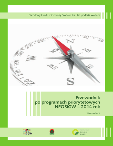 Narodowy Fundusz Ochrony Środowiska i Gospodarki Wodnej Przewodnik po programach priorytetowych NFOŚiGW – 2014 rok Warszawa 2013 Skutecznie i efektywnie wspieramy działania na rzecz środowiska. NFOŚiGW – lider systemu finansowania ochrony środowiska i gospodarki wodnej nastawiony na EFEKT. Poprawa stanu środowiska i zrównoważone gospodarowanie jego zasobami przez stabilne, skuteczne i efektywne wspieranie przedsięwzięć i inicjatyw służących środowisku. Misja, wizja i cel generalny NFOŚiGW sformułowane w „Strategii działania NFOŚiGW na lata 2013-2016 z perspektywą do 2020 r.” Narodowy Fundusz Ochrony Środowiska i Gospodarki Wodnej Przewodnik po programach priorytetowych NFOŚiGW – 2014 rok Ochrona i zrównoważone gospodarowanie zasobami wodnymi Racjonalne gospodarowanie odpadami i ochrona powierzchni ziemi Ochrona atmosfery Ochrona różnorodności biologicznej i funkcji ekosystemów Programy międzydziedzinowe Spis treści 1. 1.1. 1.2. 2. 2.1. Wprowadzenie, kilka słów o NFOŚiGW 7 Strategia działania NFOŚiGW na lata 2013-2016 z perspektywą do 2020 r. 7 Programy priorytetowe 8 Oferta programowa NFOŚiGW na rok 2014 8 Ochrona i zrównoważone gospodarowanie zasobami wodnymi 11 Gospodarka wodno-ściekowa w aglomeracjach 13 Budowa, przebudowa i odbudowa obiektów hydrotechnicznych 13 Racjonalne gospodarowanie odpadami i ochrona powierzchni ziemi 15 Racjonalna gospodarka odpadami 17 2.2. Ochrona powierzchni ziemi 18 2.3. Geologia i geozagrożenia 19 2.4. Zmniejszenie uciążliwości wynikających z wydobycia kopalin 20 3. 3.1. Ochrona atmosfery 21 Poprawa jakości powietrza – PROJEKT 24 24 3.2. Poprawa efektywności energetycznej – PROJEKT 3.3. Wspieranie rozproszonych, odnawialnych źródeł energii 26 3.4. System zielonych inwestycji (GIS – Green Investment Scheme) 28 4. 4.1. 5. Ochrona różnorodności biologicznej i funkcji ekosystemów 31 Ochrona obszarów i gatunków cennych przyrodniczo 33 Programy międzydziedzinowe 35 37 5.1. Wsparcie Ministra Środowiska w zakresie realizacji polityki ekologicznej państwa 5.2. Zadania wskazane przez ustawodawcę 37 5.3. Wspieranie działalności monitoringu środowiska 38 5.4. Przeciwdziałanie zagrożeniom środowiska z likwidacją ich skutków 39 5.5. Edukacja ekologiczna 39 5.6. Współfinansowanie LIFE+ 40 5.7. SYSTEM – Wsparcie działań ochrony środowiska i gospodarki wodnej realizowanych przez WFOŚiGW 40 5.8. Wsparcie przedsiębiorców w zakresie niskoemisyjnej i zasobooszczędnej gospodarki 42 5.9. Gekon – Generator Koncepcji Ekologicznych 43 Przewodnik po programach priorytetowych NFOŚiGW – 2014 rok 5 6 www.nfosigw.gov.pl Przewodnik po programach priorytetowych NFOŚiGW – 2014 rok Rolą Przewodnika po programach priorytetowych jest prezentacja w skróconej formie oferty programowej NFOŚiGW na rok 2014. W Przewodniku opisano pokrótce zakres poszczególnych programów priorytetowych, wskazano potencjalnych beneficjentów programu, tryb składania wniosków oraz formę i warunki dofinansowania. Programy zawarte w Przewodniku są zgodne z Listą priorytetowych programów przyjętą przez Radę Nadzorczą w dniu 21 maja 2013 roku i zawierają całą ofertę finansową NFOŚiGW, w tym również programy, w ramach których w roku 2014 nie będą prowadzone nabory wniosków, lecz podpisywane umowy o dofinansowanie dla projektów zgłoszonych w ramach naborów przeprowadzonych w roku 2013. Przewodnik będzie dostępny w formie elektronicznej na stronie www.nfosigw.gov.pl. Na tej stronie znajdują się również szczegółowe informacje o prowadzonych przez NFOŚiGW konkursach oraz naborach ciągłych, a także wymagania dotyczące naborów wniosków o dofinansowanie. Wprowadzenie, kilka słów o NFOŚiGW Narodowy Fundusz Ochrony Środowiska i Gospodarki Wodnej (NFOŚiGW), wspólnie z wojewódzkimi funduszami ochrony środowiska i gospodarki wodnej, jako niezależne podmioty prawne, stanowią system finansowania ochrony środowiska w Polsce. Narodowy Fundusz, który w roku 2014 będzie obchodził jubileusz 25 lat funkcjonowania, jest źródłem finansowania przedsięwzięć ekologicznych, głównie o charakterze ponadregionalnym. Natomiast 16 wojewódzkich funduszy od 20 lat wspiera finansowanie ochrony środowiska na poziomie regionalnym. Podstawą działania Narodowego Funduszu jest ustawa Prawo ochrony środowiska. Aktualnie najważniejszym zadaniem Narodowego Funduszu jest efektywne i sprawne wykorzystanie środków z Unii Europejskiej (w tym Programu Operacyjnego Infrastruktura i Środowisko) oraz w ramach Norweskiego Mechanizmu Finansowego i Mechanizmu Finansowego Europejskiego Obszaru Gospodarczego, Krajowego Systemu zielonych inwestycji (GIS – Green Investment Scheme) oraz Instrumentu finansowego LIFE+. Głównym celem wdrażanych przez Narodowy Fundusz programów priorytetowych jest rozbudowa i modernizacja infrastruktury ochrony środowiska i gospodarki wodnej w naszym kraju. Wdrażanie projektów ekologicznych, które uzyskały lub uzyskają wsparcie finansowe ze środków zagranicznych oraz dofinansowanie tych przedsięwzięć ze środków Narodowego Funduszu będzie służyło osiągnięciu założonych efektów ekologicznych, wynikających z podjętych przez Polskę zobowiązań międzynarodowych. Strategia działania NFOŚiGW na lata 2013-2016 z perspektywą do 2020 r. Strategia NFOŚiGW ma na celu określenie roli oraz zadań NFOŚiGW do 2016 roku, z wyznaczeniem planowanych do podjęcia działań do roku 2020. Zdefiniowane w Strategii kierunki, za pomocą wsparcia finansowego udzielanego przez Narodowy Fundusz, mają przyczynić się do poprawy stanu środowiska, ze szczególnym uwzględnieniem projektów współfinansowanych ze środków Unii Europejskiej. Zakłada się, iż w okresie realizacji Strategii NFOŚiGW priorytetem stanie się finansowanie przedsięwzięć stanowiących innowacyjne rozwiązania w zakresie ochrony środowiska i gospodarki wodnej. Strategia działa