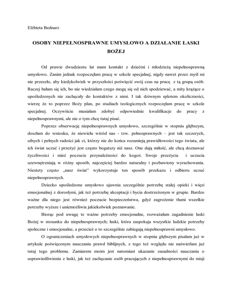 Elżbieta Bednarz OSOBY NIEPEŁNOSPRAWNE UMYSŁOWO A DZIAŁANIE ŁASKI BOŻEJ Od prawie dwudziestu lat mam kontakt z dziećmi i młodzieżą niepełnosprawną umysłowo. Zanim jednak rozpoczęłam pracę w szkole specjalnej, nigdy nawet przez myśl mi nie przeszło, aby kiedykolwiek w przyszłości poświęcić swój czas na pracę z tą grupą osób. Raczej bałam się ich, bo nie wiedziałam czego mogę się od nich spodziewać, a mity krążące o upośledzonych nie zachęcały do kontaktów z nimi. I tak dziwnym splotem okoliczności, wierzę że to poprzez Boży plan, po studiach teologicznych rozpoczęłam pracę w szkole specjalnej. Oczywiście musiałam zdobyć odpowiednie kwalifikacje do pracy z niepełnosprawnymi, ale nie o tym chcę tutaj pisać. Poprzez obserwację niepełnosprawnych umysłowo, szczególnie w stopniu głębszym, doszłam do wniosku, że niewielu wśród nas - tzw. pełnosprawnych – jest tak szczerych, ufnych i pełnych radości jak ci, którzy nie do końca rozumieją prawidłowości tego świata, ale ich świat uczuć i przeżyć jest często bogatszy niż nasz. One dają miłość, ale chcą doznawać życzliwości i mieć poczucie przynależności do kogoś. Swoje przeżycia i uczucia uzewnętrzniają w różny sposób, najczęściej bardzo naturalny i pozbawiony wyrachowania. Niestety często „nasz świat” wykorzystuje ten sposób przekazu i odbioru uczuć niepełnosprawnych. Dziecko upośledzone umysłowo ujawnia szczególnie potrzebę stałej opieki i więzi emocjonalnej z dorosłymi, jak też potrzebę akceptacji i bycia dostrzeżonym w grupie. Bardzo ważne dla niego jest również poczucie bezpieczeństwa, gdyż zagrożenie tłumi wszelkie potrzeby wyższe i uniemożliwia jakiekolwiek poznawanie. Biorąc pod uwagę te ważne potrzeby emocjonalne, rozważałam zagadnienie łaski Bożej w stosunku do niepełnosprawnych; łaski, która zaspokaja wszystkie ludzkie potrzeby społeczne i emocjonalne, a przecież o to szczególnie zabiegają niepełnosprawni umysłowo. O ograniczeniach umysłowych niepełnosprawnych w stopniu głębszym pisałam już w artykule poświęconym nauczaniu prawd biblijnych, z tego też względu nie naświetlam już tutaj tego problemu. Zamiarem moim jest natomiast ukazanie zasadności nauczania o usprawiedliwieniu z łaski, jak też zachęcanie osób pracujących z niepełnosprawnymi do misji ewangelizacyjnej wśród nich i poprowadzenia ich do podjęcia decyzji o przyjęciu łaski Bożej, która zaspokoi wielki głód miłości i akceptacji. Rozważając zagadnienie łaski należy wprowadzić etymologię tego słowa. W polskim przekładzie greckie charis odnosi się do łaski, uprzejmości, życzliwości, przychylności1. W Nowym Testamencie łaska oznacza w istocie coś darowanego, nieodpłatnego. Słowa dorean (darmo) i charis (łaska) są wg Rz 3,24 synonimami2. Dorean odpowiada hebrajskiemu chinnam, które wywodzi się z tego samego rdzenia, co hebrajski odpowiednik charis – chen (życzliwość, przychylność). Poniżej przedstawionych zostanie kilka przykładów ze Starego Testamentu, gdzie zastosowane jest słowo łaska w szerokim znaczeniu. Noe zyskał życzliwość Pana (Rdz 6,8)3; Jakub starał się zjednać przychylność Ezawa (Rdz 32,5-6). Czynem łaski było okazywanie życzliwości ubogim (Prz 14,31). Podobnie Psalmy zapewniają o łaskawości Bożej, której wyrazem jest wysłuchiwanie modlitw, przywracanie zdrowia (Ps 41,4), ratowanie uciśnionych (Ps 9,14), przebaczanie grzechów, obrona słabych. Liczne starotestamentowe obietnice mają swoje źródło w łaskawości Bożej. Tak więc już w Starym Testamencie łaska uchodzi za coś w zasadzie nieodpłatnego4. Łaska ukazana jest w Nowym Testamencie jako dar, który ze względu na Chrystusa zostaje dany wierzącemu i tylko jemu. Ta łaska staje się cechą Boga, jednym z przymiotów Boskiej doskonałości. Wolna, nadrzędna, niezasłużona łaska Boża z miłości do człowieka grzesznego i winnego objawia się w przebaczeniu grzechów i wybawieniu od kary wiecznej. W tekstach Pawłowych łaska oznacza przychylność Bożą okazywaną grzesznikom w Jezusie Chrystusie. Poganie potępieni jako grzesznicy uzyskali dostęp do społeczności z łaski (Rz 3,24) oraz dzięki darowi łaski (Rz 5,15; Ga 2,17-21). U apostoła Pawła łaska jest przeciwieństwem czynu: Jeżeli zaś dzięki łasce, to już nie ze względu na uczynki, bo inaczej łaska nie byłaby już łaską (Rz 11,6). Paweł podkreśla wolny dar łaski Bożej, czyli inicjatywę Boga w sprawie łaski. Teologia reformacyjna sformułowała naukę, iż Bóg usprawiedliwia grzesznika nie pod warunkiem jakiejś poprzedzającej sprawiedliwości człowieka, lecz czyni to z własnej inicjatywy. Oznacza to, iż usprawiedliwienie jest wyłącznie dziełem Boga. Boże usprawiedliwienie nie oznacza faktycznego uczynienia wierzącego człowieka sprawiedliwym w jego empirycznej rzeczywistości, ale znaczy uznanie go za sprawiedliwego. 1 Słownik grecko-polski, red. Z. Abramowiczówna, Warszawa 1965, t. 4, s. 598. Por. The Greek New Testament Dictionary, Stuttgart 1983. 3 Pisownia skrótów biblijnych wg Biblii Tysiąclecia, Warszawa 1980; cytaty biblijne wg: Biblia to jest Pismo Święte Starego i Nowego Testamentu. Nowy Przekład, Warszawa 1994. 4 Por. C. J. Roetzel, Łaska w: Encyklopedia biblijna, red. P. J. Achtemeier, Warszawa 1999, s. 698. 2 W nauce św. Augustyna łaska nieodparta, łac. gratio irresistibilis, nie jest związana ze spełnieniem określonych warunków, lecz jest udzielana bezwarunkowo jako dar5. Łaska jako sposób postępowania Boga wobec grzesznika jest całkowicie niezależna od kwestii ludzkich zasług. Łaska nie polega ani na traktowaniu człowieka tak, jak on na to zasługuje, ani też na traktowaniu go lepiej, niż wynika to z jego zasług – pisze L. S. Chafer. Polega ona na takim postępowaniu wobec człowieka, które jest pozbawione jakichkolwiek odniesień do rezultatów je