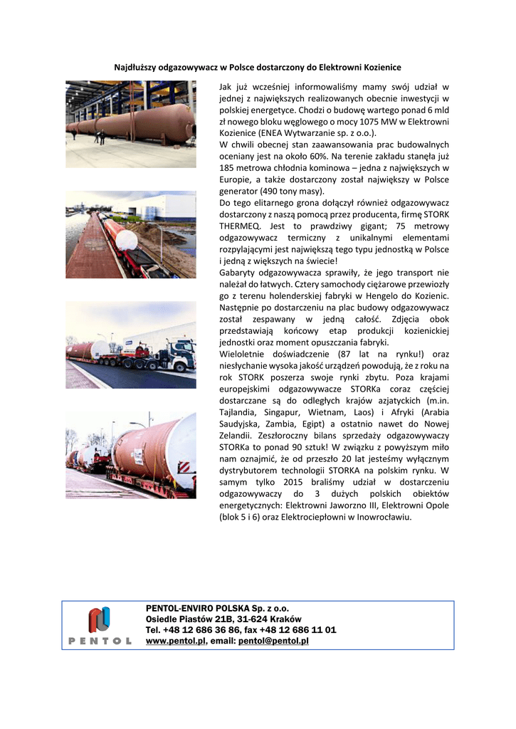 Najdłuższy odgazowywacz w Polsce dostarczony do Elektrowni Kozienice Jak już wcześniej informowaliśmy mamy swój udział w jednej z największych realizowanych obecnie inwestycji w polskiej energetyce. Chodzi o budowę wartego ponad 6 mld zł nowego bloku węglowego o mocy 1075 MW w Elektrowni Kozienice (ENEA Wytwarzanie sp. z o.o.). W chwili obecnej stan zaawansowania prac budowalnych oceniany jest na około 60%. Na terenie zakładu stanęła już 185 metrowa chłodnia kominowa – jedna z największych w Europie, a także dostarczony został największy w Polsce generator (490 tony masy). Do tego elitarnego grona dołączył również odgazowywacz dostarczony z naszą pomocą przez producenta, firmę STORK THERMEQ. Jest to prawdziwy gigant; 75 metrowy odgazowywacz termiczny z unikalnymi elementami rozpylającymi jest największą tego typu jednostką w Polsce i jedną z większych na świecie! Gabaryty odgazowywacza sprawiły, że jego transport nie należał do łatwych. Cztery samochody ciężarowe przewiozły go z terenu holenderskiej fabryki w Hengelo do Kozienic. Następnie po dostarczeniu na plac budowy odgazowywacz został zespawany w jedną całość. Zdjęcia obok przedstawiają końcowy etap produkcji kozienickiej jednostki oraz moment opuszczania fabryki. Wieloletnie doświadczenie (87 lat na rynku!) oraz niesłychanie wysoka jakość urządzeń powodują, że z roku na rok STORK poszerza swoje rynki zbytu. Poza krajami europejskimi odgazowywacze STORKa coraz częściej dostarczane są do odległych krajów azjatyckich (m.in. Tajlandia, Singapur, Wietnam, Laos) i Afryki (Arabia Saudyjska, Zambia, Egipt) a ostatnio nawet do Nowej Zelandii. Zeszłoroczny bilans sprzedaży odgazowywaczy STORKa to ponad 90 sztuk! W związku z powyższym miło nam oznajmić, że od przeszło 20 lat jesteśmy wyłącznym dystrybutorem technologii STORKA na polskim rynku. W samym tylko 2015 braliśmy udział w dostarczeniu odgazowywaczy do 3 dużych polskich obiektów energetycznych: Elektrowni Jaworzno III, Elektrowni Opole (blok 5 i 6) oraz Elektrociepłowni w Inowrocławiu. PENTOL-ENVIRO POLSKA Sp. z o.o. Osiedle Piastów 21B, 31-624 Kraków Tel. +48 12 686 36 86, fax +48 12 686 11 01 www.pentol.pl, email: [email protected]