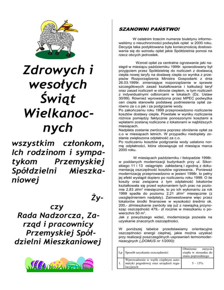 SZANOWNI PAŃSTWO! W ostatnim trzecim numerze biuletynu informowaliśmy o nieuchronności podwyżek opłat w 2000 roku. Decyzja taka podyktowana była koniecznością dostosowania się do wzrostu opłat jakie Spółdzielnia ponosi na rzecz obcych jednostek. Zdrowych i wesołych Świąt Wielkanocnych wszystkim członkom, Ich rodzinom i sympatykom Przemyskiej Spółdzielni Mieszkaniowej Życzy Rada Nadzorcza, Zarząd i pracownicy Przemyskiej Spółdzielni Mieszkaniowej Wzrost opłat za centralne ogrzewanie jaki nastąpił w miesiącu październiku 1999r. spowodowany był przyjęciem przez Spółdzielnię do rozliczeń z dostawcą ciepła nowej taryfy na dostawę ciepła co wynika z przepisów Rozporządzenia Ministra Gospodarki z dnia 26.03.1999r. zmieniające rozporządzenie w sprawie szczegółowych zasad kształtowania i kalkulacji taryf oraz zasad rozliczeń w obrocie ciepłem, w tym rozliczeń z indywidualnymi odbiorcami w lokalach (Dz. Ustaw 30/99). Również wprowadzona przez MPEC podwyżka cen ciepła stanowiła podstawę podniesienia opłat zarówno za c.o jak i za podgrzanie wody. Po zakończeniu roku 1999 przeprowadzono rozliczenie kosztów dostawy ciepła. Powstałe w wyniku rozliczenia różnice pomiędzy faktycznie ponoszonymi kosztami a wpłatami zostaną rozliczone z lokatorami w najbliższych miesiącach. Nadpłata zostanie zwrócona poprzez obniżenie opłat za c.o w miesiącach letnich. W przypadku niedopłaty zostanie zwiększona odpłatność za c.o. Po rozliczeniu kosztów podgrzania wody ustalono normę odpłatności, która obowiązuje od miesiąca marca 2000 roku. W miesiącach październiku i listopadzie 1998r. w poddanych modernizacji budynkach przy ul. Sikorskiego 11 i 13 osiągnięto zakładaną i zgodną z dokumentacją oszczędność kosztów ogrzewania.. Ponieważ modernizację przeprowadzono w jesieni 1998r. to pełny jej efekt wystąpił dopiero po rozliczeniu roku 1999. O ile koszty oraz związana z tym odpłatność lokatorów kształtowała się przed wykonaniem tych prac na poziomie 2,83 zł/m2 miesięcznie, to po ich wykonaniu za rok 1999 spadła do poziomu 2,21 zł/m2 miesięcznie (z uwzględnieniem nadpłaty). Zainwestowane więc przez lokatorów środki finansowe w wysokości średnio ok. 200,- zł/mieszkanie zwróciły się już z nawiązką przynosząc oszczędność 479,- zł rocznie w mieszkaniu o powierzchni 50 m2. Jak z powyższego widać, modernizacja pozwala na uzyskanie znacznych oszczędności. W poniższej tabelce przedstawiamy orientacyjne oszczędności energii cieplnej, jakie można uzyskać przy realizacji poszczególnych usprawnień termomodernizacyjnych („DOMUS nr 1/2000): Lp Sposób uzyskania oszczędności 1. Wprowadzenie w węźle cieplnym automatyki pogodowej oraz urządzeń regulacyjnych Obniżenie zużycia ciepła w stosunku do stanu poprzedniego 5 – 15% 2. 3. 4. 5. 6. 7. Wprowadzenie hermetyzacji instalacji i izolowanie przewodów, przeprowadzenie regulacji hydraulicznej i zamontowanie zaworów termostatycznych we wszystkich pomieszczeniach Wprowadzenie podzielników kosztów Wprowadzenie ekranów zagrzejnikowych Uszczelnienie okien i drzwi zewnętrznych Wymiana okien na 3-szybowe ze szkłem specjalnym Ocieplenie zewnętrznych przegród budowlanych (ścian, dachu, stropodachu) ZADŁUZENIE CZYNSZOWE i za WODĘ ok. 10% ok. 2 – 5% 3 – 5% 10 – 15% 10 – 25% *** Zróżnicowanie temperatury w pomieszczeniach Centralna regulacja temperatury powoduje przegrzanie bądź niedogrzanie niektórych pomieszczeń, a tym samym straty cieplne lub dyskomfort lokatora. W wyniku zastosowania termostatów grzejnikowych istnieje możliwość utrzymywania zróżnicowanej temperatury w poszczególnych pomieszczeniach. Zaleca się - także ze względów zdrowotnych - następujące temperatury: kuchnia 20OC Piwnica 8°10°C pokój dzienny 20"C *** 10 – 20% pomieszczenie czasowo nieużywane 8OC przedpokój 16OC sypialnia łazienka 16OC 25OC Pamiętaj, że dla utrzymania zróżnicowanej temperatury w poszczególnych pomieszczeniach należy zamykać pomiędzy nimi drzwi. Niemniej ważne niż różnicowanie temperatury w poszczególnych pomieszczeniach, jest jej różnicowanie w czasie. Wyjeżdżając na weekend lub urlop wystarczy obniżyć temperaturę do około + 8OC, aby uzyskać istotne oszczędności. Obniżanie temperatury na noc oraz przed wyjściem do pracy również przynosi efekty. Pamiętaj, że zmniejszenie temperatury tylko o 1OC powoduje – w danym czasie – zmniejszenie zużycia ciepła o 6 – 10%. *** Z dniem 1 marca 2000r. Zarząd Miasta Uchwałą Nr 14/2000 z dnia 28.02.2000r. podwyższył odpłatność za zużycie wody do kwoty 3,37 zł/m3 brutto ( netto 3,15 zł/m3 z tego: pobór wody 1,60 zł, odprowadzenie ścieków 1,55 zł). Natomiast w budynku przy ul. Ofiar Katynia odpłatność za zużycie wody podwyższona została do wysokości 4,16 zł/m3 (netto 1,60 zł/m3 za pobór wody i 2,29 zł/m3 za odprowadzenie ścieków) Zadłużenie za opłaty czynszowe i za wodę na dzień 31.12.1999r. wynosi ogółem 1.660.656,- zł, z tego: - zadłużenie za wodę 264.865,- zł - zadłużenie czynszowe 1.395.791,- zł. i w rozbiciu na poszczególne osiedla przedstawia się następująco: Osiedle KMIECIE zadłużenie ogółem 248.243 zł liczba Wysokość zadłużenia ilość m-cy zadłużonych zadłużenia woda czynsz woda czynsz 1 345 236 6.712,- zł 22.717,- zł 2 51 76 3.510,- zł 31.784,- zł 3 38 25 3.270,- zł 17.397,- zł 4 17 18 2.399,- zł 15.675,- zł 5 11 12 2.017,- zł 15.929,- zł pow. 5 31 30 13.321,- zł 113.512,- zł razem 493 397 31.229,-zł 217.014,- zł Osiedle SALEZJAŃSKIE zadłużenie ogółem 315.559 zł. ilość m-cy zadłużenia 1 2 3 4 5 pow. 5 razem liczba zadłużonych woda czynsz 346 213 38 74 32 38 11 7 12 9 39 35 478 376 Wysokość zadłużenia woda 9.277 3.518 3.679 1.431 4.375 33.608 55.888 czynsz 28.112 30.485 28.444 6.127 9.830 156.674 259.672 Osiedle ROGOZIŃSKIEGO zadłużenie ogółem 492.78