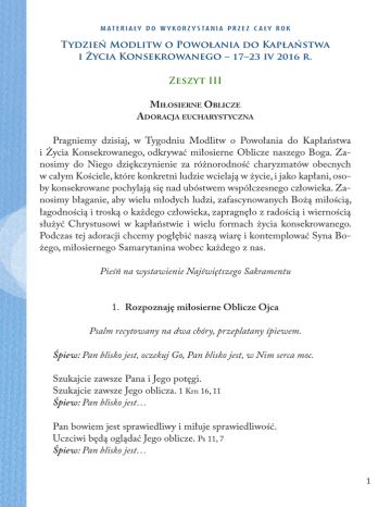 M A T E R I A ŁY D O W Y K O R Z Y S T A N I A P R Z E Z C A ŁY R O K Tydzień Modlitw o Powołania do Kapłaństwa i Życia Konsekrowanego – 17–23 iv 2016 r. Zeszyt III Miłosierne Oblicze Adoracja eucharystyczna Pragniemy dzisiaj, w Tygodniu Modlitw o Powołania do Kapłaństwa i Życia Konsekrowanego, odkrywać miłosierne Oblicze naszego Boga. Zanosimy do Niego dziękczynienie za różnorodność charyzmatów obecnych w całym Kościele, które konkretni ludzie wcielają w życie, i jako kapłani, osoby konsekrowane pochylają się nad ubóstwem współczesnego człowieka. Zanosimy błaganie, aby wielu młodych ludzi, zafascynowanych Bożą miłością, łagodnością i troską o każdego człowieka, zapragnęło z radością i wiernością służyć Chrystusowi w kapłaństwie i wielu formach życia konsekrowanego. Podczas tej adoracji chcemy pogłębić naszą wiarę i kontemplować Syna Bożego, miłosiernego Samarytanina wobec każdego z nas. Pieśń na wystawienie Najświętszego Sakramentu 1. Rozpoznaję miłosierne Oblicze Ojca Psalm recytowany na dwa chóry, przeplatany śpiewem. Śpiew: Pan blisko jest, oczekuj Go, Pan blisko jest, w Nim serca moc. Szukajcie zawsze Pana i Jego potęgi. Szukajcie zawsze Jego oblicza. 1 Krn 16, 11 Śpiew: Pan blisko jest… Pan bowiem jest sprawiedliwy i miłuje sprawiedliwość. Uczciwi będą oglądać Jego oblicze. Ps 11, 7 Śpiew: Pan blisko jest… 1 Rozjaśnij swe oblicze nad Twym sługą, Wybaw mnie w łaskawości swojej! Ps 31, 17 Śpiew: Pan blisko jest… Odnów nas, Boże, i rozjaśnij nad nami oblicze swoje, A będziemy zbawieni. Ps 80, 4 Śpiew: Pan blisko jest… Szczęśliwy naród, który umie wielbić Pana, Będzie kroczył w świetle Twego oblicza. Ps 89, 16 Śpiew: Pan blisko jest… Szukajcie Pana i Jego mocy, Zawsze szukajcie oblicza Jego. Ps 105, 4 Śpiew: Pan blisko jest… Z Ewangelii według św. Łukasza (Łk 10, 21-22) W tej właśnie chwili Jezus rozradował się w Duchu Świętym i powiedział: „Wysławiam Cię, Ojcze, Panie nieba i ziemi, że ukryłeś to przed mądrymi i roztropnymi, a objawiłeś tym, którzy są jak małe dzieci! Tak, Ojcze, bo tak się Tobie spodobało. Mój Ojciec przekazał Mi wszystko i nikt nie wie, kim jest Syn, tylko Ojciec, ani kim jest Ojciec, tylko Syn i ten, komu Syn zechce objawić”. Komentarz: Jezus z Nazaretu swoimi słowami, gestami i całą swoją osobą objawia Oblicze miłosiernego Boga. Syna Bożego obecnego w Najświętszym Sakramencie poproszę, aby pomógł mi rozpoznać Oblicze miłosiernego Ojca w moim życiu. Mogę skorzystać z następujących pytań: • Jakie Oblicze Boga Ojca jest obecne w moim życiu? • Kiedy mogę powiedzieć, że doświadczyłem Go jako wewnętrzną obecność? • W jakich momentach tęsknię za Obliczem Boga? • Jakie imię przypisałbym teraz Bogu? • Jak On się do mnie zwraca? Dłuższa chwila na osobistą refleksję Śpiew: Abba, Ojcze 2. Rozpoznaję miłosierne oblicze drugiego człowieka Z Ewangelii według św. Łukasza (Łk 10, 30-37) „Pewien człowiek schodził z Jeruzalem do Jerycha i wpadł w ręce bandytów. Oni go obrabowali, pobili i zostawiając ledwie żywego, odeszli. Przypadkiem schodził tą drogą pewien kapłan. Gdy go zobaczył, ominął go z daleka. Podobnie i lewita, gdy przyszedł na to miejsce i zobaczył go, ominął go z daleka. Pewien zaś Samarytanin, będąc w drodze, przechodził obok niego. A gdy go ujrzał, ulitował się, podszedł i opatrzył jego rany, zalewając je oliwą i winem. Potem wsadził go na swoje juczne zwierzę, zawiózł do gospody i opiekował się nim. Nazajutrz wyjął dwa denary, dał gospodarzowi i powiedział: «Opiekuj się nim, a jeśli wydasz więcej, oddam ci, gdy będę wracał». Jak sądzisz, który z tych trzech okazał się bliźnim napadniętego przez bandytów?”. On odpowiedział: „Ten, który okazał mu miłosierdzie”. Jezus powiedział do niego: „Idź i ty czyń podobnie”. Komentarz: „Przypowieść o miłosiernym Samarytaninie (…) wskazuje, jaki winien być stosunek każdego z nas do cierpiących bliźnich. Nie wolno nam ich «mijać», przechodzić mimo z obojętnością, ale winniśmy przy nich «zatrzymywać się». Miłosiernym Samarytaninem jest każdy człowiek, który zatrzymuje się przy cierpieniu drugiego człowieka, jakiekolwiek by ono było. Owo zatrzymanie się nie oznacza ciekawości, ale gotowość. Jest to otwarcie jakiejś wewnętrznej dyspozycji serca, które ma także swój wyraz uczuciowy”. „Kontemplujemy oblicze Jezusa, Boskiego Samarytanina, leczącego dusze i ciała. Idąc za przykładem swego Boskiego Założyciela, Kościół «ze stulecia w stulecie (...) wciąż od nowa pośród ogromnej rzeszy chorych i cierpiących pisze ewangeliczną przypowieść o miłosiernym Samarytaninie, objawiając i przekazując uzdrawiającą i pocieszającą miłość Jezusa Chrystusa. Czyni to poprzez świadectwo zakonnego życia oddanego służbie chorym». (…) Przykład Chrystusa Dobrego Samarytanina winien kształtować postawę 3 chrześcijanina, skłaniając go, aby stawał się bliźnim cierpiących braci i sióstr, okazując im szacunek, zrozumienie, akceptację, dobroć, współczucie i bezinteresowność. Trzeba walczyć z obojętnością, która każe jednostkom i społecznościom zamykać się we własnym egoizmie”. ( Jan Paweł II) • W jaki sposób patrzę na drugiego człowieka? Jak mogę lepiej zaangażować moją inteligencję, uczucia, czas, siły fizyczne, aby pomóc osobom potrzebującym mojego miłosierdzia? Dłuższa chwila na osobistą refleksję Śpiew: Misericordias Domini in aeternum cantabo 3. Rozpoznaję oblicze powołania otrzymanego we Chrzcie Świętym Z Listu św. Pawła do Kolosan (Kol 3, 12-15) Jako wybrańcy Boga – święci i umiłowani – okryjcie się głębokim miłosierdziem, łagodnością, pokorą, delikatnością, cierpliwością. Żyjcie ze sobą w zgodzie i przebaczajcie sobie wzajemni