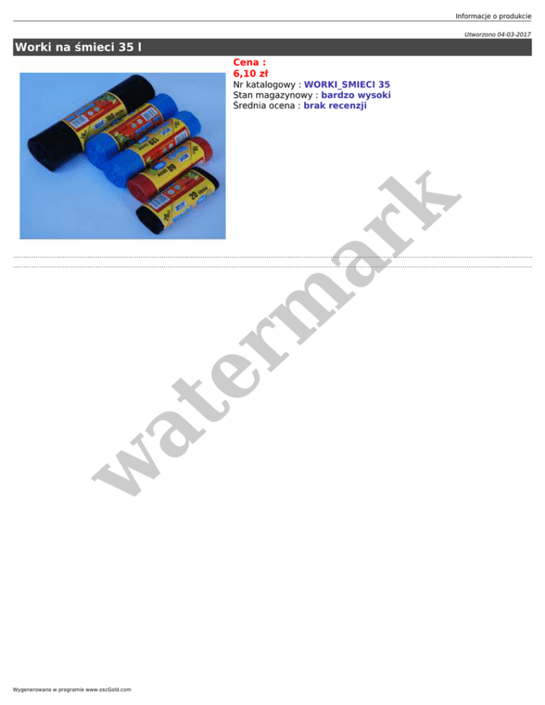 Informacje o produkcie Utworzono 04-03-2017 Worki na śmieci 35 l Cena : 6,10 zł w at er m ar k Nr katalogowy : WORKI_SMIECI 35 Stan magazynowy : bardzo wysoki Średnia ocena : brak recenzji Wygenerowano w programie www.oscGold.com