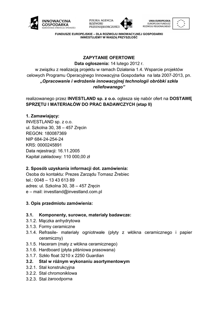 FUNDUSZE EUROPEJSKIE – DLA ROZWOJU INNOWACYJNEJ GOSPODARKI INWESTUJEMY W WASZĄ PRZYSZŁOŚĆ ZAPYTANIE OFERTOWE Data ogłoszenia: 14 lutego 2012 r. w związku z realizacją projektu w ramach Działania 1.4. Wsparcie projektów celowych Programu Operacyjnego Innowacyjna Gospodarka na lata 2007-2013, pn. „Opracowanie i wdrożenie innowacyjnej technologii obróbki szkła reliefowanego” realizowanego przez INVESTLAND sp. z o.o. ogłasza się nabór ofert na DOSTAWĘ SPRZĘTU I MATERIAŁÓW DO PRAC BADAWCZYCH (etap II) 1. Zamawiający: INVESTLAND sp. z o.o. ul. Szkolna 30, 38 – 457 Zręcin REGON: 180087369 NIP 684-24-254-24 KRS: 0000245891 Data rejestracji: 16.11.2005 Kapitał zakładowy: 110 000,00 zł 2. Sposób uzyskania informacji dot. zamówienia: Osoba do kontaktu: Prezes Zarządu Tomasz Źrebiec tel.: 0048 – 13 43 613 89 adres: ul. Szkolna 30, 38 – 457 Zręcin e – mail: [email protected] 3. Opis przedmiotu zamówienia: 3.1. 3.1.2. 3.1.3. 3.1.4. 3.1.5. 3.1.6. 3.1.7. 3.2. 3.2.1. 3.2.2. 3.2.3. Komponenty, surowce, materiały badawcze: Mączka anhydrytowa Formy ceramiczne Refrasile- materiały ogniotrwałe (płyty z włókna ceramicznego i papier ceramiczny) Haceram (maty z włókna ceramicznego) Hardboard (płyta pilśniowa prasowana) Szkło float 3210 x 2250 Guardian Stal w różnym wykonaniu asortymentowym Stal konstrukcyjna Stal chromoniklowa Stal żaroodporna FUNDUSZE EUROPEJSKIE – DLA ROZWOJU INNOWACYJNEJ GOSPODARKI INWESTUJEMY W WASZĄ PRZYSZŁOŚĆ Pełna Specyfikacja Istotnych Warunków Zamówienia, przedstawiająca szczegółową charakterystykę przedmiotu zamówienia dostępna jest w siedzibie Firmy. Prosimy o kontakt w celu jej udostępnienia drogą elektroniczną, pocztową lub poprzez odbiór osobisty. 4. Terminy dostawy: Do 7 dni od dnia podpisania umowy dostawy. 5. Kryteria oceny ofert: a) Cena – 100% 6. Miejsce i termin składania ofert: a) Adres: ul. Szkolna 30, 38 – 457 Zręcin b) Termin: do 21 lutego 2012r. c) Oferty w formie pisemnej należy składać osobiście lub drogą pocztową na adres siedziby spółki „INVESTLAND Sp. z o.o., ul. Szkolna 30, 38-457 Zręcin. Oferta powinna zostać umieszczona w zamkniętej kopercie, na której będą znajdować się dane adresowe oferenta, zleceniodawcy oraz adnotacja: „Konkurs ofert na dostawę sprzętu i materiałów do prac badawczych- etap II. Nie otwierać przed dniem 21.02.2012r., godz. 12.00.” 7. Pozostałe informacje: a) Oferty należy składać na dostawę wszystkich w/w sprzętów i materiałów b) Oferty muszą zawierać: - datę sporządzenia, podpis i pieczęć - cenę całkowitą brutto oraz netto oraz ceny brutto i netto poszczególnych sprzętów/materiałów - termin ważności oferty - warunki i termin płatności d) Nie dopuszcza się składania ofert cząstkowych e) Nie dopuszcza się składania ofert warunkowych i wariantowych f) Wszelkie koszty związane z udziałem Oferenta w niniejszym postępowaniu ponosi Oferent. g) Wybór dostawców nastąpi w oparciu o najbardziej korzystne ekonomicznie oferty w oparciu o punkt 5 niniejszego ogłoszenia – Kryteria oceny ofert, z zachowaniem zasad jawności, przejrzystości i uczciwej konkurencji. Z poważaniem Zarząd INVESTLAND Sp. z o.o.