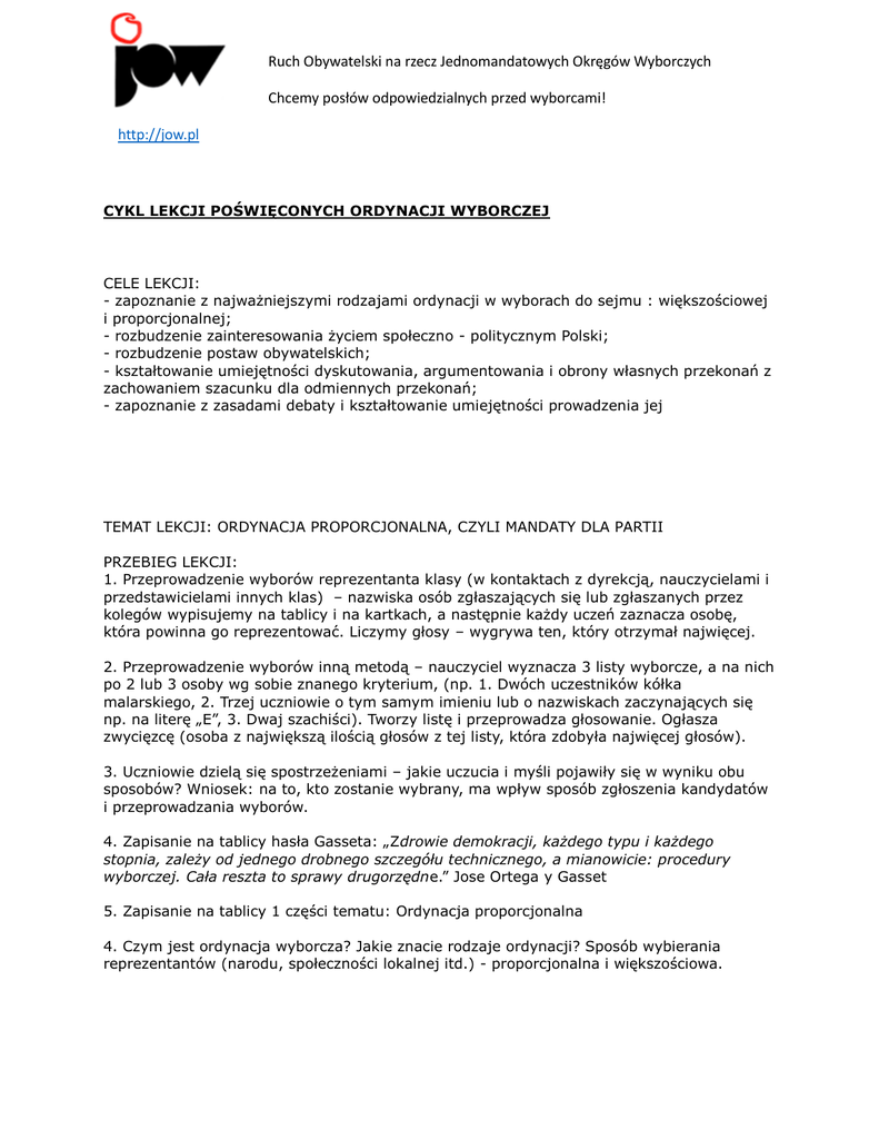 Ruch Obywatelski na rzecz Jednomandatowych Okręgów Wyborczych Chcemy posłów odpowiedzialnych przed wyborcami! http://jow.pl CYKL LEKCJI POŚWIĘCONYCH ORDYNACJI WYBORCZEJ CELE LEKCJI: - zapoznanie z najważniejszymi rodzajami ordynacji w wyborach do sejmu : większościowej i proporcjonalnej; - rozbudzenie zainteresowania życiem społeczno - politycznym Polski; - rozbudzenie postaw obywatelskich; - kształtowanie umiejętności dyskutowania, argumentowania i obrony własnych przekonań z zachowaniem szacunku dla odmiennych przekonań; - zapoznanie z zasadami debaty i kształtowanie umiejętności prowadzenia jej TEMAT LEKCJI: ORDYNACJA PROPORCJONALNA, CZYLI MANDATY DLA PARTII PRZEBIEG LEKCJI: 1. Przeprowadzenie wyborów reprezentanta klasy (w kontaktach z dyrekcją, nauczycielami i przedstawicielami innych klas) – nazwiska osób zgłaszających się lub zgłaszanych przez kolegów wypisujemy na tablicy i na kartkach, a następnie każdy uczeń zaznacza osobę, która powinna go reprezentować. Liczymy głosy – wygrywa ten, który otrzymał najwięcej. 2. Przeprowadzenie wyborów inną metodą – nauczyciel wyznacza 3 listy wyborcze, a na nich po 2 lub 3 osoby wg sobie znanego kryterium, (np. 1. Dwóch uczestników kółka malarskiego, 2. Trzej uczniowie o tym samym imieniu lub o nazwiskach zaczynających się np. na literę „E”, 3. Dwaj szachiści). Tworzy listę i przeprowadza głosowanie. Ogłasza zwycięzcę (osoba z największą ilością głosów z tej listy, która zdobyła najwięcej głosów). 3. Uczniowie dzielą się spostrzeżeniami – jakie uczucia i myśli pojawiły się w wyniku obu sposobów? Wniosek: na to, kto zostanie wybrany, ma wpływ sposób zgłoszenia kandydatów i przeprowadzania wyborów. 4. Zapisanie na tablicy hasła Gasseta: „Zdrowie demokracji, każdego typu i każdego stopnia, zależy od jednego drobnego szczegółu technicznego, a mianowicie: procedury wyborczej. Cała reszta to sprawy drugorzędne.” Jose Ortega y Gasset 5. Zapisanie na tablicy 1 części tematu: Ordynacja proporcjonalna 4. Czym jest ordynacja wyborcza? Jakie znacie rodzaje ordynacji? Sposób wybierania reprezentantów (narodu, społeczności lokalnej itd.) - proporcjonalna i większościowa. Ruch Obywatelski na rzecz Jednomandatowych Okręgów Wyborczych Chcemy posłów odpowiedzialnych przed wyborcami! http://jow.pl 5. Jaka ordynacja obowiązuje w wyborach do sejmu w Polsce? (proporcjonalna) Jak przebiegają wybory? - duże okręgi wyborcze (ok. 1 mln mieszkańców) – kilka mandatów z okręgu; - rejestracja KW partii lub KWW; - zebranie 5 tys. podpisów w okręgu (21 okręgów, żeby zarejestrować cały kraj) i ich rejestracja; - ustalenie przez zarząd partii miejsc na listach (duże znaczenie pozycji na liście partyjnej oraz znanych w całym kraju nazwisk); - prowadzenie kampanii w mediach – za pomocą haseł i dyskusji – prezentowanie programu partii; - przekroczenie w wyborach progu poparcia 5%; - przeliczenie głosów metodą d'Hondta – centralna instytucja Państwowa Komisja Wyborcza – głosy liczy się i przelicza na mandaty za zamkniętymi drzwiami (sposób przeliczania – załącznik nr1) - rozdzielenie mandatów. 6. Obecna ordynacja nazywana jest proporcjonalną. Co to oznacza? (wyjaśnienie, że chodzi o proporcje między ilością mandatów poselskich danej partii a uzyskanym w wyborach poparciem). Specyficzną odmianą ordynacji proporcjonalnej jest ordynacja mieszana, w której również partie decydują o wystawieniu kandydatów do sejmu. 7. Zapisanie drugiej części tematu: ...czyli mandaty dla partii. 8. Co to są partie polityczne? Jakie role pełnią w polskim życiu politycznym? (Definicja ze Słownika polityki lub podobnego źródła) Ilu mają członków? (Ok. 290 tys. , czyli 1% obywateli Polski) 9. Rekapitulacja: Na czym polegają wybory w ordynacji proporcjonalnej? 8. Zadanie domowe: Co powinien zrobić lokalny działacz – filantrop, aktywista, chcący zostać posłem? Ruch Obywatelski na rzecz Jednomandatowych Okręgów Wyborczych Chcemy posłów odpowiedzialnych przed wyborcami! http://jow.pl Załącznik 1. METODA D’HONDTA. Przykład przeliczenia poparcia uzyskanego w wyborach na ilość mandatów poselskich dla poszczególnych ugrupowań W okręgu wyborczym, w którym głosowało 500.000 wyborców, a do obsadzenia jest 8 mandatów poselskich, uzyskano następujące wyniki: Partia A – 150.000 głosów Partia B – 70.000 Partia C – 80.000 Partia D – 100.000 Partia E – 100.000 – partia E w skali kraju nie przekroczyła 5% poparcia, więc nie uzyska żadnego mandatu. Uzyskane wyniki partii A,B,C i D dzielimy przez kolejne liczby naturalne: 1,2,3,4,5...: partia A B C D E ilość uzyskanyh głosów 150,000 70,000 80,000 100,000 100,000 Ilość głosów : 1 150,000 70,000 80,000 100,000 Ilość głosów : 2 75,000 35,000 40,000 50,000 Ilość głosów : 3 50,000 23,333 26,667 33,333 Z otrzymanych wyników dzielenia wybieramy 8 najwyższych (tyle liczb, ilu ma być posłów z tego okręgu): 1. 150.000 (partia A) 2. 100.000 (D) 3. 80.000 (C) 4. 75.000 (A) 5. 70.000 (B) 6. 50.000 (A) 7. 50.000 (D) 8. 40.000 (C) partia A B C D E ilość uzyskanych głosów 150,000 70,000 80,000 100,000 100,000 Ilość głosów : 1 150,000 70,000 80,000 100,000 Ruch Obywatelski na rzecz Jednomandatowych Okręgów Wyborczych Chcemy posłów odpowiedzialnych przed wyborcami! http://jow.pl Ilość głosów : 2 75,000 35,000 40,000 50,000 Ilość głosów : 3 ilość uzyskanych mandatów 50,000 23,333 26,667 33,333 3 1 2 2 0 Partia A uzyskała 3 mandaty, B – 1, C – 2, D – 2 , E – żadnego. TEMAT LEKCJI: ORDYNACJA WIĘKSZOŚCIOWA W JEDNOMANDATOWYCH OKRĘGACH WYBORCZYCH CZYLI WYBIERAMY SWOJEGO PRZEDSTAWICIELA. 1. Odczytanie art. 99 Konstytucji RP 2. Rozmowa nt. zadania domowego. Wnioski – bez poparcia partii szanse na zdobycie mandatu posła przez lokalnego działacza są nikłe (lub żadne). Czy są możliwe inne rozwiązania? 3. Co ozn
