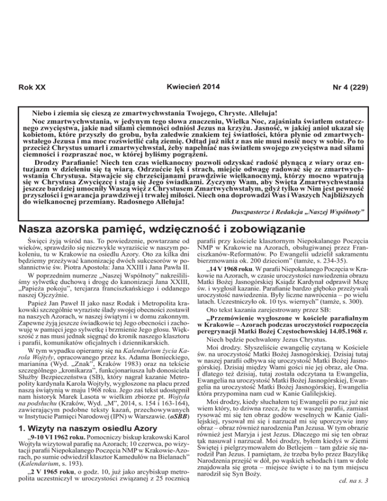Nasza Wspólnota, Nr 4 (229), kwiecień 2014 Rok XX 1 Kwiecień 2014 Nr 4 (229) Niebo i ziemia się cieszą ze zmartwychwstania Twojego, Chryste. Alleluja! Noc zmartwychwstania, w jedynym tego słowa znaczeniu, Wielka Noc, zajaśniała światłem ostatecznego zwycięstwa, jakie nad siłami ciemności odniósł Jezus na krzyżu. Jasność, w jakiej anioł ukazał się kobietom, które przyszły do grobu, była zaledwie znakiem tej światłości, która płynie od zmartwychwstałego Jezusa i ma moc rozświetlić całą ziemię. Odtąd już nikt z nas nie musi nosić nocy w sobie. Po to przecież Chrystus umarł i zmartwychwstał, żeby napełniać nas światłem swojego zwycięstwa nad siłami ciemności i rozpraszać noc, w której byliśmy pogrążeni. Drodzy Parafianie! Niech ten czas wielkanocny pozwoli odzyskać radość płynącą z wiary oraz entuzjazm w dzieleniu się tą wiarą. Odrzućcie lęk i strach, miejcie odwagę radować się ze zmartwychwstania Chrystusa. Stawajcie się chrześcijanami prawdziwie wielkanocnymi, którzy mocno wpatrują się w Chrystusa Zwycięzcę i stają się Jego świadkami. Życzymy Wam, aby Święta Zmartwychwstania jeszcze bardziej umocniły Waszą więź z Chrystusem Zmartwychwstałym, gdyż tylko w Nim jest pewność przyszłości i gwarancja prawdziwej i trwałej miłości. Niech ona doprowadzi Was i Waszych Najbliższych do wielkanocnej przemiany. Radosnego Alleluja! Duszpasterze i Redakcja „Naszej Wspólnoty” Nasza azorska pamięć, wdzięczność i zobowiązanie Święci żyją wśród nas. To powiedzenie, powtarzane od wieków, sprawdziło się niezwykle wyraziście w naszym pokoleniu, tu w Krakowie na osiedlu Azory. Oto za kilka dni będziemy przeżywać kanonizację dwóch sukcesorów w posłannictwie św. Piotra Apostoła: Jana XXIII i Jana Pawła II. W poprzednim numerze „Naszej Wspólnoty” nakreśliliśmy sylwetkę duchową i drogę do kanonizacji Jana XXIII, „Papieża pokoju”, tercjarza franciszkańskiego i oddanego naszej Ojczyźnie. Papież Jan Paweł II jako nasz Rodak i Metropolita krakowski szczególnie wyraziste ślady swojej obecności zostawił na naszych Azorach, w naszej świątyni i w domu zakonnym. Zapewne żyją jeszcze świadkowie tej Jego obecności i zachowuję w pamięci jego sylwetkę i brzmienie Jego głosu. Większość z nas musi jednak sięgnąć do kronik naszego klasztoru i parafii, komunikatów oficjalnych i dziennikarskich. W tym wypadku opieramy się na Kalendarium życia Karola Wojtyły, opracowanego przez ks. Adama Bonieckiego, marianina (Wyd. „Znak”, Kraków 1983) oraz na tekście szczególnego „kronikarza”, funkcjonariusza lub donosiciela Służby Bezpieczeństwa (SB), który nagrał kazanie Metropolity kardynała Karola Wojtyły, wygłoszone na placu przed naszą świątynią w maju 1968 roku. Jego zaś tekst udostępnił nam historyk Marek Lasota w wielkim zbiorze pt. Wojtyła na podsłuchu (Kraków, Wyd. „M”, 2014, s. 154 i 163-164), zawierającym podobne teksty kazań, przechowywanych w Instytucie Pamięci Narodowej (IPN) w Warszawie. (oSBB) 1. Wizyty na naszym osiedlu Azory „9-10 VI 1962 roku. Pomocniczy biskup krakowski Karol Wojtyła wizytował parafię na Azorach; 10 czerwca, po wizytacji parafii Niepokalanego Poczęcia NMP w Krakowie-Azorach, po sumie odwiedził klasztor Kamedułów na Bielanach” (Kalendarium, s. 193). „2 V 1965 roku, o godz. 10, już jako arcybiskup metropolita uczestniczył w uroczystości związanej z 25 rocznicą parafii przy kościele klasztornym Niepokalanego Poczęcia NMP w Krakowie na Azorach, obsługiwanej przez Franciszkanów-Reformatów. Po Ewangelii udzielił sakramentu bierzmowania ok. 200 dzieciom” (tamże, s. 234-35). „14 V 1968 roku. W parafii Niepokalanego Poczęcia w Krakowie na Azorach, w czasie uroczystości nawiedzenia obrazu Matki Bożej Jasnogórskiej Ksiądz Kardynał odprawił Mszę św. i wygłosił kazanie. Parafianie bardzo głęboko przeżywali uroczystość nawiedzenia. Były liczne nawrócenia – po wielu latach. Uczestniczyło ok. 10 tys. wiernych” (tamże, s. 300). Oto tekst kazania zarejestrowany przez SB: „Przemówienie wygłoszone w kościele parafialnym w Krakowie – Azorach podczas uroczystości rozpoczęcia peregrynacji Matki Bożej Częstochowskiej 14.05.1968 r. Niech będzie pochwalony Jezus Chrystus. Moi drodzy. Słyszeliście ewangelię czytaną w Kościele św. na uroczystość Matki Bożej Jasnogórskiej. Dzisiaj tutaj w naszej parafii odbywa się uroczystość Matki Bożej Jasnogórskiej. Dzisiaj między Wami gości nie jej obraz, ale Ona. I dlatego też dzisiaj, tutaj została odczytana ta Ewangelia, Ewangelia na uroczystość Matki Bożej Jasnogórskiej, Ewangelia na uroczystość Matki Bożej Jasnogórskiej, Ewangelia która przypomina nam cud w Kanie Galilejskiej. Moi drodzy, kiedy słuchałem tej Ewangelii po raz już nie wiem który, to dziwna rzecz, że tu w waszej parafii, zamiast rysować mi się ten obraz godów weselnych w Kanie Galilejskiej, rysował mi się i narzucał mi się uporczywie inny obraz – obraz również narodzenia Pan Jezusa. W tym obrazie również jest Maryja i jest Jezus. Dlaczego mi się ten obraz tak nasuwał i narzucał. Moi drodzy, byłem kiedyś w Ziemi Świętej i pielgrzymowałem do Betlejem – tam gdzie się narodził Pan Jezus. I pamiętam, że trzeba było przez Bazylikę Narodzenia przejść w dół, po wąskich schodach i tam w dole znajdowała się grota – miejsce święte i to na tym miejscu narodził się Syn Boży. cd. na s. 3 Nasza Wspólnota, Nr 4 (229), kwiecień 2014 2 Informacje duszpasterskie 28.04. – Poniedziałek: Uroczystość św. Wojciecha, biskupa i męczennika, głównego patrona Polski. 29.04. – Wtorek: Święto św. Katarzyny ze Sieny, dziewicy i doktora Kościoła oraz patronki Europy. 1.05. – Czwartek: od godz. 9 odwiedziny chorych z sakramentalną posługą, o godz.17 Msza św. w intencji Koła Przyjaciół Radia Maryja; o g