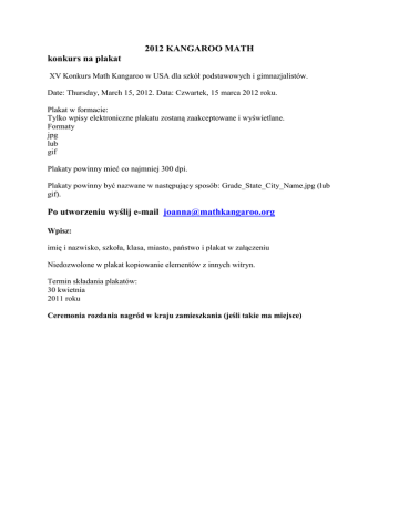2012 KANGAROO MATH konkurs na plakat XV Konkurs Math Kangaroo w USA dla szkół podstawowych i gimnazjalistów. Date: Thursday, March 15, 2012. Data: Czwartek, 15 marca 2012 roku. Plakat w formacie: Tylko wpisy elektroniczne plakatu zostaną zaakceptowane i wyświetlane. Formaty jpg lub gif Plakaty powinny mieć co najmniej 300 dpi. Plakaty powinny być nazwane w następujący sposób: Grade_State_City_Name.jpg (lub gif). Po utworzeniu wyślij e-mail [email protected] Wpisz: imię i nazwisko, szkoła, klasa, miasto, państwo i plakat w załączeniu Niedozwolone w plakat kopiowanie elementów z innych witryn. Termin składania plakatów: 30 kwietnia 2011 roku Ceremonia rozdania nagród w kraju zamieszkania (jeśli takie ma miejsce)