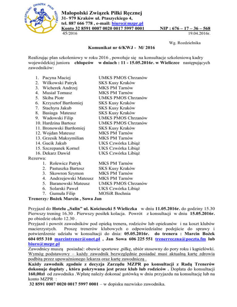 Małopolski Związek Piłki Ręcznej 31- 979 Kraków ul. Ptaszyckiego 4, tel. 887 666 778 , e-mail: [email protected] Konto 32 8591 0007 0020 0017 5997 0001 45/2016 NIP : 676 – 17 – 36 – 568 19.04.2016r. Wg. Rozdzielnika Komunikat nr 6/KWJ - M/ 2016 Realizując plan szkoleniowy w roku 2016 , powołuje się na konsultacje szkoleniową kadry wojewódzkiej juniora chłopców w dniach : 11 - 15.05.2016r. w Wieliczce następujących zawodników: 1. Pacyna Maciej UMKS PMOS Chrzanów 2. Wilkowski Patryk SKS Kusy Kraków 3. Wicherek Andrzej MKS PM Tarnów 4. Musiał Tomasz MKS PM Tarnów 5. Skiba Piotr UMKS PMOS Chrzanów 6. Krzysztof Bartłomiej SKS Kusy Kraków 7. Stachyra Jakub SKS Kusy Kraków 8. Basiaga Mateusz SKS Kusy Kraków 9. Wadowski Filip UMKS PMOS Chrzanów 10. Hardzina Bartosz UMKS PMOS Chrzanów 11. Bronowski Bartłomiej SKS Kusy Kraków 12. Wojdan Mateusz MKS PM Tarnów 13. Grzesik Maksymilian MKS PM Tarnów 14. Gucik Jakub UKS Czwórka Libiąż 15. Szczepanek Kornel UKS Czwórka Libiąż 16. Dekarz Dawid UKS Czwórka Libiąż Rezerwa: 1. Rolewicz Patryk MKS PM Tarnów 2. Pastuszka Bartosz SKS Kusy Kraków 3. Skowron Szymon MKS PM Tarnów 4. Andrzejewski Mateusz MKS PM Tarnów 5. Baranowski Mateusz UMKS PMOS Chrzanów 6. Solarski Paweł UKS Czwórka Libiąż 7. Gumuła Filip MOSiR Bochnia Trenerzy: Bożek Marcin , Sowa Jan Przyjazd do Hotelu „Salin” ul. Kościuszki 5 Wieliczka w dniu 11.05.2016r. do godziny 15.30 Pierwszy trening 16.30 . Pierwszy posiłek kolacja. Powrót z konsultacji w dniu 15.05.2016r. po obiedzie około 12.30 . Przyjazd i powrót zawodników pod opieką trenera, rodziców lub opiekunów i na koszt klubów macierzystych. Proszę trenerów klubowych o odpowiedzialne podejście do sprawy i potwierdzenie udziału w konsultacji do dnia: 05.05.2016r. do trenera : Marcin Bożek 604 055 310 [email protected] , Jan Sowa 606 225 551 [email protected] lub [email protected] Zawodnicy muszą posiadać: obuwie sportowe ,piłkę, ubiór stosowny do pory roku i kąpielówki. Wymóg podstawowy – każdy zawodnik bezwzględnie posiadać musi aktualną kartę zdrowia podbitą przez upoważnionego lekarza oraz kartę zawodniczą . Każdy zawodnik zgodnie z decyzja Zarządu MZPR po konsultacji z Radą Trenerów dokonuje dopłaty , która pokrywana jest przez klub lub rodziców . Dopłata do konsultacji 160,00zł od zawodnika .Wpłatę należy dokonać gotówką w dniu przyjazdu na konsultację lub na konto MZPR : 32 8591 0007 0020 0017 5997 0001 – w dopisku nazwisko zawodnika. Harmonogram planowanych akcji szkoleniowych do końca sezonu łącznie z OOM Konsultacja szkoleniowa Konsultacja 28.06.2016 01.07.2016 szkoleniowa 01.07.2016 03.07.2016 Półfinał OOM Konsultacja 12.07.2016 16.07.2016 szkoleniowa 26.05.2016 30.05.2016 Finał OOM (pod 19.07.2016 23.07.2016 warunkiem uzyskania awansu) Dąbrowa Tarnowska Bochnia Bochnia Dąbrowa Tarnowska Wrocław Ze sportowym pozdrowieniem Zbigniew Gorączko – Prezes MZPR