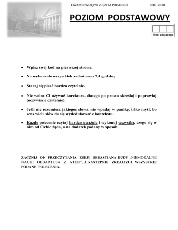 Wpisz swój kod na pierwszej stronie. Na wykonanie wszystkich zadań masz 2,5 godziny. Staraj się pisać bardzo czytelnie. Nie wolno Ci używać korektora, dlatego po prostu skreślaj i poprawiaj (oczywiście czytelnie). Jeśli nie rozumiesz jakiegoś słowa, nie wpadaj w panikę, tylko myśl, bo sens wielu słów da się wydedukować z kontekstu. Każde polecenie czytaj bardzo uważnie i wykonuj wszystko, czego się w nim od Ciebie żąda, a na dodatek podany w sposób. ZACZNIJ OD PRZECZYTANIA ESEJU SEBASTIANA DUDY „NIEMORALNE NAUKI OBDARTUSA Z ATEN”, A NASTĘPNIE ZREALIZUJ WSZYSTKIE PODANE POLECENIA. NIEMORALNE NAUKI OBDARTUSA Z ATEN W roku 399 p.n.e. w Atenach odbył się jeden z najsłynniejszych procesów w dziejach Europy. Oskarżonym był siedemdziesięcioletni filozof Sokrates, rodowity Ateńczyk, syn kamieniarza Sofroniskosa i położnej Fainarete. Oskarżono go o to, że bogów rodzinnego miasta nie uznawał, tylko „jakichś nowych wymyślał”. Miał też deprawować ateńską młodzież. Choć filozof wygłosił przed trybunałem płomienną mowę obrończą […] został skazany na śmierć. Sokrates miał wypić truciznę – cykutę. Na takie wymuszone samoukaranie godziło się ateńskie prawo. Filozof nie chciał mu się sprzeciwiać, gdyż wierzył, że sprawiedliwość zawsze wymaga posłuszeństwa ojczyźnie. Sokratesa odprowadzono do więzienia i trzymano pod strażą jeszcze 30 dni, czekając, aż wróci statkiem z wyspy Delos świąteczna procesja ku czci Apollina. W tym czasie nie można bowiem było w ateńskiej polis wykonywać wyroków śmierci. […] W końcu jednak przyniesiono mu nieszczęsny puchar z trucizną. Na kilka wieków przed pojawieniem się chrześcijaństwa Europa zyskała jednego z największych męczenników. Nie minęło wiele czasu, a w samych Atenach śmierć Sokratesa uznano za tragiczną pomyłkę. Nieustanny wyrzut sumienia stanowił sam akt oskarżenia przez stulecia przechowywany w ateńskim archiwum państwowym […]. Za […] wiecznotrwałą rehabilitację odpowiada najsłynniejszy z uczniów Sokratesa – Platon. To dzięki literackiemu geniuszowi Platona Sokrates został świeckim świętym zachodniej cywilizacji. […] Gdyby nie Platońskie „Dialogi”, znany byłby pewnie dziś prawie wyłącznie historykom starożytności jako ateński ekscentryk […] Ma zatem Sokrates w stosunku do swego ucznia wielki dług, ale przecie to samo można powiedzieć i o Platonie. Czyż bowiem nie dzięki […] Sokratesowi Platońskie „Dialogi” wciąż się znajdują na listach bestsellerów? […] Co wiadomo na pewno? Ten najpierwszy (nie w chronologii, lecz co do rangi) wśród helleńskich filozofów dysponował urokiem nieodpartym. Urok ten jednak nie brał się z cielesnej urody. […] Chodził boso, nosił wyświechtane ubrania i wyglądał niechlujnie. […] Sokratesa przede wszystkim interesowała prawda odkrywana w nieustannym dialogu z innymi. Mawiał, że chciał być (jak jego matka) akuszerką prawdy, która, choć gotowa, dopiero w błyskotliwej rozmowie wydostawała się z ukrycia i odsłaniała zarówno w jego własnej, jak i jego rozmówców świadomości. Mimo to sam Sokrates przyznawał, że słucha przebywającego w nim dajmoniona (czyli opiekuńczego ducha). Możemy w nim się domyślać boskiej siły moralnej, która dla filozofa pozostawała autorytetem najwyższym. […] Sokrates wyznał to dobitnie […]: „Ja was, obywatele, kocham całym sercem, ale posłucham boga raczej aniżeli was i póki mi tchu starczy, póki sił, bezwarunkowo nie przestanę filozofować i was pobudzać, i pokazywać drogę każdemu, kogo tylko spotkam […] jeśli mnie skażecie, to niełatwo znajdziecie drugiego takiego…”. […] Mimo nalegań uczniów Sokrates nie uciekł z ateńskiego więzienia. Cykutę wypił i na wieki stał się wzorem mędrca. […] Sebastian Duda, „Niemoralne nauki obdartusa z Aten”, „Gazeta Wyborcza”, 11 lutego 2010, s. 16-17 ZADANIE 1 Od procesu, w którym Sokratesa skazano na śmierć, do dziś upłynęło: A. dwadzieścia jeden wieków B. cztery wieki C. trzysta dziewięćdziesiąt dziewięć lat D. dwadzieścia pięć stuleci. ZADANIE 2 Ojciec Sokratesa zajmował się: A. budowaniem kamienic z kamienia wydobywanego w kamieniołomach B. miotaniem kamieni z procy C. kolekcjonowaniem kamieni szlachetnych D. wykonywaniem nagrobków. ZADANIE 3 Matka Sokratesa była: A. akuszerką B. przełożoną pielęgniarek C. położnicą D. salową ścielącą łoża. ZADANIE 4 Deprawowanie młodzieży to w sensie dosłownym: A. nawracanie młodych na prawosławie B. prawowanie się z młodymi o majątek C. sprowadzanie młodych z uczciwej drogi D. wpajanie młodym poglądów lewicowych. ZADANIE 5 Sokratesa trzymano pod strażą 30 dni, bo A. sprawiedliwość zawsze wymaga posłuszeństwa ojczyźnie B. został skazany na śmierć C. nie uznawał bogów rodzinnego miasta D. czekano na powrót procesji ku czci Apolla. ZADANIE 6 Wymuszone samoukaranie zgodne z prawem ateńskim to A. wygłoszenie płomiennej mowy obrończej B. przebywanie w więzieniu 30 dni C. przyniesienie pucharu z trucizną D. wypicie cykuty. ZADANIE 7 Grecka polis to nazwa A. polisy ubezpieczeniowej przysługującej wolnym obywatelom greckim B. polityki uprawianej przez Greków C. greckiego państwa-miasta D. stolicy Grecji. ZADANIE 8 Według Sebastiana Dudy główne źródło nieustannych wyrzutów sumienia, które Ateńczyków gnębiły przez stulecia, stanowił A. Sokrates jako jeden z największych męczenników B. wyrok śmierci uznany za tragiczna pomyłkę C. nieszczęsny puchar z trucizną D. akt oskarżenia przechowywany w ateńskim archiwum państwowym. ZADANIE 9 W zdaniu „Za wiecznotrwałą rehabilitację odpowiada najsłynniejszy uczeń Sokratesa – Platon” słowo „rehabilitacja” użyte zostało w znaczeniu A. uzdrowienie stosunków panujących w Atenach B. uwiecznienie wybitnej postaci C. pociągnięcie do odpowiedzial