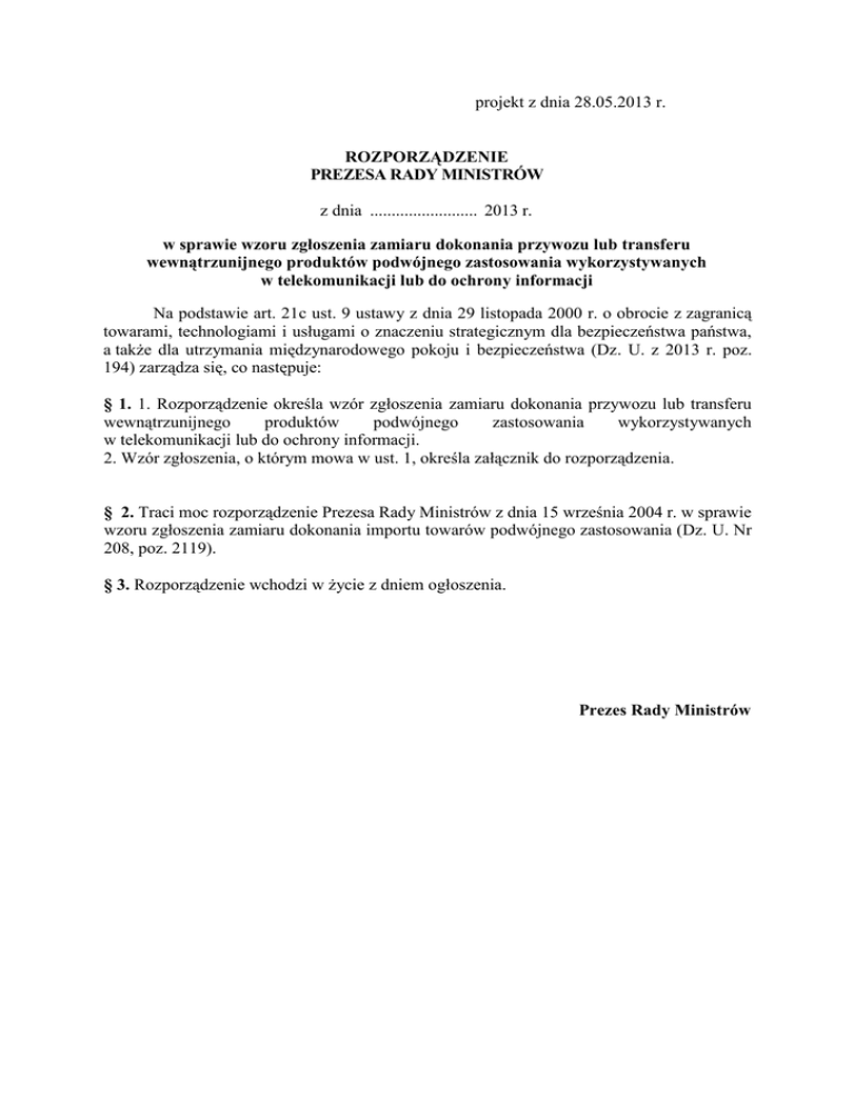 Projekt rozporządzenia Prezesa Rady Ministrów w