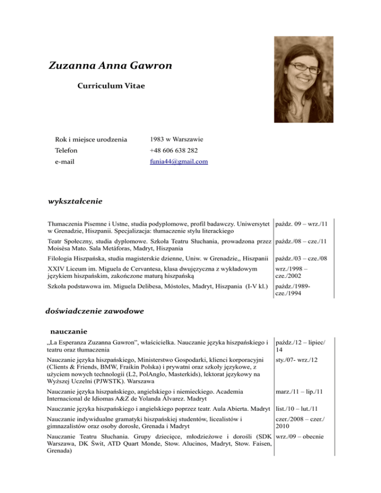 Zuzanna Anna Gawron Curriculum Vitae Rok i miejsce urodzenia 1983 w Warszawie Telefon +48 606 638 282 e-mail [email protected] wykształcenie Tłumaczenia Pisemne i Ustne, studia podyplomowe, profil badawczy. Uniwersytet paźdz. 09 – wrz./11 w Grenadzie, Hiszpanii. Specjalizacja: tłumaczenie stylu literackiego Teatr Społeczny, studia dyplomowe. Szkoła Teatru Słuchania, prowadzona przez paźdz./08 – cze./11 Moisésa Mato. Sala Metáforas, Madryt, Hiszpania Filologia Hiszpańska, studia magisterskie dzienne, Uniw. w Grenadzie,, Hiszpanii paźdz./03 – cze./08 XXIV Liceum im. Miguela de Cervantesa, klasa dwujęzyczna z wykładowym językiem hiszpańskim, zakończone maturą hiszpańską wrz./1998 – cze./2002 Szkoła podstawowa im. Miguela Delibesa, Móstoles, Madryt, Hiszpania (I-V kl.) paźdz./1989cze./1994 doświadczenie zawodowe nauczanie „La Esperanza Zuzanna Gawron”, właścicielka. Nauczanie języka hiszpańskiego i teatru oraz tłumaczenia paźdz./12 – lipiec/ 14 Nauczanie języka hiszpańskiego, Ministerstwo Gospodarki, klienci korporacyjni (Clients & Friends, BMW, Fraikin Polska) i prywatni oraz szkoły językowe, z użyciem nowych technologii (L2, PolAnglo, Masterkids), lektorat językowy na Wyższej Uczelni (PJWSTK). Warszawa sty./07- wrz./12 Nauczanie języka hiszpańskiego, angielskiego i niemieckiego. Academia Internacional de Idiomas A&Z de Yolanda Álvarez. Madryt marz./11 – lip./11 Nauczanie języka hiszpańskiego i angielskiego poprzez teatr. Aula Abierta. Madryt list./10 – lut./11 Nauczanie indywidualne gramatyki hiszpańskiej studentów, licealistów i gimnazalistów oraz osoby dorosłe, Grenada i Madryt czer./2008 – czer./ 2010 Nauczanie Teatru Słuchania. Grupy dziecięce, młodzieżowe i dorośli (SDK wrz./09 – obecnie Warszawa, DK Świt, ATD Quart Monde, Stow. Alucinos, Madryt, Stow. Faisen, Grenada) tłumaczenia ustne i pisemne Tłumaczenia specjalistyczne dla klientów indywidualnych, uczelni (Universidad luty/05 – obecnie Autónoma de Madrid), klientów biznesowych oraz agencji tłumaczeniowych (m.in. Skrivanek, Linguatrans, MondoAgit) Literackie: proza poetycka „Usuwanie kamienia obłędu” Alejandry Pizarnik. “Rita luty/05 – obecnie Baum” 10/2006; tłumaczenia próbne dla wydawnictwa Philip Wilson, Warszawa; Teatr spotkanie dla Teatro de la Escucha, Madryt. Audiowizualne: „Danton” A. Wajdy. „Dekalog”, „Bez końca”, Przypadek K. Kieślowskiego dla Uniwersytetu w Grenadzie. “Wyrażam zgodę na przetwarzanie moich danych osobowych dla potrzeb niezbędnych do realizacji procesu rekrutacji (zgodnie z Ustawą z dnia 29.08.1997 r o Ochronie Danych Osobowych; tekst jednolity: Dz. U. z 2002r. Nr 101, poz. 926 ze zm.).”