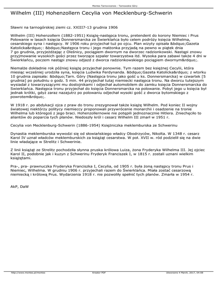 Montes Tarnovicensis - Tarnowskie Góry Wilhelm (III) Hohenzollern Cecylia von Mecklenburg-Schwerin Sławni na tarnogórskiej ziemi cz. XXIII7-13 grudnia 1906 Wilhelm (III) Hohenzollern (1882-1951) Książę-następca tronu, pretendent do korony Niemiec i Prus Polowanie w lasach księcia Donnersmarcka ze Świerklańca było celem podróży księcia Wilhelma, cesarskiego syna i następcy. W 1906 roku przyjechał tuż po ojcu. Plan wizyty opisała „Gazeta Katolicka”: „Następca tronu i jego małżonka przyjadą na pewno w piątek dnia 7 go grudnia, przyjeżdżając z Oleśnicy, pociągiem dwornym na dworzec radzionkowski. Nastąpi znowu przyjmowanie wysokich gości przez tworzące szpaler towarzystwa itd. Wysoka para zabawi także 4 dni w Świerklańcu, poczem nastąpi znowu odjazd z dworca radzionkowskiego pociągiem dwornym”. Niemalże dokładnie rok później książę przyjechał ponownie. Tym razem bez księżnej Cecylii, która miesiąc wcześniej urodziła syna, księcia Ludwika Ferdynanda. „Gazeta Katolicka” z wtorku 10 grudnia zapisała: „Tarn. Góry (Następca tronu jako gość u ks. Donnersmarcka) w czwartek [5 grudnia] po południu o godz. 5 min. 44 przyjechał tutaj niemiecki następca tronu. Na dworcu tutejszym wysiadał z towarzyszącymi mu dostojnikami i odjechał automobilem do zamku księcia Donnersmarcka do Swierklańca. Następca tronu przyjechał do księcia Donnersmarcka na polowanie. Pobyt jego u księcia był jednak krótki, gdyż zaraz nazajutrz po polowaniu odjechał wysoki gość z dworca bytomskiego z powrotem”. W 1918 r. po abdykacji ojca z praw do tronu zrezygnował także książę Wilhelm. Pod koniec II wojny światowej niektórzy politycy niemieccy proponowali przywrócenie monarchii i osadzenie na tronie Wilhelma lub któregoś z jego braci. Hohenzollernowie nie potępili jednoznacznie Hitlera. Zniechęciło to aliantów do poparcia tych planów. Niedoszły król i cesarz Wilhelm III zmarł w 1951 r. Cecylia von Mecklenburg-Schwerin (1886-1954) Księżniczka meklemburska ze Schwerinu Dynastia meklemburska wywodzi się od słowiańskiego władcy Obodrzyców, Nikolta. W 1348 r. cesarz Karol IV uznał władców meklemburskich za książąt cesarstwa. W poł. XVII w. ród podzielił się na dwie linie władające w Strelitz i Schwerinie. Z linii książąt ze Strelitz pochodziła słynna pruska królowa Luiza, żona Fryderyka Wilhelma III. Jej ojciec Karol II, podobnie jak i kuzyn z Schwerinu Fryderyk Franciszek I, w 1815 r. zostali uznani wielkim książętami. Pra-, pra- prawnuczka Fryderyka Franciszka I, Cecylia, od 1905 r. była żoną następcy tronu Prus i Niemiec, Wilhelma. W grudniu 1906 r. przyjechali razem do Świerklańca. Miała zostać cesarzową niemiecką i królową Prus. Wydarzenia 1918 r. nie pozwoliły spełnić tych planów. Zmarła w 1954 r. AkP, DaW http://www.montes.pl/montes Kreator PDF Utworzono 4 March, 2017, 04:08