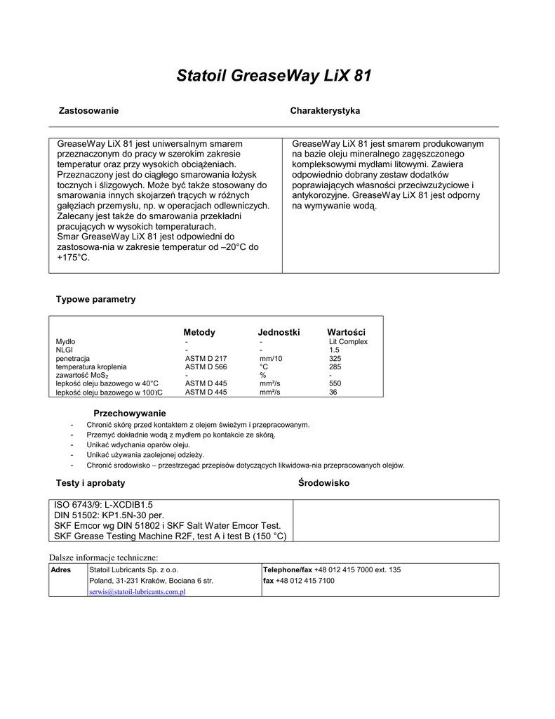 Statoil GreaseWay LiX 81 Zastosowanie Charakterystyka GreaseWay LiX 81 jest uniwersalnym smarem przeznaczonym do pracy w szerokim zakresie temperatur oraz przy wysokich obciążeniach. Przeznaczony jest do ciągłego smarowania łożysk tocznych i ślizgowych. Może być także stosowany do smarowania innych skojarzeń trących w różnych gałęziach przemysłu, np. w operacjach odlewniczych. Zalecany jest także do smarowania przekładni pracujących w wysokich temperaturach. Smar GreaseWay LiX 81 jest odpowiedni do zastosowa-nia w zakresie temperatur od –20°C do +175°C. GreaseWay LiX 81 jest smarem produkowanym na bazie oleju mineralnego zagęszczonego kompleksowymi mydłami litowymi. Zawiera odpowiednio dobrany zestaw dodatków poprawiających własności przeciwzużyciowe i antykorozyjne. GreaseWay LiX 81 jest odporny na wymywanie wodą. Typowe parametry Mydło NLGI penetracja temperatura kroplenia zawartość MoS2 lepkość oleju bazowego w 40°C lepkość oleju bazowego w 100°C Metody Jednostki Wartości ASTM D 217 ASTM D 566 ASTM D 445 ASTM D 445 mm/10 °C % mm²/s mm²/s Lit Complex 1.5 325 285 550 36 Przechowywanie - Chronić skórę przed kontaktem z olejem świeżym i przepracowanym. Przemyć dokładnie wodą z mydłem po kontakcie ze skórą. Unikać wdychania oparów oleju. Unikać używania zaolejonej odzieży. Chronić srodowisko – przestrzegać przepisów dotyczących likwidowa-nia przepracowanych olejów. Testy i aprobaty Środowisko ISO 6743/9: L-XCDIB1.5 DIN 51502: KP1.5N-30 per. SKF Emcor wg DIN 51802 i SKF Salt Water Emcor Test. SKF Grease Testing Machine R2F, test A i test B (150 °C) Dalsze informacje techniczne: Adres Statoil Lubricants Sp. z o.o. Poland, 31-231 Kraków, Bociana 6 str. [email protected] Telephone/fax +48 012 415 7000 ext. 135 fax +48 012 415 7100