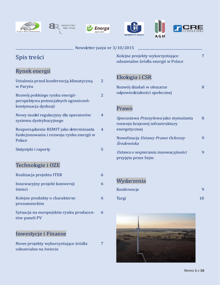 ___________________________________ Newsletter juejsi nr 3/10/2015 _______________________________________ Kolejne projekty wykorzystujące odnawialne źródła energii w Polsce Spis treści 7 Rynek energii Ustalenia przed konferencją klimatyczną w Paryżu 2 Rozwój polskiego rynku energiiperspektywa potencjalnych ograniczeńkontynuacja dyskusji 2 Nowy model regulacyjny dla operatorów systemu dystrybucyjnego 4 Rozporządzenie REMIT jako determinanta funkcjonowania i rozwoju rynku energii w Polsce 4 Statystyki i raporty 5 Ekologia i CSR Rozwój działań w obszarze odpowiedzialności społecznej 8 Prawo Specustawa Przesyłowa jako stymulanta 8 rozwoju krajowej infrastruktury energetycznej Nowelizacja Ustawy Prawo Ochrony 9 Środowiska Ustawa o wspieraniu innowacyjności 9 przyjęta przez Sejm Technologie i OZE Realizacja projektu ITER 6 Innowacyjny projekt konwersji śmieci 6 Kolejne produkty o charakterze prosumenckim 6 Sytuacja na europejskim rynku producentów paneli PV 6 Wydarzenia Konferencje Targi 9 10 Inwestycje i Finanse Nowe projekty wykorzystujące źródła odnawialne na świecie 7 Strona 1 z 10 ___________________________________ Newsletter juejsi nr 3/10/2015 _______________________________________ Rynek energii Ustalenia przed konferencją klimatyczną w Paryżu W ramach działań podejmowanych przed szczytem klimatycznym, który odbędzie się w grudniu bieżącego roku w Paryżu, Polska uzyskała zapewnienie o zaakceptowaniu przez państwa członkowskie Unii Europejskiej zapisów o tzw. „neutralności węglowej”. Zgodnie z przyjętymi założeniami, planuje się, iż poszczególne kraje do roku 2030 ograniczą emisje gazów cieplarnianych o 40 procent w stosunku do poziomu z roku 1990. Dla porównania, państwem wnoszącym o zredukowanie emisji na poziomie przekraczającym 40% były Niemcy, jednak petycja ta nie została ostatecznie uwzględniona. Tak zwany mandat negocjacyjny zawiera również zapis o planowanej redukcji emisji na poziomie 50% przed rokiem 2050, a także dążenie do utrzymania neutralności węglowej w następnych latach. Uzyskanie zapisu o neutralności węglowej uważane jest za szczególnie korzystne dla Polski albowiem dopuszcza ono możliwość uwzględnienia w bardzo restrykcyjnym podejściu związanym z dekarbonizacją- możliwości pochłaniania powstałych emisji dwutlenku węgla przez lasy. Do innych szczególnie cenionych rozwiązań zalicza się rozwijanie innowacyjnych technologii umożliwiających przetwarzanie dwutlenku węgla na inne materiały przykładowo takie jak tworzywa sztuczne. W warunkach polskich w projekt tego typu zaangażowała się spółka Tauron Wytwarzanie, która w ramach konsorcjum badawczego poszukuje możliwości obniżenia emisji dwutlenku węgla poprzez jego przekształcanie w syntezowy gaz (SNG). Postanowienia szczytu klimatycznego z Paryża, w przypadku jego ukończenia z sukcesem, zaczną obowiązywać po roku 2020 zastępując tym samym postanowienia protokołu z Kioto. Rozwój polskiego rynku energii- perspektywa potencjalnych ograniczeń- kontynuacja dyskusji Obecnie na polskim rynku energii wyraźnie zauważalny jest trend związany z nasileniem konkurencji- dotyczy to w szczególności segmentu obrotu energią elektryczną. Z danych opublikowanych we wrześniu bieżącego roku przez Urząd Regulacji Energetyki wynika, iż nastąpił istotny wzrost liczby przedsiębiorstw zajmujących się sprzedażą energii elektrycznej- obecnie jest ona oferowana przez 28 podmiotów [1]. Podobnie, z przeprowadzonych analiz wynika, iż najwyższą rentownością cechuje się segment obrotu i dystrybucji, czego potwierdzeniem są wyniki finansowe osiągane przez największe polskie spółki energetyczne (H.L. Gabryś, wywiad dla portalu wnp.pl, 21.09.2015). Powyższe zmiany wymuszają konieczność poszukiwania przez przedsiębiorstwa zajmujące się sprzedażą energii elektrycznej innowacyjnych rozwiązań w obszarze produktów i usług w celu podtrzymania i rozwijania atrakcyjności oferty dla klientów. Podejmując problematykę ograniczeń w rozwoju polskiego rynku energii na pierwszy plan wysuwają się: wzrastający koszt uprawnień do emisji dwutlenku węgla, systematyczne obniżanie cen energii, brak stabilnej sytuacji spółek energetycznych w kontekście istniejących zagrożeń dla realizacji dużych projektów inwestycyjnych. Wymienia się również ryzyko zamknięcia dużych obiektów produkcyjnych. Według prognoz Towarzystwa Gospodarczego Polskie Elektrownie, do roku 2022 Polska ma stracić jedną trzecią mocy w stosunku do stanu obecnego. Podobnie, istotnym ograniczeniem jest coraz bardziej zauważalny konflikt interesów poszczególnych interesariuszy na rynku energii. Powyższy konflikt jest stymulowany poprzez rozbieżności celów oraz oczekiwań, gdzie odbiorcy energii oczekują systematycznego obniżania cen energii, sprzedawcy natomiast zapewnienia przez państwo stabilnych w okresie długoterminowym warunków finasowania i rozwoju, co umożliwiłoby bezpieczne inicjonowanie i realizację dużych projektów o charakterze inwestycyjnym. Bardzo wyraźne oddziaływanie istnieje również ze strony interesariusza strategicznego, którym jest Unia Europejska wywierająca znaczący wpływ na rynek energetyczny Strona 2 z 10 ___________________________________ Newsletter juejsi nr 3/10/2015 _______________________________________ poprzez wprowadzane odpowiednich dyrektyw i rozporządzeń wraz z egzekwowaniem ich wykonywania. Odrębny aspekt związany z potencjalnymi kierunkami rozwoju rynku stanowi problematyka dotycząca odnawialnych źródeł energii i ich mądrego i dojrzałego implementowania do warunków polskich. Przewaga konkurencyjna Polski wynika tu z możliwości uczenia się oraz korzystania z „lessons learned” od państw europejskich, które przeszły już drogę rozwoju w obszarze zasobów odnawialnych. Jako przykład można wskazać Niemcy, gdzie zgodnie z danymi podanymi przez zesp