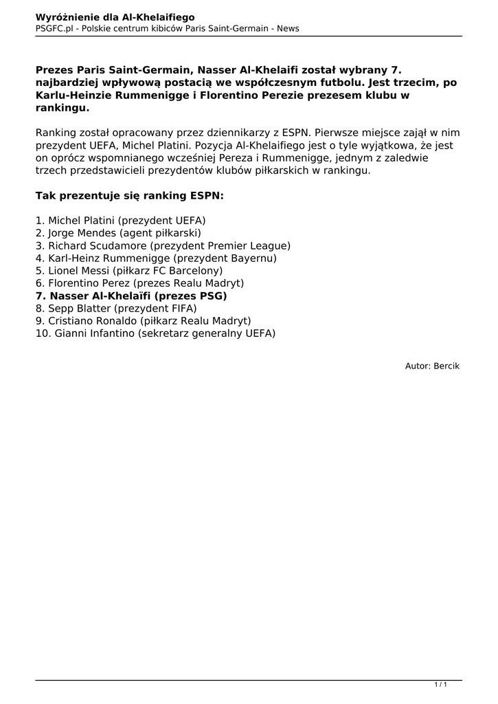 Wyróżnienie dla Al-Khelaifiego PSGFC.pl - Polskie centrum kibiców Paris Saint-Germain - News Prezes Paris Saint-Germain, Nasser Al-Khelaifi został wybrany 7. najbardziej wpływową postacią we współczesnym futbolu. Jest trzecim, po Karlu-Heinzie Rummenigge i Florentino Perezie prezesem klubu w rankingu. Ranking został opracowany przez dziennikarzy z ESPN. Pierwsze miejsce zajął w nim prezydent UEFA, Michel Platini. Pozycja Al-Khelaifiego jest o tyle wyjątkowa, że jest on oprócz wspomnianego wcześniej Pereza i Rummenigge, jednym z zaledwie trzech przedstawicieli prezydentów klubów piłkarskich w rankingu. Tak prezentuje się ranking ESPN: 1. Michel Platini (prezydent UEFA) 2. Jorge Mendes (agent piłkarski) 3. Richard Scudamore (prezydent Premier League) 4. Karl-Heinz Rummenigge (prezydent Bayernu) 5. Lionel Messi (piłkarz FC Barcelony) 6. Florentino Perez (prezes Realu Madryt) 7. Nasser Al-Khelaïfi (prezes PSG) 8. Sepp Blatter (prezydent FIFA) 9. Cristiano Ronaldo (piłkarz Realu Madryt) 10. Gianni Infantino (sekretarz generalny UEFA) Autor: Bercik 1/1 Powered by TCPDF (www.tcpdf.org)
