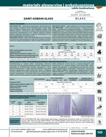 materiały elewacyjne i wykończeniowe szkło budowlane SAINT-GOBAIN GLASS SZKŁA FASADOWE SGG COOL-LITE – uzyskuje się pokrywając szkło przezroczystą powłoką z tlenków metali; dostępne jest na bazie szkła SGG PLANILUX (bezbarwne), SGG DIAMANT (białe), SGG PARSOL (zielone – barwione w masie); szkło przeznaczone do zastosowań zewnętrznych m.in. szklenia elewacji, dachów, werand, ogrodów zimowych; może być montowane w szybach zespolonych lub pojedynczych SGG COOL-LITE SK – szkło cechuje selektywna ochrona przeciwsłoneczna czyli przepuszcza maksimum światła, a zarazem minimum ciepła; opcjonalnie w ofercie szkło do hartowania SGG COOL-LITE KT – szkło selektywne, może być hartowane SGG BIOCLEAN – szkło samoczyszczące o powierzchni pokrytej niewidoczną, mineralną powłoką, o właściwościach fotokatalitycznych i hydrofilowych; działanie promieni ultrafioletowych na powierzchnię szkła SGG BIOCLEAN powoduje rozkład zabrudzeń organicznych, natomiast woda deszczowa usuwa pozostałości zanieczyszczeń i pyły mineralne; naniesiona na powierzchnię szkła powłoka nadaje mu dużą wytrzymałość; przeznaczone jest do zastosowań zewnętrznych m.in. szklenia elewacji i witryn, świetlików, werand, balustrad, itp. SGG BIOCLEAN SGG COOL-LITE* COOL-LITE* SKN SKN SKN SKN SKN KNT KNT KNT 174 165 154 165 154 164 155 140 Maks. wymiary tafli (szer./wys.) [mm] 3210/6000 Pozycja powłoki 2 (powłoka SGG COOL-LITE) 68 60 50 59 49 58 48 37 Współ. przepuszczalności światła TL [%] Współ. przenikania energii słonecznej g [%] 0,41 0,33 0,27 0,33 0,26 0,46 0,37 0,28 1,1 1,5 1,4 Współ. przenikania ciepła Ug [W/(m2K)] * parametry obliczeniowe szyby zespolonej 6 (16, argon 90%), SGG Planilux 4 mm, wg PN-EN 673 i PN-EN 410 pozostałe prezentacje SGG COOL-LITE* Nazwa KBT 140 36 0,30 SZKŁA SELEKTYWNE STOSOWANE W BUDOWNICTWIE MIESZKANIOWYM Charakteryzuje je bardzo dobra izolacyjność termiczna zimą oraz ochrona przeciwsłoneczna latem. Właściwości te pozwalają na zredukowanie kosztów ogrzewania i schładzania pomieszczeń, a także poprawę komfortu otoczenia poprzez ograniczenie strefy zimna przy oknie i skraplania się pary wodnej na szybie wewnętrznej. W okresie letnim można zrezygnować z montażu osłon przeciwsłonecznych dzięki czemu pomieszczenia są zawsze dobrze doświetlone. Nazwa SGG PLANISTAR* Szkło selektywne można łączyć z innymi funkcjami szyb zespolonych np. samoczyszczącą (SGG BIOCLEAN), zwiększającą wytrzymałość na uszkodzenia mechaniczne (wersja szkła hartowanego), podnoszącą izolacyjność akustyczną (SGG STADIP SILENCE), zwiększającą bezpieczeństwo (SGG STADIP PROTECT) oraz dekoracyjne, ornamentowe, rozpraszające światło (SGG DECORGLASS, SGG MASTERGLASS, SGG SATINOVO MATE). SGG PLANITHERM* SGG BIOCLEAN PLANISTAR* RELAX RELAX II 4S 4S II 2 (powłoka selektywna) 70 65 69 SGG BIOCLEAN II PLANITHERM RELAX II* Pozycja powłoki 71 Współ. przepuszczalności światła TL [%] Współ. przenikania energii 0,42 0,43 0,41 słonecznej g [%] Współ. przenikania 1,1 1,0 1,1 ciepła Ug [W/(m2K)] *parametry obliczeniowe szyby zespolonej 4 (16, argon 90%), SGG PLANILUX 4 mm, wg PN-EN 673 i PN-EN 410 67 PORÓWNYWANIE WŁAŚCIWOŚCI IZOLACJI AKUSTYCZNEJ Gr. szkła [mm] Izolacja akustyczna Rw* Szkło FLOAT Szkło laminowane SGG STADIP SILENCE 6 31 33 (33.1/33.2) 36 (33.1A/33.2A) 8 32 34 (44.1/44.1) 37 (44.1A/44.2A) 10 33 35 (55.1/55.2) 38 (55.1A/55.2A) 12 34 35 (66.1/66.2) 39 (66.1A/66.2A) *wg normy PN-EN ISO 717 POZOSTAŁE PRODUKTY Szkło tradycyjne Szkło SGG BIOCLEAN SGG PLANITHERM ONE szkło niskoemisyjne zapewniające współczynnik przenikania ciepła Ug=1,0 W/(m2K); laminowane szkło ochronne: SGG STADIP PROTECT, SGG STADIP SILENCE (z folią akustyczną); szkło dekoracyjne: SGG DECORGLASS i SGG MASTERGLASS (ornamentowe), SGG SATINOVO MATE (trawione kwasem), SGG PLANILAQUE EVOLUTION (lakierowane); lustra SGG MIRALITE-EVOLUTION www.saint-gobain-glass.com www.szklosamoczyszczace.pl inf. techniczna [email protected], 0 32 295 40 00 adres firmy – str. 369 Katalog Inżyniera Budownictwo Ogólne 2009/2010 143