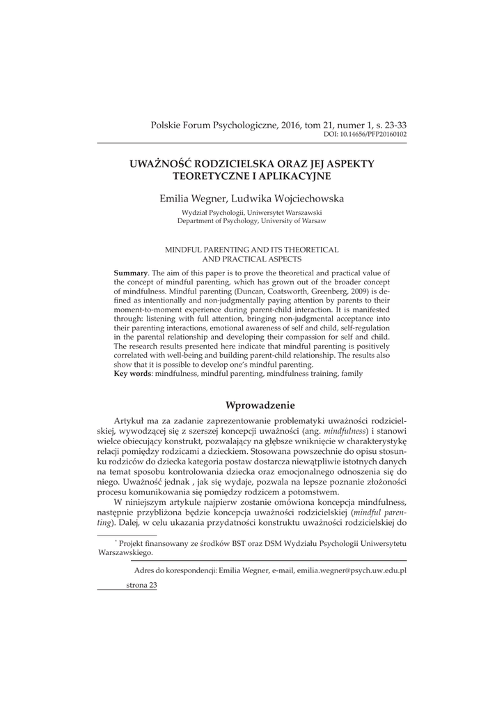 Polskie Forum Psychologiczne, 2016, tom 21, numer 1, s. 23-33 DZȱŗŖǯŗŚŜśŜȦŘŖŗŜŖŗŖŘ g)ȱȱȱȱȱ TEORETYCZNE I APLIKACYJNE Emilia Wegner, Ludwika Wojciechowska ¢£Ùȱ¢ǰȱ ¢ȱ£ Department of Psychology, University of Warsaw MINDFUL PARENTING AND ITS THEORETICAL AND PRACTICAL ASPECTS Summary. The aim of this paper is to prove the theoretical and practical value of ȱ ȱ ȱ ȱ ǰȱ ȱ ȱ ȱ ȱ ȱ ȱ ȱ ȱ ȱǯȱȱȱǻǰȱ ǰȱǰȱŘŖŖşǼȱȱęȱȱ¢ȱȱȬ¢ȱ¢ȱĴȱ¢ȱȱȱȱ ȬȬȱ ¡ȱ ȱ Ȭȱ ǯȱ ȱ ȱ ȱ DZȱ ȱ ȱ ȱ Ĵǰȱ ȱ Ȭȱ ȱ ȱ their parenting interactions, emotional awareness of self and child, self-regulation in the parental relationship and developing their compassion for self and child. The research results presented here indicate that mindful parenting is positively ȱ ȱ ȬȱȱȱȬȱǯȱȱȱȱ ȱȱȱȱȱȱȱȂȱȱǯȱ Key wordsDZȱǰȱȱǰȱȱǰȱ¢ Wprowadzenie ¢Ùȱ ȱ £ȱ £ȱ ££ ȱ ¢ȱ Čïȱ £ǰȱ ¢ £ȱ¿ȱ£ȱ££ȱȱ ČïȱǻǯȱmindfulnessǼȱȱ ȱ ȱ¢ȱǰȱ£ ¢ȱȱÙ¿£ȱ ¿ȱ ȱ¢¢¿ȱ ȱ¿£¢ȱ£ȱȱ£ǯȱ ȱ £ȱȱȱȱ£à ȱȱ£ȱȱ ȱ£ȱ ȱ¢ȱ¢ȱ ȱ ȱ ȱ ȱ £ȱ £ȱ ȱ £ȱ ¿ȱ ȱ ǯȱ Čï°ȱȱǰȱȱ¿ȱ ¢ǰȱ£ ȱȱ£ȱ£ȱ£ÙČïȱ ȱ ȱ¿ȱ¿£¢ȱ£ȱȱ ǯȱ W niniejszym artykule najpierw zostanie omówiona koncepcja mindfulness, ¿ȱ £¢Čȱ ¿£ȱ ȱ Čïȱ £ȱ ǻmindful parentingǼǯȱǰȱ ȱȱ£ȱ£¢ïȱȱ Čïȱ£ȱȱ * ȱȱę ¢ȱ£ȱïà ȱȱ£ȱȱ¢£Ùȱ¢ȱ ¢ȱ Warszawskiego. ȱȱDZ ȱǰȱȬǰȱǯ ȓ¢ǯ ǯǯ strona 23 £¢ȱȱ ȱ£ǰȱ£ȱ£¢ Ùȱ ¢ȱ¢£ȱ£ £¢ȱÚǯȱ¢£ȱȱ£ £ȱ¿£¢ȱ Čïȱ£ȱȱȱ ¢£¢ȱ £ǰȱ ȱ Čȱ ȱ ȱ Čȱ Čïȱ ȱ £ȱ ȱ¿£¢ȱ£ȱȱ ǯȱȱ£Ú£ȱÙ ȱ£ȱ ȱȱ Čïȱ£ȱȱȱ¢£¢ȱ£ȱ¢£nym. Mindfulness ȱ ȱ ȱ £¢¿Ùȱ ¿ȱ Ù£ȱ ¿ȱ ȱ ȱ Ǯ Čï°ȄȱǻǯȱǰȱÙ ǰȱ £¢ǰȱŘŖŖśǼǯȱęȱȱ¿ȱ ¢ £ȱ¿ȱ£ȱ¢ȱ¢ǯȱ¢ȱ Čïȱ£ ȱȱȱŘśŖŖȱȱ ȱ¿ȱàČ¢ȱ ȱ¢ȱ¢¢¢ǯȱȬȱǻŘŖŖřǼȱęȱȱȱï ï°ǰȱàȱ ȱ¿ȱȱȱ ǰȱȱ £ ȱ ȱȱ ȱ¿ȱ£ȱ ȱȱ ¿ȱï £ǯ Oznacza to, Čȱ ȱ ¿ȱ Čȱ ǻmindfulǼǰȱ ȱ ȱ ȱ ¿ȱ ȱ ¿ȱ ǰȱȱ¿ȱ£¢°ȱ ȱï ï°ȱ ȱ£ȱĊ£¢ǰȱ¢ °ȱ ¿ȱ ȱ £ȱ ȱ ¢ȱ ȱ ȱ Čȱ ï £ǯȱ ȱ Čȱ ĊàÙȱ ȱ ȱ ȱ ¢ȱ ¢ǰȱ ȱ ¢ȱ nano jego oddzielenia od aspektów religijnych. Przeniesienie na grunt psychologii ¢ȱ ČïǰȱÙ£ȱ£ȱȱȬȱǻǯȱǰȱŘŖŖśǼǰȱ£ Ùȱ £Č¢ȱ£ ȱ¢ȱ£ǰȱ£ Ù££ȱ ȱȱ dekadzie, tak w Stanach Zjednoczonych, Europie, jak i w Polsce. W efekcie przepro £ȱ ȱÚȱȱ¢ ïȱàČȱ£ȱà ȱ£ȱï°ȱ ¢£¢ȱ¢ȱȱȱ ¢ £¢ȱ¿ȱ£ȱ. ȱ °ǰȱ Čȱ ȱ ¢ȱ ȱ à Čȱ ȱ ęȱ ǰȱ£ ȱ££ȱȱǻŗşŞşǼǰȱàȱȱȱ£¢ȱ£ Ùȱ ȱ¿ȱà ȱȱȬǯȱȱïȱ££ȱȱȱ ȱ££ȱǰȱęȱ Čï°ȱ ȱ¢Ùǰȱ¢£¢ȱ¿ȱ¢£ïǰȱ ïȱȱ ȱï £ȱ£ȱ¢ ¢ȱ£àČȱ ¿£¢ȱ ȱ ¢ȱ ¿ȱ ȱ ï ïǰȱ ¢ȱ ȱ £¿ȱàČ¢ȱ¢ ȱȱÙ¢ȱ £ȱ ¢ȱȱȱ à ȱǻǰȱŗşŞşǼǯȱ ȱ ¢ȱ¿ȱà ȱęȱ£ ȱ££ȱȬȱȱǰȱȱȱȱ ¢£ȱ£ȱ¢ȱ£ȱ ¢Ùǯ ¢ȱȱÚȱ£Ù¢ȱ£¢¢ ¢ȱ Ù¢ ȱà ȱȱ¢ȱ ¢¢ȱ Čï°ȱ ȱ ȱ ¢ ǰȱ £ £ȱ ȱ ȱ £Ù ȱ ǻǯȱ ȱ ȱ ǯǰȱ ŘŖŖŝDzȱ ǰȱ ǰȱ ŘŖŖŝDzȱ Ȃǰȱ ŘŖŖşDzȱȱ ǰȱ ǰȱ Ĵǰȱ ŘŖŗŗǼǯȱ £ȱ Úȱ Ùȱ £ïȱ ¢ȱ ȱ Čïȱ£¢ȱà ȱ£ȱ£¢¢ ¢ȱà ȱ ȱÙ£ȱàČȱ¢ȱà ȱ¢£¢ȱȱ£ ¢ȱǻǰȱŘŖŖŘDzȱǰȱŘŖŖřDzȱ Bonadonna, 2003; Brown, Ryan, 2003; Grossman i in., 2004; Arch, Craske, 2006; ǰȱ¢ǰȱ ǰȱŘŖŖŝDzȱǰȱǰȱǰȱŘŖŖŝDzȱȱȱǯǰȱŘŖŖŝǼǯȱȱà ČǰȱČȱ¢ȱ£ȱ£ ¿£ȱ Čïȱ ¢£ȱȱ¢ ¢ȱ ǰȱ ęȱ °ȱ £ȱ ȱ £ȱ ȱ £ȱ ǰȱ £Č¢ ȱ strona 24 ¿ȱ ȱ £¢¢ ¢ȱ Čȱ ¢ ¢ǰȱ ȱ ȱ ¿ ǰȱ ¢ǰȱ ¢£ǰȱ £ ȱ ¿£¢ȱ ȱ ¢£¢ǰȱ ȱ £ȱ ¢¢£ǰȱ £ȱ¿ǰȱ¢£ȱ¿ȱČȱ ¢Č£ȱȱǻ ǰȱ¢ǰȱ ŘŖŖřDzȱ ǰȱ ǰȱ ŘŖŖŜDzȱ ǰȱ ¢ǰȱ ǰȱ ŘŖŖŝǼǯȱ ȱ ȱ £ Ù¢ȱ £°ǰȱČȱȱČȱ¢°ȱ¢ȱ¢ȱ ȱ£ £ȱǰȱÙ£¢°ȱ¿ȱ£ȱ£ïȱ¢ ȱ£ £¢ ȱĚà ȱȱ¿ïȱ ȱ ȱȱǻǯȱǰȱǰȱŘŖŖŝǼǯȱ ȱ Čïȱ ȱ¿ȱ ȱČ¢ȱ£¢ȱ ȱàȱ¢ȱ£ȱ £ǰȱ ȱ£Ù ȱ ȱ£¢ïȱ ¢ȱ ȱàȱ¢£¢ȱǻǯȱ ǰȱŗşşŝǼǯȱȱȱ Ù¢ȱ ¢ȱÚǰȱČ¢ȱ°ȱ ¢ȱ ¢ȱ£ȱȱȱȱȱ¢ȱ Č¢ǰȱȱ¢ïȱ£ǰȱČȱ ȱȱ £°ȱ ȱȱ£ ȱ Čïȱǻǯȱ ǰȱ¢ǰȱŘŖŖřǼǯȱ ȱȱ à ȱ Čïȱ £¿Ù¢ȱ ȱ £¢¢ ȱ ï ïǰȱ ȱȱ¢ȱï £ȱǻȱĊ£ïǼǰȱȱ£ȱȱ ¢ȱ ȱČȱï £ǰȱïȱ ȱ ȱȱ¢ȱȱǻǯȱ£ǰȱ £¢ǰȱǰȱŘŖŗŘǼǯ ȱȱ£ȱ ȱ¿ȱ £ȱ£¢ȱÚȱȱ¢ ïȱà ȱȱ ȱïȱ£ ¢ǯȱ£ȱ ¿ȱàȱ¢ȱ ȱČȱ£ǰȱȱ£¢ȱÙȱ£¢ȱǻǯȱ Ĵǰȱ ǰȱŘŖŗŘǼǯȱ¢ȱ ¢£ ¢ȱÚǰȱ £¿¢ȱ ¢ȱ¢ȱ £ǰȱ£ǰȱ Čȱ ȱ ¢£¢ȱ ȱ ȱ £¢£¢ȱ ¿ȱ ȱ £ȱ ȱ£ǰȱà ȱ£ȱ ¢ȱïȱȱ ȱ£ȱǻ Ĵǰȱ ǰȱŘŖŗŘǼǯ Čï°ȱ£ ¢ï°ȱ £¢ȱ Ùï ïȱ ¢£ȱ ïȱ ȱ Čï°ȱ £ȱ £¢ȱ¢ȱȱȱ£ àÙ¢ȱ ¿ȱ¢à ȱȱČ ï°ȱ£ ȱ ȱ Čïȱ ȱ ȱ ȱ ȱ ¿£¢ȱ £ȱ ȱ£°ǯȱ£à ȱȱȱ£ȱČ¢ȱ£°ȱ ȱČȱÙČÚ ȱȱȱ¢ȱȬȱ ¢ȱ ȱŗşşŝȱǰȱ ȱàȱ£¢ȱ£¿ȱ ȱȱȱȱ££¢ȱ£ ǯȱ£ȱ ȱǰȱČȱȬ ȱ £ȱ £ȱ ȱ °ȱ £ȱ ȱ ȱ ° £ȱ Čïȱ ȱ ĵ ǯȱ ¢ȱǰȱȱȱ£ ȱ Čïȱ ȱ£¢ȱ¢ȱČ¢ ¢ǯȱ £ȱ ȱȱàȱ¿ȱ Čïȱ£ǰȱàȱ££¢Ùȱ ę¿ȱȱǻ£ȱ¿ȱȱȱ¢£Ǽȱȱȱ¢ǯȱȱ¢ïȱǰȱ Čï°ȱ£ȱ£ȱȱȱȱȱȱ£ ȱ ȱ££ȱ£à ȱȱ ¢Ùȱ¿ȱ£ȱ ȱȱ ¿ȱï £ȱ£ȱȱȱ£ȱ£ȱǻǰȱŘŖŖŝDzȱǰȱ ǰȱǰȱŘŖŖşǼǯȱ ȱ Ù£ȱ ££ȱ ȱ Čȱ £ ȱ £ ȱ ȱ £ ¢ȱ ££ȱ ǰȱ ȱ ȱ ȱ ǻŘŖŖşǼǯȱ ȱ £ȱ ǰȱ Čï°ȱ £ȱ ȱ ¿ȱ ȱ ¿ȱ ¿¢ȱ DZȱ ££ȱ Čȱ Ùǰȱ ¢ ȱ ¢ȱ ȱ £ȱ ȱ ¢ǰȱ strona 25 ï ï°ȱȱ Ù¢ȱ£ȱȱ£ǰȱ¿ï°ȱȱ ȱ£ ȱ£ȱ££ȱ£ ȱ ¢ȱ àÙ£ȱ £¿ȱȱ£ȱ £ǯȱ ČȱÙȱ££ȱȱ ȱ ȱ££ȱ£ȱ ȱ ¿ȱ Čǯȱ ¢ ȱ ¢ȱ ȱ £ȱ £¢ȱ ¿ȱ ȱ ¢ȱ ǻ £¿ȱ ȱ ȱ £Ǽȱ ȱ ǯǯȱ ï ï°ȱ Ù¢ ȱ Ù¢ȱ£Úȱȱ£ ÚǰȱȱȱČȱČ¢ °ȱ ȱȱ£ȱ£ǰȱàȱ Ù¢ ȱȱ£Ù ȱ¿ȱȱ£ȱ £¢ȱǯȱ¢ȱȱ Čïȱ£ȱȮȱï 