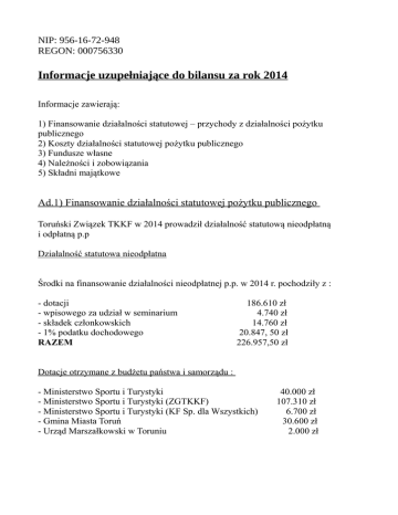 NIP: 956-16-72-948 REGON: 000756330 Informacje uzupełniające do bilansu za rok 2014 Informacje zawierają: 1) Finansowanie działalności statutowej – przychody z działalności pożytku publicznego 2) Koszty działalności statutowej pożytku publicznego 3) Fundusze własne 4) Należności i zobowiązania 5) Składni majątkowe Ad.1) Finansowanie działalności statutowej pożytku publicznego Toruński Związek TKKF w 2014 prowadził działalność statutową nieodpłatną i odpłatną p.p Działalność statutowa nieodpłatna Środki na finansowanie działalności nieodpłatnej p.p. w 2014 r. pochodziły z : - dotacji - wpisowego za udział w seminarium - składek członkowskich - 1% podatku dochodowego RAZEM 186.610 zł 4.740 zł 14.760 zł 20.847, 50 zł 226.957,50 zł Dotacje otrzymane z budżetu państwa i samorządu : - Ministerstwo Sportu i Turystyki - Ministerstwo Sportu i Turystyki (ZGTKKF) - Ministerstwo Sportu i Turystyki (KF Sp. dla Wszystkich) - Gmina Miasta Toruń - Urząd Marszałkowski w Toruniu 40.000 zł 107.310 zł 6.700 zł 30.600 zł 2.000 zł 1) Z dotacji budżetowych otrzymanych bezpośrednio z MSiT finansowany był: - dodruk wydawnictw metodyczno - szkoleniowych ,, Promowanie i wspieranie rozwoju sportu dla wszystkich'' Kwota dotacji otrzymanej – 40.000 zł 2) Z dotacji otrzymanych z MSiT poprzez Zarząd Główny TKKF finansowane były następujące akcje, kampanie prozdrowotne, imprezy sportowo-rekreacyjne: - Nordic Walking sportem dla seniora - Rytm – muzyka – taniec formą terapii i aktywności fizycznej seniorów - Trenuj z Mistrzem – wioślarstwo z Łukaszem Pawłowskim - Ogólnopolska Kampania "Miesiąc dla Zdrowia" - Równik 40076 – upowszechnianie i wzmożenie aktywności ruchowej dla wszystkich - Ogólnopolski program Bieg po Zdrowie (XXVI Bieg im. St. Bąka) - Ogólnopolski program Bieg po Zdrowie (Top Cross, Grand Prix w biegach przełajow.) - Ogólnopolski Mini Gotyk Duathlon - Światowy Dzień Marszu TAFISA - XI Ogólnopolska Konwencja Mikołajkowa Fitness - Program aktywizacji i terapi ruchowej dla osób III wieku - Promocja aktywności ruchowej dla osób z nadwagą i otyłością pod hasłem ,, Trzymaj Formę” - Nauka pływania dla osób 50 + ,, Aktywny Senior” - Sportowy Turniej Miast i Gmin (K.F. Sportu dla Wszystkich) 6.825 zł 6.825 zł 4.010 zł 30.000 zł 26.000 zł 1.600 zł 3.000 zł 5.000 zł 4.000 zł 3.000 zł 5.300 zł 7.400 zł 4.350 zł 6.700 zł 3) Z dotacji otrzymanych z Gminy Miasta Toruń finansowane były: - XXXI Toruński Miesiąc dla Zdrowia - Ośrodek Terapii Ruchowej dla osób III wieku i z nadwagą - Nauka pływania dla osób 50+ - Ogólnopolskie zawody w Mini Duathlonie dla dzieci - Top-Cross oraz 300 Maraton Tadeusza Spychalskiego - Sportowy Turniej Miast i Gmin - Udział biegaczy toruńskich w biegu Getyndze 5000 zł 12.000 zł 5.100 zł 4.000 zł 3.000 zł 1.000 zł 500 zł Z dotacji otrzymanych z Urzędu Marszałkowskiego dofinansowany był – Sportowy Turniej Miast i Gmin – 2.000 zł W 2014 roku Toruński Związek TKKF zorganizował w dniach 30.05. – 01.06. 2014r Konferencję Metodyczno – Szkoleniową pt. "Działalności programowe i organizacyjne TKKF na terenie woj. Kujawsko – Pomorskiego" oraz w dniach 17-19.10.2014r Seminarium pt. ,, Działalności programowo – organizacyjne TKKF po V Zjeździe Kujawsko – Pomorskiego Związku TKKF". Konferencje odbyły się w Kamionkach Małych, wpisowe od uczestników konferencji wynosi – 3.540 zł. Przychody z imprezy sportowo-rekreacyjnej ,, Neuca dla Zdrowia'' wynosiły 1.200 zł. Wpływy ze składek członkowskich – 14.760 zł przeznaczone były na obsługę zadań statutowych TZ TKKF. Środki otrzymane z 1% podatku dochodowego przeznaczone zostały na finansowanie działalności statutowej Międzyszkolnego Toruńskiego Klubu Pływackiego ,, Delfin'' w kwocie 13.000 zł ( zakup sprzętu, udział w zawodach, wynajem basenu), działalności statutowej Ogniska TKKF ,,Cergia” w kwocie 780 zł, działalności statutowej Ogniska TKKF Instalator -Pelikan i Uczniowskiego Klubu Biegacza w Szubinie w kwocie 2.600,02 oraz na częściowe pokrycie kosztów organizacji Konferencji Metodyczno – Szkoleniowych TKKF dla Kujawsko – Pomorskiego Związku TKKF i Seminarium w kwocie 4946,29 1) Stan środków pochodzących z 1 % podatku dochodowego na początek roku 2014 wynosił 918,81 2) Wpływy z 1 % podatku w 2014r. wynoszą 20.847,50 3) Wydatkowane środki z 1 % podatku w ciągu roku 21.326,31 4) Stan środków z 1 % podatku na koniec roku wynosi 440 zł. Działalność statutowa odpłatna Przychody z działalności statutowej odpłatnej p.p za rok 2014 wynoszą 369.188,50 zł i pochodzą z organizacji kursów rekreacji ruchowej, instruktorów sportu oraz obsługi merytorycznej kursów KOMSZ działającego przy TZ TKKF. W 2014 r. TZ TKKF zorganizował 12 kursów rekreacji ruchowej, 5 instruktorów sportu, 2 kursy przygotowawcze dla kandydatów na wychowawców wypoczynku dzieci i młodzieży. Ogółem przeszkolono 264 uczestników. Kursy rekreacji ruchowej i na wychowawców: ogółem: 163.445 zł w tym: 1) Narciarstwo zjazdowe 2) Fitness nowoczesne formy gimnastyki 3) Jazda konna 4) Fitness ćwiczenia siłowe 5) Hatha joga 6) Karate 7) Nordic walking 8) Samoobrona 9) Tenis 10) Fitness jogging 11) Część ogólna 12) Wychowawcy Kursy Instruktorów Sportu 8.185 zł 26.040 zł 7.410 zł 53.935 zł 34.260 zł 3.295 zł 3.450 zł 6.200 zł 11.230 zł 200 zł 4.440 zł 4.800 zł ogółem: 137.713,50 zł w tym: 1) Łyżwiarstwo figurowe 2) Pływanie 3) Piłka nożna (przedpłata) 4) Strzelectwo (przedpłata) 5) Koszykówka (zwrot przedpłaty) 6) Pozostałe wpływy dotyczące kursów 7) Unihokej (Kuj.-Pom. Centrum Edukacji Nauczycieli) 8) Pływanie (Kuj.-Pom. Centrum Edukacji Nauczycieli) 9) Piłka nożna (Kuj.-Pom. Centrum Edukacji Nauczycieli) Kurs nauki pływania dla osób 50+ Przychody KOMSZ za 2014r. Przychody ze sprzedaży majątku przeznaczone na cele stat