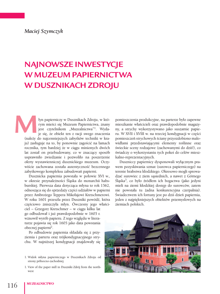 Maciej Szymczyk NAJNOWSZE INWESTYCJE W MUZEUM PAPIERNICTWA W DUSZNIKACH ZDROJU łyn papierniczy w Dusznikach Zdroju, w którym mieści się Muzeum Papiernictwa, znany jest czytelnikom „Muzealnictwa”1. Wydaje się, że obiekt ten z racji swego znaczenia (należy do najcenniejszych zabytków techniki w kraju) zasługuje na to, by ponownie zagościć na łamach rocznika, tym bardziej że w ciągu minionych dwóch lat został on przebudowany, co w znaczący sposób usprawniło zwiedzanie i pozwoliło na poszerzenie oferty wystawienniczej dusznickiego muzeum. Oczywiście zachowana została autentyczność bezcennego zabytkowego kompleksu zabudowań papierni. Dusznicka papiernia powstała w połowie XVI w., w okresie przynależności Śląska do monarchii habsburskiej. Pierwsza data dotycząca młyna to rok 1562, odnosząca się do sprzedaży części udziałów w papierni przez Ambrożego Teppera Mikołajowi Kretschmerowi. W roku 1601 przeszła przez Duszniki powódź, która częściowo zniszczyła młyn. Ówczesny jego właściciel – Grzegorz Kretschmer – w ciągu kilku lat go odbudował i już prawdopodobnie w 1605 r. wznowił wyrób papieru. Z tego względu w literaturze pojawia się rok 1605 jako data powstania obecnej papierni2. Po odbudowie papiernia składała się z przyziemia i parteru oraz trójkondygnacyjnego strychu. W najniższej kondygnacji znajdowały się 1. Widok młyna papierniczego w Dusznikach Zdroju od strony północno-zachodniej 1. View of the paper mill in Duszniki Zdrój from the northwest 116 MUZEALNICTWO pomieszczenia produkcyjne, na parterze było zapewne mieszkanie właścicieli oraz prawdopodobnie magazyny, a strychy wykorzystywano jako suszarnie papieru. W XVII i XVIII w. na trzeciej kondygnacji w części pomieszczeń strychowych ściany przyozdobiono malowidłami przedstawiającymi elementy roślinne oraz świeckie sceny rodzajowe (zachowanymi do dziś!), co świadczy o wykorzystaniu tych pokoi do celów mieszkalno-reprezentacyjnych. Duszniccy papiernicy dysponowali wyłącznym prawem pozyskiwania szmat (surowca papierniczego) na terenie hrabstwa kłodzkiego. Okresowo mogli sprowadzać surowiec z ziem sąsiednich, a nawet z Górnego Śląska3, co było źródłem ich bogactwa (jako jedyni mieli na ziemi kłodzkiej dostęp do surowców, zatem nie powstała tu żadna konkurencyjna czerpalnia). Świadectwem ich fortuny jest po dziś dzień papiernia, jeden z najpiękniejszych obiektów przemysłowych na ziemiach polskich. Nowe i zmodernizowane budynki muzealne W XVIII w. nastąpiła rozbudowa papierni o obszerny budynek suszarni. Wydarzenie to należy wiązać z perspektywami znacznego wzrostu produkcji oraz wynikającą z tego faktu koniecznością pozyskania nowych pomieszczeń do suszenia papieru. Obiekt o sześciu kondygnacjach, w całości z drewna, powstał w pierwszej połowie XVIII stulecia4. Przypuszczalnie w połowie XVIII w. wybudowano ozdobny, stylizowany na kształt wieży pawilon wejściowy do budynku głównego5. Przez pawilon i mostek można było wygodnie przejść nad rzeką Bystrzycą Dusznicką do budynku od ulicy biegnącej z Pragi przez dusznicki rynek w kierunku Kłodzka, a dalej do Wrocławia. Pawilon, obok zachodniego, ozdobionego barokową ślimacznicą szczytu wieńczącego gontowy dach papierni, stał się jednym z najbardziej charakterystycznych elementów architektonicznych młyna. Prawdopodobnie w okresie budowy pawilonu wejściowego wykonano nad oknami budynku głównego zdobienia zawierające elementy roślinne. Takie same motywy zdobnicze pojawiły się nad oknami pawilonu. Na początku XIX w., po klęsce Prus w wojnie z Napoleonem, zniesiono liczne przywileje, w tym wyłączne prawo pozyskiwania szmat na określonych terenach. Dla dusznickiej papierni nadeszły trudne lata, zakończone wystawieniem jej w 1822 r. na licytację. Młyn na ponad 100 lat przeszedł w ręce rodziny Wiehrów6. W 1834 r. zastosowano po raz pierwszy w śląskim papiernictwie maszynową technikę produkcji. W ciągu następnych kilkudziesięciu lat powstały na Dolnym Śląsku dziesiątki fabryk papieru, wykorzystujące maszyny papiernicze. Stosująca w dalszym ciągu dawną technikę produkcji papiernia w Dusznikach stopniowo podupadała. Próbą przetrwania było zainstalowanie w 1905 r. niewielkiej maszyny do produkcji tektury7. Nie pomogło to na długo. Z powodu braku możliwości konkurowania na rynku papieru z dużymi fabrykami, w latach 30. XX wieku ostatecznie zamknięto produkcję8. Już w tamtym czasie Wiehrowie myśleli o utworzeniu w uznawanym za zabytkowy młynie papierniczym muzeum techniki. Utrzymywali również kontakty z niemieckimi historykami papiernictwa, m.in. z Friedrichem von Hössle i Karlem Theodorem Weisem, co świadczy o ewentualnym profilu projektowanego muzeum9. Sami nie byli w stanie utworzyć i prowadzić takiej placówki, a co więcej, u schyłku lat 30. utrzymanie budynku było dla nich bardzo dużym ciężarem. Zmusiło ich to do przekazania obiektu miastu. Do dziś zachowały się faktury za drobne remonty w papierni wystawiane na miasto Reinerz10. Prace nad utworzeniem muzeum przerwała II wojna światowa. Po wojnie papiernia została przejęta przez Fabrykę Papieru w Młynowie, której dyrektor – Władysław Dominik – przeprowadził pewne działania zmierzające do ponownego uruchomienia produkcji papieru czerpanego. Plany te nie zostały wówczas zrealizowane z powodu jego choroby i śmierci. Papiernia przez następne lata stała niewykorzystana, ulegając stopniowej dewastacji. W 1953 r. władze miejskie podniosły problem zabezpieczenia budynku. Wówczas powstały różne koncepcje co do dalszych losów niszczejącego obiektu, m.in. rozbiórki, oddania papierni PTTK na dom noclegowy, a nawet utworzenia w nim magazynu warzyw i owoców. Dopiero w latach 60. pojawił się pomysł zorganizowania w papierni muzeum papiernictwa. Niewielka grupa entuzjastów zdołała zainteresować zabytkowym budynkiem wła