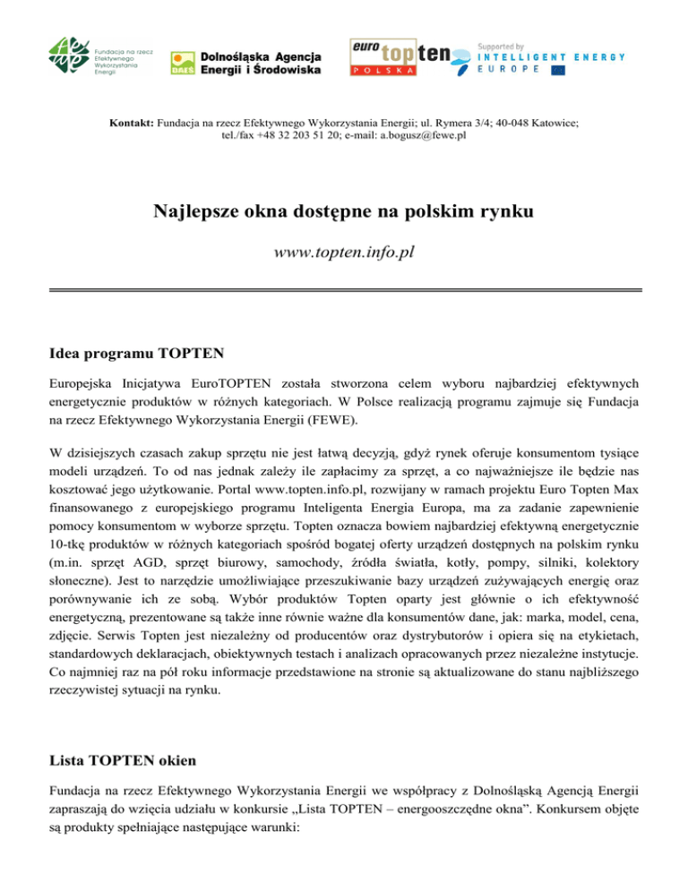 Kontakt: Fundacja na rzecz Efektywnego Wykorzystania Energii; ul. Rymera 3/4; 40-048 Katowice; tel./fax +48 32 203 51 20; e-mail: [email protected] Najlepsze okna dostępne na polskim rynku www.topten.info.pl Idea programu TOPTEN Europejska Inicjatywa EuroTOPTEN została stworzona celem wyboru najbardziej efektywnych energetycznie produktów w róŜnych kategoriach. W Polsce realizacją programu zajmuje się Fundacja na rzecz Efektywnego Wykorzystania Energii (FEWE). W dzisiejszych czasach zakup sprzętu nie jest łatwą decyzją, gdyŜ rynek oferuje konsumentom tysiące modeli urządzeń. To od nas jednak zaleŜy ile zapłacimy za sprzęt, a co najwaŜniejsze ile będzie nas kosztować jego uŜytkowanie. Portal www.topten.info.pl, rozwijany w ramach projektu Euro Topten Max finansowanego z europejskiego programu Inteligenta Energia Europa, ma za zadanie zapewnienie pomocy konsumentom w wyborze sprzętu. Topten oznacza bowiem najbardziej efektywną energetycznie 10-tkę produktów w róŜnych kategoriach spośród bogatej oferty urządzeń dostępnych na polskim rynku (m.in. sprzęt AGD, sprzęt biurowy, samochody, źródła światła, kotły, pompy, silniki, kolektory słoneczne). Jest to narzędzie umoŜliwiające przeszukiwanie bazy urządzeń zuŜywających energię oraz porównywanie ich ze sobą. Wybór produktów Topten oparty jest głównie o ich efektywność energetyczną, prezentowane są takŜe inne równie waŜne dla konsumentów dane, jak: marka, model, cena, zdjęcie. Serwis Topten jest niezaleŜny od producentów oraz dystrybutorów i opiera się na etykietach, standardowych deklaracjach, obiektywnych testach i analizach opracowanych przez niezaleŜne instytucje. Co najmniej raz na pół roku informacje przedstawione na stronie są aktualizowane do stanu najbliŜszego rzeczywistej sytuacji na rynku. Lista TOPTEN okien Fundacja na rzecz Efektywnego Wykorzystania Energii we współpracy z Dolnośląską Agencją Energii zapraszają do wzięcia udziału w konkursie „Lista TOPTEN – energooszczędne okna”. Konkursem objęte są produkty spełniające następujące warunki: zgłaszany produkt powinien być dopuszczony do legalnego obrotu w handlu na terytorium Polski, zgłaszany produkt powinien być klasyfikowany w jednej z kategorii: okna drewniane; okna aluminiowe i drewniano –aluminiowe; okna PCV. Szczegółowe zasady dostępne są na stronie internetowej projektu www.topten.info.pl w Regulaminie konkursu. Okna, które znajdą się na liście 10 najlepszych produktów w kaŜdej z podkategorii będą mogły się posługiwać poniŜszym znakiem (na podstawie odrębnej umowy): Jak przystąpić do konkursu? Uczestnikami Konkursu mogą być producenci okien, dostępnych na krajowym rynku. Warunkiem udziału w Konkursie jest przesłanie przez uczestnika Karty zgłoszeniowej produktu (okna) wraz z wymaganymi załącznikami. Zgłoszenie do Konkursu następuje poprzez przesłanie Karty zgłoszeniowej produktu wraz z załącznikami, drogą pocztową na adres: Dolnośląska Agencja Energii i Środowiska ul. Pełczyńska 11 51-180 Wrocław z dopiskiem Konkurs TOPTEN. Na podstawie tych dokumentów pracownicy DAEiŚ dokonają oceny produktu. Przekazane FEWE wyniki, zostaną opublikowane na stronie projektu www.topten.info.pl. Aktualizacja rankingu odbywać się będzie okresowo. W przypadku braków stwierdzonych w dokumentacji producenci powiadomieni zostaną pocztą elektroniczną o konieczności uzupełnienia zgłoszenia. Produkt moŜna w kaŜdej chwili wycofać z rankingu, co wymaga przesłania pocztą rejestrowaną pisemnej rezygnacji.