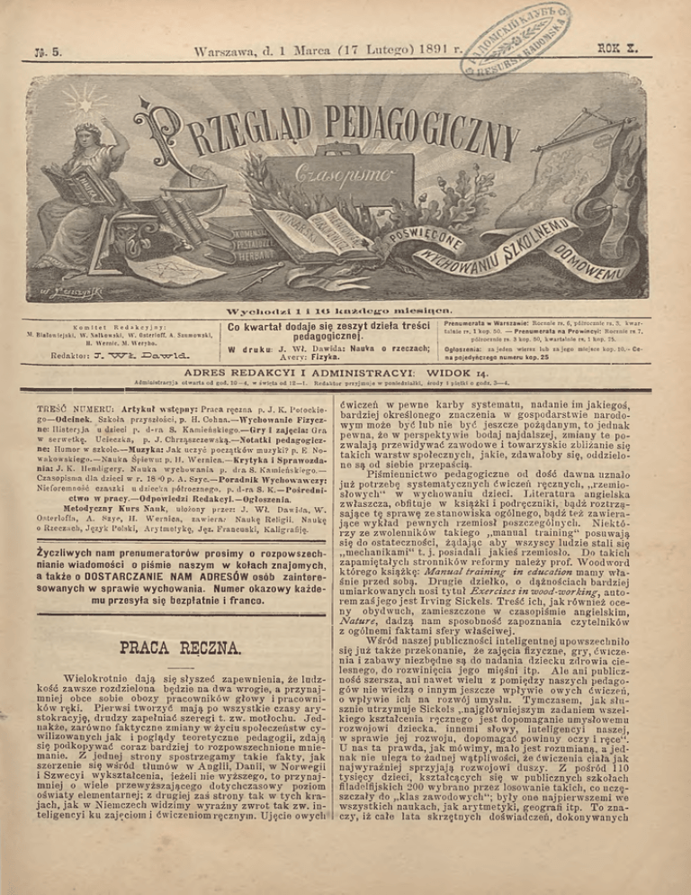 Wychodzi 1 i 1« ha/.dcgo młesitjca. Komitet Redakcyjny: M. B ia lo w ic js k i, W . N a łk o w sk i, W . O sterlo ff, A. S zum ow ski, II. W e rn ic , M. W e ry h o . R e d a k to r: CT. ■ I ^ a 'w l d . Co k w a rta ł dodaje się zeszyt dzieła tre ś c i pedagogicznej. W druku: J . W ł. Dawida: Nauka o rzeczach; Avery: Fizyka. A D R E S R E D A K C Y I I A D M IN IS T R A C Y I: A d m in istracy ja o tw a rta od go d . 1 0 —4, w św ięta od 12— 1. P r e n u m e r a t a w W a rs z a w ie : R o cznie rs. 6, p ó łro c z n ie rs. 3. k w a r ta ln ie r s . 1 k o p . 50. — P r e n u m e r a t a n a P ro w in c y i: R ocznie rs 7, p ó łro c z n ie rs. 3 ko p . 50, k w a rta ln ie rs. 1 k o p . 75. O g ło s z e n ia : z a je d e n w iersz lu b z a je g o m iejsce k o p . 1 0 . - C e n a p o je d y n c z e g o n u m e r u k o p . 2 5 W I D O K 14. R e d a k to r p rz y jm u je w p o n ie d z ia łk i, śro d y i p ią tk i o g o dz. 3— 4. TREŚĆ NUMERU: A rty k u ł w stę p n y : Praca ręczna p. J . K. Potockie go—O dcinek. Szkoła przyszłości, p. H. Cohna.—W ychow anie Fizycz ne: H isteryja u dzieci p. d -ra S. Kamieńskiego.— G ry i zaję c ia: G ra w serw etkę. Ucieczka, p. J . Chrząszczewską.—N o ta tk i p ed ag o g icz ne: Humor w szkole— M uzyka: J a k uczyć początków muzyki? p. E No wakowskiego.—N auka Śpiewu: p. H. W ern ica.—K ry ty k a i S p raw o z d a n ia : J. K. Hendigery. N auka w ychow ania p. d ra S. Kam ieńskiego.— Czasopisma dla dzieci w r. 1 8 '0 p. A. Szyc.—P o ra d n ik W ychow aw czy: Nieforemność czaszki u dziecka półrocznego, p. d -ra S. K .—P o ś re d n i ctw o w p ra c y .—O dpow iedzi R c d a k c y i.—O głoszenia. M etodyczny K u rs N auk, ułożony przez: J. W ł. Dawida, W'. Osterloffa, A. Szyc, H. W ernica, zawiera.- Naukę Religii, Naukę o Rzeczach, Język Polski, A rytm etykę, Jęz. Francuski, Kaligrafiję. Ż y c zliw y c h nam pren u m erato ró w prosim y o rozpow szech nianie w iadom ości o piśmie naszym w kołach znajom ych, a także o DO STA R C ZA N IE NAM ADRESÓW osób z a in te re sow anych w spraw ie w ychow ania. Num er okazo w y każde mu p rzesyła się bezpłatnie i fra n c o . PRACA RĘCZNA. W ielokrotnie dają się słyszeć zapewnienia, że ludz kość zawsze rozdzielona będzie na dwa wrogie, a przynaj mniej obce sobie obozy pracowników głowy i pracowni ków ręki. Pierw si tworzyć mają po wszystkie czasy arystokracyję, drudzy zapełniać szeregi t. zw. motłochu. J e d nakże, zarówno faktyczne zmiany w życiu społeczeństw cy wilizowanych ja k i poglądy teoretyczne pedagogii, zdają się podkopywać coraz bardziej to rozpowszechnione mnie manie. Z jednej strony spostrzegamy takie fakty, jak szerzenie się wśród tłumów w Anglii, Danii, w Norwegii i Szwecyi wykształcenia, jeżeli nie wyższego, to przynaj mniej o wiele przewyższającego dotychczasowy poziom oświaty elementarnej; z drugiej zaś strony tak w tych kra jach, jak w Niemczech widzimy wyraźny zwrot tak zw. inteligencyi ku zajęciom i ćwiczeniom ręcznym. Ujęcie owych ćwiczeń w pewne karby systematu, nadanie im jakiegoś, bardziej określonego znaczenia w gospodarstwie narodo wym może być lub nie być jeszcze pożądanym, to jeduak pewna, że w perspektywie bodaj najdalszej, zmiany te po zwalają przewidywać zawodowe i towarzyskie zbliżanie się takich w arstw społecznych, jakie, zdawałoby się, oddzielo ne są od siebie przepaścią. Piśmiennictwo pedagogiczne od dość dawna uznało już potrzebę systematycznych ćwiczeń ręcznych, „rzemiosłowych“ w wychowaniu dzieci. L iteratu ra angielska zwłaszcza, obfituje w książki i podręczniki, bądź roztrzą sające tę sprawę ze stanowiska ogólnego, bądź też zawiera jące wykład pewnych rzemiosł poszczególnych. N iektó rzy ze zwolenników takiego ,,manuał training“ posuwają się do ostateczności, żądając aby wszyscy ludzie stali się „mechanikami“ t. j. posiadali jakieś rzemiosło. Do takich zapamiętałych stronników reformy należy prof. Woodword którego książkę: M anual training in educałion mamy w ła śnie przed sobą. D rugie dziełko, o dążnościach bardziej umiarkowanych nosi ty tu ł Exercises in wood-working, auto rem zaś jego je st Irving Sickels. Treść ich, jak również oce ny obydwuch, zamieszczone w czasopiśmie angielskim, N a tu re, dadzą nam sposobność zapoznania czytelników z ogólnemi faktami sfery właściwej. W śród naszej publiczności inteligentnej upowszechniło się już także przekonanie, że zajęcia fizyczne, gry, ćwicze nia i zabawy niezbędne są do nadania dziecku zdrowia cie lesnego, do rozwinięcia jego mięśni itp. A le ani publicz ność szersza, ani nawet wielu z pomiędzy naszych pedago gów nie wiedzą o innym jeszcze wpływie owych ćwiczeń, o wpływie ich na rozwój umysłu. Tymczasem, jak słu sznie utrzymuje Sickels „najgłówniejszym zadaniem wszel kiego kształcenia ręcznego je st dopomaganie umysłowemu rozwojowi dziecka, innemi słowy, iuteligencyi naszej, w sprawie jej rozwoju, dopomagać powinny oczy i ręce“ . U nas ta prawda, jak mówimy, mało jest rozumianą, a je d nak nie ulega to żadnej wątpliwości, że ćwiczenia ciała jak najwyraźniej sprzyjają rozwojowi duszy. Z pośród 110 tysięcy dzieci, kształcących się w publicznych szkołach filadelfijskich 200 wybrano przez losowanie takich, co uczę szczały do „klas zawodowych“ ; były one najpierwszemi we wszystkich naukach, jak arytm etyki, geografi itp. To zna czy, iż całe lata skrzętnych doświadczeń, dokonywanych 50 P R Z E G L Ą D PE D A G O G IC Z N Y . na bardzo szeroką skalę, dowiodły, że gdy weźmiemy dwo je dzieci, jednako zdolnych, uczęszczających do tej samej szkoły i kiedy jednemu z uich pozwolimy poświęcać od 2— 4 godzin tygodniowo na rysunek, wycinanie w drzewie, cie sielkę itp., to wyprzedzi ono zawsze swego towarzysza w naukach innych, tak