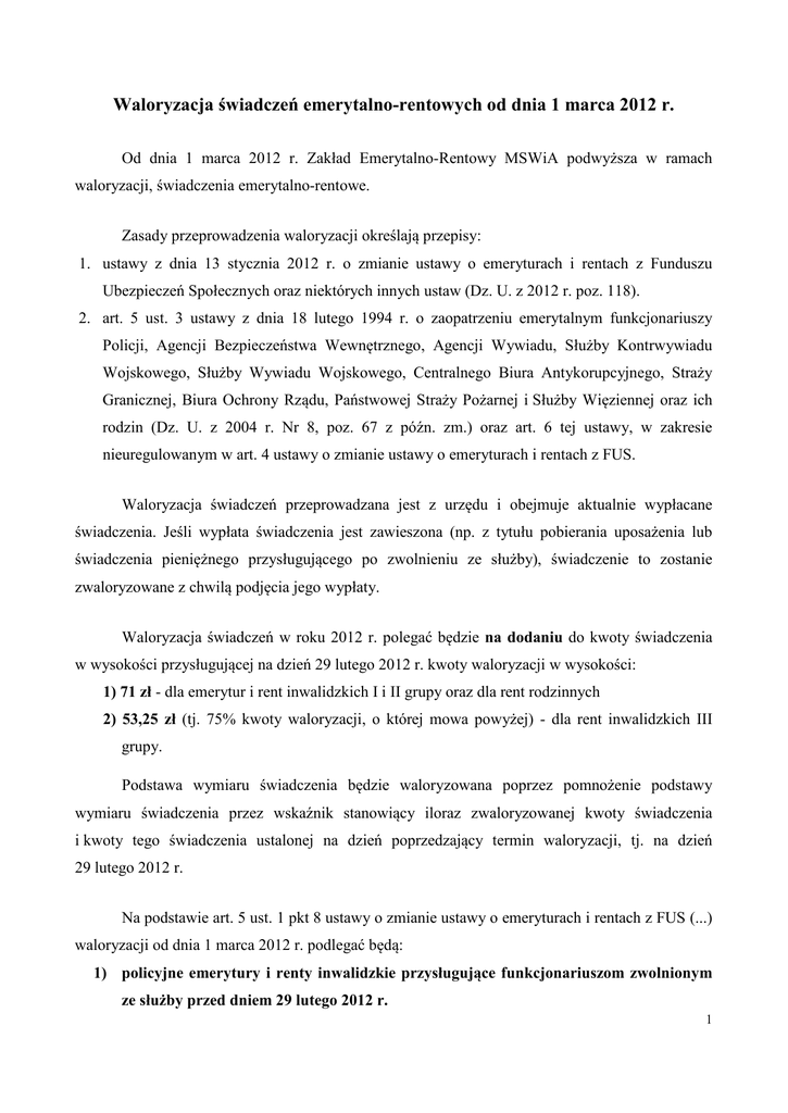 Waloryzacja świadczeń emerytalno-rentowych od dnia 1 marca 2012 r. Od dnia 1 marca 2012 r. Zakład Emerytalno-Rentowy MSWiA podwyższa w ramach waloryzacji, świadczenia emerytalno-rentowe. Zasady przeprowadzenia waloryzacji określają przepisy: 1. ustawy z dnia 13 stycznia 2012 r. o zmianie ustawy o emeryturach i rentach z Funduszu Ubezpieczeń Społecznych oraz niektórych innych ustaw (Dz. U. z 2012 r. poz. 118). 2. art. 5 ust. 3 ustawy z dnia 18 lutego 1994 r. o zaopatrzeniu emerytalnym funkcjonariuszy Policji, Agencji Bezpieczeństwa Wewnętrznego, Agencji Wywiadu, Służby Kontrwywiadu Wojskowego, Służby Wywiadu Wojskowego, Centralnego Biura Antykorupcyjnego, Straży Granicznej, Biura Ochrony Rządu, Państwowej Straży Pożarnej i Służby Więziennej oraz ich rodzin (Dz. U. z 2004 r. Nr 8, poz. 67 z późn. zm.) oraz art. 6 tej ustawy, w zakresie nieuregulowanym w art. 4 ustawy o zmianie ustawy o emeryturach i rentach z FUS. Waloryzacja świadczeń przeprowadzana jest z urzędu i obejmuje aktualnie wypłacane świadczenia. Jeśli wypłata świadczenia jest zawieszona (np. z tytułu pobierania uposażenia lub świadczenia pieniężnego przysługującego po zwolnieniu ze służby), świadczenie to zostanie zwaloryzowane z chwilą podjęcia jego wypłaty. Waloryzacja świadczeń w roku 2012 r. polegać będzie na dodaniu do kwoty świadczenia w wysokości przysługującej na dzień 29 lutego 2012 r. kwoty waloryzacji w wysokości: 1) 71 zł - dla emerytur i rent inwalidzkich I i II grupy oraz dla rent rodzinnych 2) 53,25 zł (tj. 75% kwoty waloryzacji, o której mowa powyżej) - dla rent inwalidzkich III grupy. Podstawa wymiaru świadczenia będzie waloryzowana poprzez pomnożenie podstawy wymiaru świadczenia przez wskaźnik stanowiący iloraz zwaloryzowanej kwoty świadczenia i kwoty tego świadczenia ustalonej na dzień poprzedzający termin waloryzacji, tj. na dzień 29 lutego 2012 r. Na podstawie art. 5 ust. 1 pkt 8 ustawy o zmianie ustawy o emeryturach i rentach z FUS (...) waloryzacji od dnia 1 marca 2012 r. podlegać będą: 1) policyjne emerytury i renty inwalidzkie przysługujące funkcjonariuszom zwolnionym ze służby przed dniem 29 lutego 2012 r. 1 Waloryzacja emerytur i rent inwalidzkich polegać będzie na dodaniu do kwoty policyjnych świadczeń przysługujących w dniu 29 lutego 2012 r. odpowiedniej kwoty waloryzacji, a następnie zwaloryzowaniu podstawy wymiaru tego świadczenia. Przykład: Funkcjonariusz został zwolniony ze służby z dniem 28 lutego 2012 r. Prawo do emerytury zostało ustalone od dnia 29 lutego 2012 r. Od dnia 1 marca 2012 r. podstawa wymiaru oraz świadczenie zostaną zwaloryzowane w niżej opisany sposób: Podstawa wymiaru emerytury na dzień 29 lutego 2012 r. wynosi 2500 zł Kwota emerytury przysługująca emerytowi na dzień 29 lutego 2012 r. wynosi 1685 zł Kwota emerytury po waloryzacji dokonanej od dnia 1 marca 2012 r. wynosi 1756 zł (1685 zł+71 zł) Zwaloryzowana od dnia 1 marca 2012 r. podstawa wymiaru emerytury wynosi: 2500 zł x (1756 zł : 1685 zł) = 2605,34 zł Przykład: Funkcjonariusz został zwolniony ze służby z dniem 29 lutego 2012 r. Prawo do emerytury zostało ustalone od dnia 1 marca 2012 r. W związku z tym, podstawa wymiaru oraz świadczenie nie będzie podlegało waloryzacji od dnia 1 marca 2012 r. 2) policyjne renty rodzinne, do których prawo ustalono przed dniem 1 marca 2012 r. po: a) funkcjonariuszach zmarłych do dnia 29 lutego 2012 r. (włącznie), b) emerytach i rencistach zwolnionych ze służby do dnia 28 lutego 2012 r. (włącznie). Waloryzacja polegać będzie na dodaniu do kwoty renty rodzinnej przysługującej w dniu 29 lutego 2012 r., kwoty waloryzacji w wysokości 71 zł. Przykład: Renta rodzinna przyznana została od dnia 29 lutego 2012 r. po funkcjonariuszu zmarłym w dniu 29 lutego 2012 r. Od dnia 1 marca 2012 r. kwota przyznanego świadczenia zostanie zwaloryzowana w niżej opisany sposób: Podstawa wymiaru świadczenia zmarłego na dzień 29 lutego 2012 r. wynosi 4000 zł Procentowy wymiar świadczenia zmarłego wynosi 80 % 2 Świadczenie zmarłego na dzień 29 lutego 2012 r. wynosi 3200 zł (4000 zł x 80%) Kwota renty rodzinnej na dzień 29 lutego 2012 r. wynosi 2720 zł (3200 zł x 85%) Kwota renty rodzinnej po waloryzacji wynosi 2791 zł (2720 zł + 71 zł). Waloryzacja rent rodzinnych wieloosobowych polega na dodaniu do kwoty renty rodzinnej przysługującej wszystkim uprawnionym osobom na dzień 29 lutego 2012 r. kwoty waloryzacji 71 zł. Tak zwaloryzowana renta rodzinna podlega stosownemu podziałowi. Dodatki do emerytur i rent Od dnia 1 marca 2012 r. nastąpi także podwyżka dodatków do emerytur i rent, które zostaną podwyższone poprzez pomnożenie obowiązujących w dniu 29 lutego 2012 r. kwot przez wskaźnik waloryzacji 104,8 % i będą wynosiły: 1) 195,67 zł - dodatek pielęgnacyjny, dodatek kombatancki, 2) 29,35 zł - dodatek kompensacyjny, 3) 293,51 zł - dodatek pielęgnacyjny dla inwalidy wojennego całkowicie niezdolnego do pracy i samodzielnej egzystencji, 4) 367,79 zł - dodatek dla sieroty zupełnej, 5) odpowiednio – w zależności od liczby pełnych miesięcy trwania pracy- świadczenia pieniężne dla żołnierzy zastępczej służby wojskowej przymusowo zatrudnianych w kopalniach węgla, kamieniołomach, zakładach wydobywania rud uranu i batalionach, a także świadczenia przysługujące osobom deportowanym do pracy przymusowej oraz osadzonym w obozach pracy przez III Rzeszę i ZSRR wynosić będą: - 9,81 zł – za 1 miesiąc; - 107,58 zł – za 11 miesięcy; - 19,53 zł – za 2 miesiące; - 117,45 zł – za 12 miesięcy; - 29,38 zł – za 3 miesiące; - 127,20 zł – za 13 miesięcy; - 39,11 zł – za 4 miesiące; - 136,99 zł – za 14 miesięcy; - 48,94 zł – za 5 miesięcy; - 146,76 zł – za 15 miesięcy; - 58,65 zł – za 6 miesięcy; - 156,53 zł – za 16 miesięcy; - 68,50 zł – za 7 miesięcy; - 166,37 zł – za 17 miesięcy; - 78,29 z