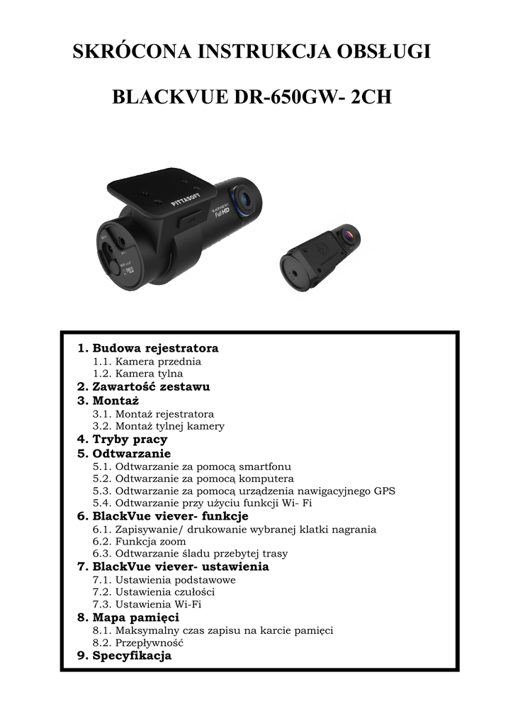 SKRÓCONA INSTRUKCJA OBSŁUGI BLACKVUE DR-650GW- 2CH 1. Budowa rejestratora 1.1. Kamera przednia 1.2. Kamera tylna 2. Zawartość zestawu 3. MontaŜ 3.1. MontaŜ rejestratora 3.2. MontaŜ tylnej kamery 4. Tryby pracy 5. Odtwarzanie 5.1. 5.2. 5.3. 5.4. Odtwarzanie Odtwarzanie Odtwarzanie Odtwarzanie za pomocą smartfonu za pomocą komputera za pomocą urządzenia nawigacyjnego GPS przy uŜyciu funkcji Wi- Fi 6. BlackVue viever- funkcje 6.1. Zapisywanie/ drukowanie wybranej klatki nagrania 6.2. Funkcja zoom 6.3. Odtwarzanie śladu przebytej trasy 7. BlackVue viever- ustawienia 7.1. Ustawienia podstawowe 7.2. Ustawienia czułości 7.3. Ustawienia Wi-Fi 8. Mapa pamięci 8.1. Maksymalny czas zapisu na karcie pamięci 8.2. Przepływność 9. Specyfikacja 1. BUDOWA REJESTRATORA 1.1. Kamera przednia BLOKADA UCHWYTU OBIEKTYW GNIAZDO ZASILANIA WEJŚCIE VIDEO Z TYLNEJ KAMERY POKRYWA GNIAZDO KARTY UCHWYT MONTAśOWY MICRO SD WI-FI/ RESET (WI-FI wł./wył. poprzez krótkotrwałe wciśnięcie) (RESERT poprzez wciśnięcie na min. 10 sekund) KONTROLKA PRACY KONTROLKA NAGRYWANIA KONTROLKA WI-FI GŁOŚNIK REJESTRACJA DŹWIĘKU (wł./wył.) KONTROLKA GPS 1.2. Kamera tylna UCHWYT MONTAśOWY OBIEKTYW WYJŚCIE VIDEO DO PRZEDNIEJ KAMERY KONTROLKA PRACY 2. ZAWARTOŚĆ ZESTAWU REJESTRATOR PRZEWÓD AV KAMERA TYLNA UCHWYTY MONTAśOWE 3. PREWÓD ZASILAJĄCY ADAPTER USB KARTA MICRO SD TAŚMA DWUSSTRONNA MONTAś 3.1. MontaŜ rejestratora 1. 2. 3. Otwórz pokrywę i umieść kartę micro SD w urządzeniu. Odtłuść powierzchnię szyby i usuń z niej wszelkie zanieczyszczenia w miejscu montaŜu rejestratora . Zdejmij folię zabezpieczającą z uchwytu. 4. 5. 6. Przytwierdź uchwyt do szyby mocno dociskając. Rozprowadź i podłącz przewód zasilający. Ustaw we właściwej pozycji obiektyw rejestratora. 3.2. MontaŜ tylnej kamery 1. 2. 3. Odtłuść powierzchnię szyby i usuń z niej wszelkie zanieczyszczenia w miejscu montaŜu kamery . Zdejmij folię zabezpieczającą i przyklej kamerę do szyby mocno dociskając. Następnie rozprowadź przewód AV i połącz za jego pomocą kamerę z rejestratorem. Ustaw we właściwej pozycji obiektyw kamery. UWAGA! W celu zabezpieczenia akumulatora pojazdu przed rozładowaniem, zaleca się stosowanie urządzenia Blackvue Power Magic PRO. 4. TRYBY PRACY Nagrywanie w trybie „normal” Po włączeniu zapłonu rejestrator samoczynnie rozpocznie pracę w trybie „normal”. Zapis na karcie pamięci następuje w tzw. pętli. Maksymalny czas nagrania uzaleŜniony jest od pojemności nośnika i wybranej rozdzielczości rejestracji i kompresji (rozdział 8). Nagrywanie w trybie „parking” JeŜeli urządzenie podczas pracy w trybie „normal” nie wykryje ruchu przez czas co najmniej 5 min. wówczas automatycznie przełączy się w tryb pracy „parking”. Podczas pracy w trybie „parking” rejestracja nastąpi tylko w przypadku gdy czujnik ruchu wykryje ruch przed obiektywem kamery lub gdy czujnik wstrząsu zarejestruje przeciąŜenie o odpowiedniej sile (rozdział 7.2). Podczas pracy rejestratora w trybie „parking” zapis odbywa się z szybkością 15 fps., a funkcja GPS nie jest aktywna. Nagrywanie w trybie „event” JeŜeli czujnik wstrząsu podczas pracy rejestratora w trybie „normal” lub w trybie „parking” wykryje wstrząs o odpowiedniej sile (rozdział 7.2), wówczas urządzenie rozpocznie pracę w trybie „event”. W takim przypadku 5 sekund zapisu przed zarejestrowaniem przeciąŜenia oraz- w zaleŜności od dokonanych ustawień -55 lub 115 sekund zapisu po jego wystąpieniu zostanie zabezpieczone przed skasowaniem (nadpisaniem). 5. ODTWARZANIE 5. 1. Odtwarzanie za pomocą smartfonu Do odtwarzania zapisu moŜna wykorzystać smartfony obsługujące karty micro SD. 1. Odłącz rejestrator od zasilania i wyjmij kartę micro SD. 2. Umieść kartę pamięci w smartfonie. 3. Otwórz aplikację odtwarzacza video i wybierz plik, który chcesz odtworzyć. UWAGA! Odtwarzanie za pomocą smartfonów moŜe róŜnić się w zaleŜności od ich modelu. Zaleca się sprawdzenie dotyczące odtwarzania plików video w instrukcjach poszczególnych urządzeń. Niektóre smartfony mogą nie obsługiwać plików w rozdzielczości full HD. 5. 2. Odtwarzanie za pomocą komputera 1. Wyjmij kartę micro SD z rejestratora i włóŜ ją do adaptera dołączonego do zestawu. 2. Połącz adapter z komputerem poprzez gniazdo USB. 3. Otwórz aplikację przeznaczoną do odtwarzania zarejestrowanych nagrań. Następnie z dysku wymiennego wybierz Ŝądany plik. Do odczytu wszystkich danych zarejestrowanych przez rejestrator zalecane jest skorzystanie z oprogramowania BlackVue Viever (rozdział 6). 5. 3. Odtwarzanie za pomocą urządzenia nawigacyjnego GPS 1. Wyjmij kartę micro SD z rejestratora i włóŜ ją do adaptera dołączonego do zestawu . 2. Połącz adapter z urządzeniem nawigacyjnym poprzez gniazdo USB. 3. Otwórz aplikację przeznaczoną do odtwarzania zarejestrowanych nagrań. Następnie z dysku wymiennego wybierz Ŝądany plik. UWAGA! Odtwarzanie na urządzeniach nawigacyjnych GPS moŜe róŜnić się w zaleŜności od modelu nawigacji. Zaleca się sprawdzenie dotyczące odtwarzania plików video w instrukcjach poszczególnych systemów nawigacyjnych. Niektóre standardy nawigacji GPS mogą nie obsługiwać plików rozdzielczości full HD. 5. 4. Odtwarzanie przy uŜyciu funkcji Wi- Fi 1. Pobierz, zainstaluj i otwórz aplikację BlacVue na smartfonie. Aplikację moŜna pobrać poprzez sklepy Google Play, Apple App lub Windows UWAGA! Do poprawnego działania aplikacji BlackVue wymagany jest co najmniej system Android 2.3, iOS 5.0 lub Windows 8. 0 W zaleŜności od modelu smartfonu niektóre funkcje aplikacji BlackVue mogą być niedostępne. 2. Naciskając przycisk na obudowie rejestratora włącz funkcję Wi-Fi (rys. 5.1) 3. Naciśnij przycisk Wi-Fi w aplikacji BlackVue. Wybierz urządzenie, z którym chcesz się połączyć (rys. 5.2) i wprowadź hasło inicjacyjne (rys. 5.3).