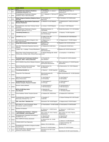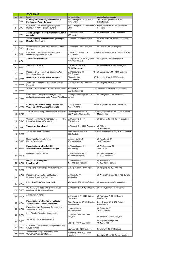 PODLASKIE B/A1 firma Przedsiębiorstwo Usługowo-HandlowoProdukcyjne Ambit Sp. z o.o adres siedziby 15-186 Białystok, ul. Jaracza 1 www.ambit.pl 2 B/A2 Przedsiębiorstwo Produkcyjno-UsługowoHandlowe "HALS" Halina Korzyńska 15-111 Białystok ul. 1000-lecia PP Koplany Folwark 16-061 Juchnowiec 31/2 Kościelny 3 B/A3 Zakład Usługowo-Handlowy Składnica Złomu; ul. Poznańska 118 400 Łomża Jan Łuba B/A4 Zakład Naprawy Samochodów Ciężarowych, Mirosław Wasilewski ul. Wiadukt 8 15-327 Białystok 4 ul. Białostocka 6A 16-062 Juchnowiec Górny 5 B/A5 Przedsiębiorstwo „Auto-Szrot” Andrzej i Dorota Gromińscy ul. Liniowa 4 15-587 Białystok ul. Liniowa 4 15-587 Białystok 6 B/A7 Przedsiębiorstwo Produkcyjno-UsługowoHandlowe „Agromech” sp. Z o.o. Osiedle Buchwałowo 10 100 Sokółka Transdźwig Zawadzcy s.j. B/A8 ul. Wypusty 7 16-300 Augustów www.transdzwig.pl ul. Wypusty 7 16-300 Augustów 7 8 B/A9 „EKOMIR” Sp. z o.o. ul. Ciołka 12 lok. 428 01-402 Warszawa ul. Elewatorska 29 15-620 Białystok 9 B/A10 Przedsiębiorstwo Handlowo-Usługowe „AutoZłom” Jerzy Konecko ul. Magazynowa 11 200 Grajewo 10 B/A11 Usługi Motoryzacyjne Marek Rytelewski Długobórz II/33 300 Zambrów 11 B/A12 „Auto-Złom” Mechanika Pojazdowa Kazimierz Piekarski ul. Kolejowa 8d 18-500 Kolno 12 B/A13 „TOMEX” Sp. J. Jadwiga i Tomasz Miliszkiewicz Zadobrze 26 230 Ciechanowiec 13 B/A14 14 B/A15 Przedsiębiorstwo Produkcyjno-HandlowoUsługowe „MAG” Andrzej Grabowski 15 B/A16 AUTO-HANDEL Skup Złomu Wiesław Kierlewicz Osipy Lepertowizna 15 200 Wysokie Mazowieckie 16 B/A18 Centrum Recyklingu Samochodowego Ptaszyński, Krzysztof Tymoszuk 17 B/A19 18 B/A22 19 lp. kod 1 adres stacji demontażu 16-002 Dobrzyniewio Duże, ul. Białostocka 27 18- ul. Poznańska 118 18-400 Łomża 16- Osiedle Buchwałowo 10 16-100 Sokółka 19- ul. Magazynowa 11 19-200 Grajewo 18- Długobórz II/33 18-300 Zambrów ul. Kolejowa 8d 18-500 Kolno 18- Zadobrze 26 18-230 Ciechanowiec Stacja Paliw i Usług Transportowych Józef ul. Wojska Polskiego 99, 18-400 Andrzej Łada, Jarosław Łada, Andrzej Paweł Łada Łomża Rafał ul. Przytulska 54 420 Jedwabne ul. Łomżyńska 11 14-430 Wizna 18- ul. Przytulska 54 18-420 Jedwabne 18- Osipy Lepertowizna 15 18-200 Wysokie Mazowieckie ul. Baranowicka 119, 501 Białystok 15-ul. Baranowicka 119, 15-501 Białystok Transdźwig Zawadzki s.j. ul. Wypusty 1 , 16-300 Augustów "Grupa-Eko” Piotr Żebrowski Wola Zambrowska 201, 300 Zambrów B/A23 Naprawa aut powypadkowych Mariusz Woronowicz ul. Jana Pawła II/1 16-100 Sokółka ul. Jana Pawła II/1 16-100 Sokółka 20 B/A24 Przedsiębiorstwo Kon-Pol S.C. Wiesław Konopko, Wojciech Konopko ul. Wodociągowa 21 18-100 Łapy ul. Wodociągowa 21 18-100 Łapy Numenor Jakub Jodłowski 21 B/A25 ul. Ciechanowiecka 71 17-300 Siemiatycze ul. Ciechanowiecka 71 17-300 Siemiatycze 22 B/A26 METAL ZŁOM Skup złomu Irena Bazyluk ul. Rejonowa 3C, 17-100 Bielsk Podlaski ul. Rejonowa 3C, 17-100 Bielsk Podlaski Firma Handlowa "Kolmet" Krystyna Syrowik ul. Kolejowa 3B, 18-500 Kolno ul. Kolejowa 3B, 18-500 Kolno 23 B/A27 Przedsiębiorstwo Usługowo Handlowe Motoryzacji „Motozbyt” Sp. z o.o. ul. Suwalska 77 19-300 Ełk ul. Wojska Polskiego 98 16-400 Suwałki PHU „Auto Złom” Stanisław Król Woźnawieś 79A 19-206 Rajgród ul. Magazynowej 8 19-200 Grajewo METLAND S.C. Józef Chmielewski, Marek Chmielewski, Jacek Chmielewski ul. Przemysłowa 4 16-400 Suwałki ul. Przemysłowa 4 16-400 Suwałki B/A28 24 25 B/A29 26 B/A30 27 B/A31 28 B/A32 Przedsiębiorstwo Handlowo – Usługowe „AUTO-SERWIS” Antoni Staniórski 29 B/A33 Przedsiębiorstwo Gospodarki Komunalnej w Suwałkach Sp. z o.o. 30 B/A34 Zdzisław Chmielewski PHU COMPLEX Andrzej Jakubowski B/A35 32 B/A36 Przedsiębiorstwo Handlowo-Usługowe AutoMet Krzysztof Duda B/A37 „Auto Handel” Skup - Sprzedaż Części Używanych Wojciech Mielech 33 18- Wola Zambrowska 201, 18-300 Zambrów ul. Fabryczna 7 16-020 Czarna Białostocka ul. Fabryczna 7 16-020 Czarna Białostocka Stary Cydzyn 32 18-421 Piątnica Poduchowna Stary Cydzyn 32 18-421 Piątnica Poduchowna ul. Sejneńska 82 16-400 Suwałki ul. Sejneńska 82 16-400 Suwałki ul. Witosa 23 lok. 64, 15-660 Białystok ul. Zalesie 47 15-585 Białystok Zabiele 170A 18-500 Kolno ul. Wojska Polskiego 183 18-402 Łomża Szymany 70 19-200 Grajewo Szymany 70 19-200 Grajewo Iwanówka 40 18-106 Turośń Kościelna Iwanówka 40 18-106 Turośń Kościelna „TRANS-ZŁOM” Ewa Filipkowska 31 ul. Różana 1 16-400 Suwałki 34 B/A38 35 B/A39 36 B/A40 37 B/A41 38 B/A42 MARKEL Sp. z o.o. Eco Recycling Poland Sp. z o.o. PW GINA Grażyna Truszkowska AJ TRUCK Sp. z o.o. WĘGLOTEX Urszula Tiuryn Krypno Kościelne 25 19-111 Krypno Kościelne Krypno Kościelne 25 19-111 Krypno Kościelne ul. Polna 2 lok. 1 16-010 Wasilków ul. Ks. J. Popiełuszki 113 15-620 Białystok Grzymały Szczepankowskie 23A 18-402 Łomża Grzymały Szczepankowskie 23A 18-402 Łomża ul. Podrzeczna 2 16-060 Zabłudów ul. Podrzeczna 2 16-060 Zabłudów Kuriany 75 15-513 Kuriany Kuriany 75 15-513 Kuriany adres siedziby Nowa Wieś 86 88-324 Jeziora Wielkie adres stacji demontażu Nowa Wieś 86 88-324 Jeziora Wielkie KUJAWSKO - POMORSKIE kod 39 C/1 40 C/2 firma Przedsiębiorstwo Wielobranżowe „POLZŁOM” Spółka Jawna H. G .Leszczyńscy Spółdzielnia Transportu Wiejskiego w Bydgoszczy Lipniki 86-005 Białe Błota Lipniki 86-005 Białe Błota Firma HandlowoUsługowa „DIADA” Spółka Jawna Mariola i Edward Sikora Firma Wielobranżowa Krystyna Pietrzak 86-200 Chełmno ul. Przemysłowa 9 86-200 Chełmno ul. Przemysłowa 9 Cieślin 10 88-100 Inowrocław Cieślin 10 88-100 Inowrocław „Jankowski” AUTO-HANDEL Mariusz Jankowski ul. Lipowa 4 87-860 Chodecz ul. Zwycięstwa 31 87-860 Chodecz Zakład Usługowo-Handlowy Łucja Szymielewicz ul. Świerkowa 5 87-300 Brodnica ul. Świerkowa 5 87-300 Brodnica Firma Usługowo-Handlowa GRAND Andrzej Twarowski Olsztyńska 137 87-100 Toruń Olsztyńska 137 87-10