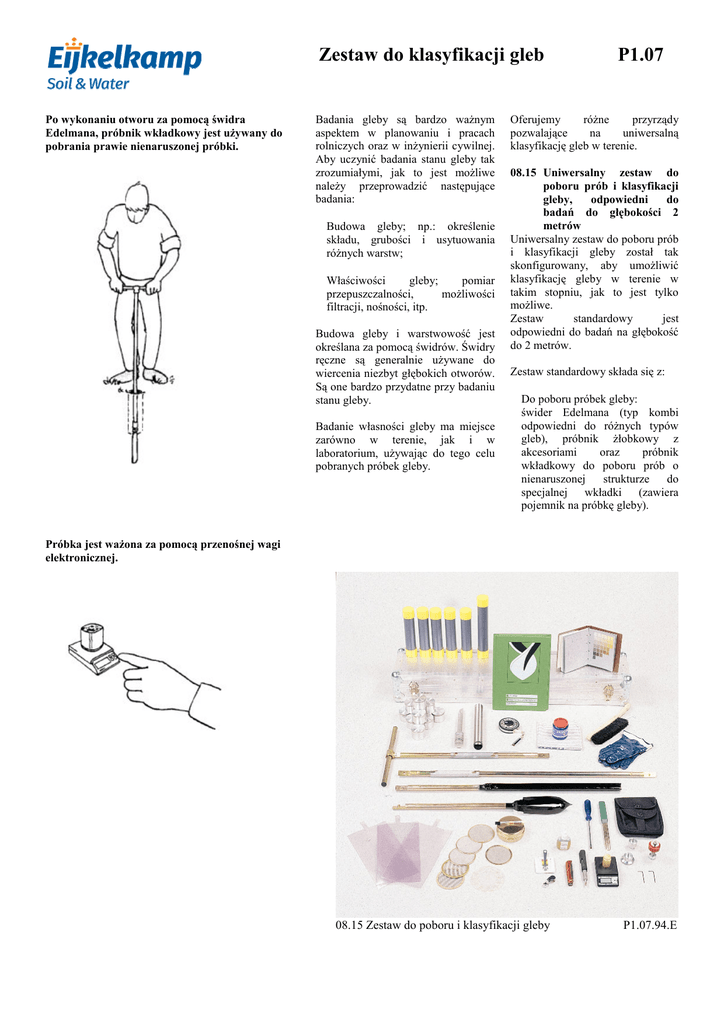 Zestaw do klasyfikacji gleb Po wykonaniu otworu za pomocą świdra Edelmana, próbnik wkładkowy jest używany do pobrania prawie nienaruszonej próbki. Badania gleby są bardzo ważnym aspektem w planowaniu i pracach rolniczych oraz w inżynierii cywilnej. Aby uczynić badania stanu gleby tak zrozumiałymi, jak to jest możliwe należy przeprowadzić następujące badania: Budowa gleby; np.: określenie składu, grubości i usytuowania różnych warstw; Właściwości gleby; pomiar przepuszczalności, możliwości filtracji, nośności, itp. Budowa gleby i warstwowość jest określana za pomocą świdrów. Świdry ręczne są generalnie używane do wiercenia niezbyt głębokich otworów. Są one bardzo przydatne przy badaniu stanu gleby. Badanie własności gleby ma miejsce zarówno w terenie, jak i w laboratorium, używając do tego celu pobranych próbek gleby. P1.07 Oferujemy różne przyrządy pozwalające na uniwersalną klasyfikację gleb w terenie. 08.15 Uniwersalny zestaw do poboru prób i klasyfikacji gleby, odpowiedni do badań do głębokości 2 metrów Uniwersalny zestaw do poboru prób i klasyfikacji gleby został tak skonfigurowany, aby umożliwić klasyfikację gleby w terenie w takim stopniu, jak to jest tylko możliwe. Zestaw standardowy jest odpowiedni do badań na głębokość do 2 metrów. Zestaw standardowy składa się z: Do poboru próbek gleby: świder Edelmana (typ kombi odpowiedni do różnych typów gleb), próbnik żłobkowy z akcesoriami oraz próbnik wkładkowy do poboru prób o nienaruszonej strukturze do specjalnej wkładki (zawiera pojemnik na próbkę gleby). Próbka jest ważona za pomocą przenośnej wagi elektronicznej. 08.15 Zestaw do poboru i klasyfikacji gleby P1.07.94.E Zestaw do klasyfikacji gleb Kolor gleby jest klasyfikowany poprzez jego porównanie ze standardowymi kolorami w atlasie kolorów gleb. Kwasowość lub pH gleby jest określane za pomocą wskaźnika pH. Wskaźnik ten, o zakresie pH 4 do 9, daje ogólny odczyt pH z dokładnością 0,5. Do określania własności fizycznych gleby w zestawie znajdują się: komplet mini sit, wzornik granulacji piasku, przenośna waga elektroniczna, atlas kolorów gleb, penetrometr kieszonkowy i kieszonkowy miernik naprężeń stycznych, szkło powiększające i nóż kieszonkowy. W zestawie znajduje się również prosty przyrząd („świstawka”) z taśmą pomiarową do pomiaru poziomu wody. Młotek geologiczny jest używany do odbijania kawałków kamienia (skały). Inne akcesoria: żerdź penetracyjna z włókna szklanego (do badania gleby w celu uniknięcia natknięcia się na przeszkody, np.: kable i rury, i ich ewentualnego przecięcia), aluminiowe pojemniki na próbki gleby, dziennik do badań terenowych, zestaw konserwujący, rękawice robocze i aluminiowa skrzynka transportowa. Młotki geologiczne P1.07 08.11 Atlasy kolorów gleb Określanie podgrup w systemie klasyfikacji gleby jest oparte, między innymi, o różnice kolorów. Kolor gleby jest określany poprzez porównanie próbki z kolorami w atlasie kolorów gleb (wg Munsell’a). 99.07 Młotki geologiczne Młotki geologiczne są dostępne z zakończeniami punktowymi oraz płaskimi. Są one używane do określania wstępnej twardości gleb lub skał, usuwania skamieniałości, pobierania próbek skał, opróżniania próbników żłobkowych i wielu innych zadań. 99.08 Pojemniki na próbki Są różne sposoby przechowywania i transportu próbek gleby, wody i roślinności, takie jak: aluminiowe pojemniki, butelki plastikowe, rynienki na próbki i różne rodzaje szklanych butelek. Niektóre z pojemników na próbki mogą być transportowane w trwałej, aluminiowej skrzynce transportowej. Atlas kolorów gleb Przedstawicielstwo firmy Eijkelkamp Soil & Water w Polsce: GEOMOR-TECHNIK Sp. z o.o., ul. Modra 30, 71-220 Szczecin, tel. 91-482-00-90, tel./fax. 91-482-60-87, e-mail: [email protected] internet: www.geomor.com.pl Butelki i aluminiowe puszki na próbki