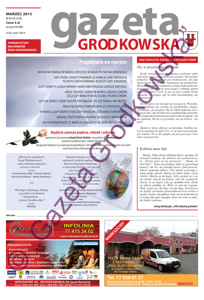 Marzec 2013 Nr 03-03 (124) cena 3 zł (w tym 5% VAT) a” iSSn 1425-3879 ko ws k towarzystwo MiłoŚnikÓw zieMi GrodkowskieJ Przysłowia na marzec JaK nie ma śniegu w maRcu, DeSZcZu w maJu, to nie ma uRoDZaJu. gDy PRZeD ZwiaStowaniem (25 maRca) ŻaBy RZegocą, to im Po ZwiaStowaniu JeSZcZe gĘBy ZmaRZną. guSt KoBiety, łaSKa PańSKa i maRcowa PogoDa ZawSZe nieStałe. KieDy StaRZec cHoRy w maRcu, BĘDZie ZDRów, LecZ gDy BaBa w maJu SłaBa, PacieRZ Zmów. gDy na świĘty JóZeF BocieK PRZyBĘDZie, to JuŻ śniegu nie BĘDZie. mgła na ZwiaStowanie ZnacZy RZeK RoZLanie. w maRcu, gDy gRZmot na LoDy SPaDa, w Lecie gRaD ZaPowiaDa. Gr od maRZec PRZycHoDZi wiLKiem, oDcHoDZi BaRanKiem. JaK Po BeneDyKcie (21 maRca) ciePło, to i w Lecie BĘDZie PieKło. Bądźciezawszepiękne,młodeizdrowe. Serdeczne życzenia zokazjiDniaKobiet wszystkim Czytelniczkom „Gazety Grodkowskiej” składa Redakcja. Do życzeń dołącza się również Urząd Miasta i Gminy Grodków z burmistrzem na czele oraz Starostwo Powiatowe w Brzegu. Zdrowych i pogodnych Świąt Wielkanocnych - miłej rodzinnej atmosfery, wiosny w sercach życzą © Starosta Powiatu Brzeskiego Maciej Stefański, Wicestarosta Powiatu Brzeskiego Ryszard Jończyk oraz Przewodniczący Rady Powiatu Brzeskiego Henryk Mazurkiewicz wraz z Radnymi Kobieta mnie bije Skarga. Takie skargi składają dzieci, apelując do wyższych instancji: do rodziców, do wychowawczyni. „Proszę pani, on się przezywa!”. „Mamo, on mnie bije!”. Same nie poradzą, słabe są, potrzebują pomocy. Ale też: nie potrafią stawić czoła przeciwnikowi, pokazują słabość, żeby zdobyć przewagę w mniej godny sposób. Skarżą się ludzie słabi, często tchórze. Skarżą się do kogoś, żeby uzyskać to, o co im chodzi; skarżą się komuś, żeby im współczuł; skarżą się na kogoś, żeby go spotkała kara. Kiedy się skarżę, poddaję się. Wiem, że sam nie wygram. Może wygra ten, do kogo się odwołuję. Zwycięstwa nie będzie, ale będzie sprawiedliwość (a to ważne w ogóle) i będzie satysfakcja, może nawet konkretna (a to ważne dla mnie samego). Ktoś coś zrobi za mnie, ale będzie zrobione. e! ! Jerzy Bralczyk „444 zdania polskie” zc i „G rekLaMy Zdanie to mniej dotyczy eschatologii, bardziej naszych codziennych zgub. Coś, co się nam zawieruszyło, jest. Gdzieś. To, że nie zginęło, ma nas pocieszyć. Czujemy się pocieszeni. es Redakcja Nic nie ginie i nic nowego się nie pojawia. Wszystko, co jest, zmienia się, rozwija się, przekształca, mutuje, wyrodnieje - ale nie ginie. My też. Może będziemy żyć w kłosach zbóż, jak chciała nieco grafomańska piosenka, może będziemy kolejnymi pastwami różnych żyjątek - ale nie zginiemy. Bo nic w przyrodzie, nic na świecie - nie ginie. ar Wesołego rodzinnego Alleluja wszystkim Czytelnikom i Sympatykom „Gazety Grodkowskiej” życzy Kiedy, prostaczkowie, próbujemy wyobrazić sobie cały świat, może nas ogarniać przerażenie. Nie możemy pomyśleć, że wszechświat jest nieskończony, ale jego skończoność jest jeszcze trudniejsza do pomyślenia. Wyobrażenie stałości elementów świata, brak możliwości pojawienia się nowych spoza niego i znikania gdzieś poza nim (gdzie?) tych, co już są, jest z jednej strony naturalne - z drugiej, gdy to sobie uświadomimy, nie do zniesienia. n *** Nic w przyrodzie nie ginie Najserdeczniejsze życzenia radosnych, pełnych nadziei świąt Zmartwychwstania Pańskiego, w otoczeniu Rodziny i przyjaciół oraz wesołych przeżyć związanych z Wielkanocnymi zwyczajami – mokrym dyngusem, kolorowymi pisankami, prezentami od zajączka i słodkiego baranka życzą az et a Przewodniczący Rady – Dariusz Gajewski Burmistrz Grodkowa – Marek Antoniewicz Jerzy BraLczyk Porzekadła na kaŻdy dzień Pizza i inne dania z restaUracJi „Pod złotyM LweM” na telefon, z dowozem do twojego domu tel. 77 556 01 27 zlecenia przyjmujemy w godz. 13:00 - 22:00 zamówienia powyżej 20 zł - dowóz na terenie Grodkowa Gratis!!! wieści z gminy i powiatu Markiem Antoniewiczem rozmawiała Ryszarda Krokowa Pytania do burmistrza © Gmina przejmuje Na własność dworzec kolejowy. A jakie ma względem niego plany? Do końca lutego mamy doprecyzować umowę w/s przejęcia przez gminę obiektu dworca z przylegającą działką. Na pewno utrzymamy funkcję zwią- Publicznej w Grodkowie. Zaniepokoiły mnie kierowane do gazety pytania o rzekome zagrożenia dla naszego Ośrodka Pomocy Społecznej w związku z tym, że w Brzegu ma powstać duży ośrodek, który wchłonie również nasz. Czy to tylko plotki? Być może jest to spowodowane informacjami, które płyną z Ministerstwa Administracji i Cyfryzacji, które konsultuje obecnie sprawę łączenia samorządów czy różnych instytucji samorządowych. Natomiast my takich oficjalnych informacji nie posiadamy i raczej nie przewidujemy, aby taka rozległa gmina nie posiadała na swoim ternie OPS-u. Na potwierdzenie tego może świadczyć fakt, że próbujemy zainwestować w opiekę- mam na myśli nową jej siedzibę. Od ubiegłego roku mówi się o likwidacji Biblioteki Pedagogicznej. Jak wygląda sprawa na dzisiaj? Sejmik Województwa Opolskiego na sesji w dniu 15 stycznia podjął uchwałę w sprawie zamiaru likwidacji swoich filii w Głubczycach, Krapkowicach, Namysłowie, Oleśnie, Prudniku, Strzelcach Opolskich i Grodkowie. W celu utrzymania naszej fili w Grodkowie na sesji 6 lutego Rada Miejska podjęła uchwałę w sprawie udzielenia pomocy finansowej Samorządowi Województwa Opolskiego na dofinansowanie funkcjonowania biblioteki pedagogicznej w Grodkowie do lipca b.r. Od sierpnia biblioteka (jej zbiory z jednym pracownikiem zatrudnionym na podstawie umowy o pracę) zostanie przejęta przez Gminę. Po analizie księgozbioru jego część może zostać przekazana np. do szkół, natomiast główny zasób będzie nadal funkcjonował w strukturach Miejskiej i Gminnej Biblioteki Radio Opole podało w 