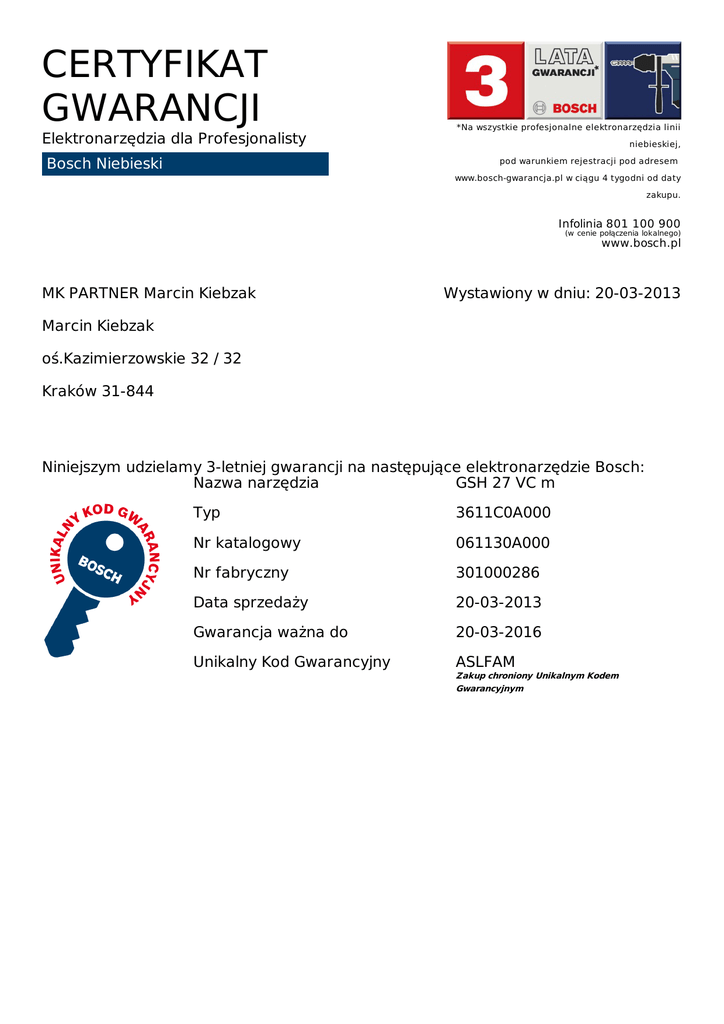 CERTYFIKAT GWARANCJI Elektronarzędzia dla Profesjonalisty Bosch Niebieski *Na wszystkie profesjonalne elektronarzędzia linii niebieskiej, pod warunkiem rejestracji pod adresem www.bosch-gwarancja.pl w ciągu 4 tygodni od daty zakupu. Infolinia 801 100 900 (w cenie połączenia lokalnego) www.bosch.pl MK PARTNER Marcin Kiebzak Wystawiony w dniu: 20-03-2013 Marcin Kiebzak oś.Kazimierzowskie 32 / 32 Kraków 31-844 Niniejszym udzielamy 3-letniej gwarancji na następujące elektronarzędzie Bosch: Nazwa narzędzia GSH 27 VC m Typ 3611C0A000 Nr katalogowy 061130A000 Nr fabryczny 301000286 Data sprzedaży 20-03-2013 Gwarancja ważna do 20-03-2016 Unikalny Kod Gwarancyjny ASLFAM Zakup chroniony Unikalnym Kodem Gwarancyjnym