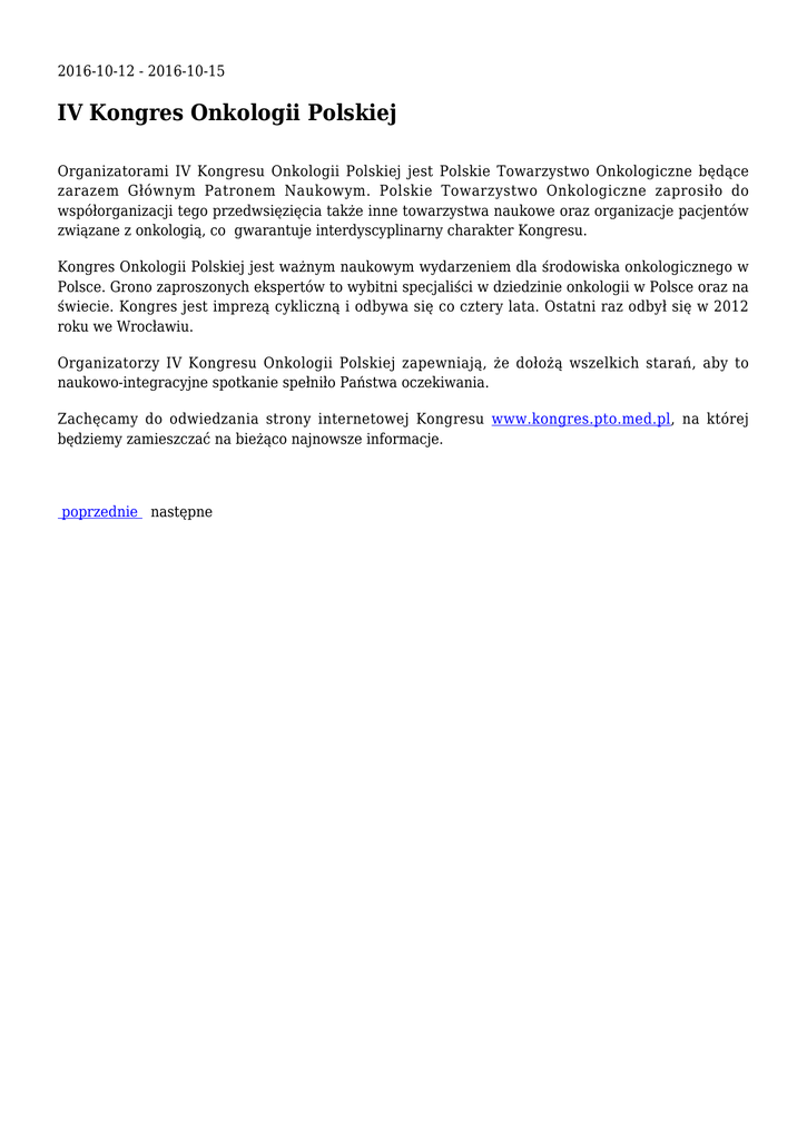 2016-10-12 - 2016-10-15 IV Kongres Onkologii Polskiej Organizatorami IV Kongresu Onkologii Polskiej jest Polskie Towarzystwo Onkologiczne będące zarazem Głównym Patronem Naukowym. Polskie Towarzystwo Onkologiczne zaprosiło do współorganizacji tego przedwsięzięcia także inne towarzystwa naukowe oraz organizacje pacjentów związane z onkologią, co gwarantuje interdyscyplinarny charakter Kongresu. Kongres Onkologii Polskiej jest ważnym naukowym wydarzeniem dla środowiska onkologicznego w Polsce. Grono zaproszonych ekspertów to wybitni specjaliści w dziedzinie onkologii w Polsce oraz na świecie. Kongres jest imprezą cykliczną i odbywa się co cztery lata. Ostatni raz odbył się w 2012 roku we Wrocławiu. Organizatorzy IV Kongresu Onkologii Polskiej zapewniają, że dołożą wszelkich starań, aby to naukowo-integracyjne spotkanie spełniło Państwa oczekiwania. Zachęcamy do odwiedzania strony internetowej Kongresu www.kongres.pto.med.pl, na której będziemy zamieszczać na bieżąco najnowsze informacje. poprzednie następne