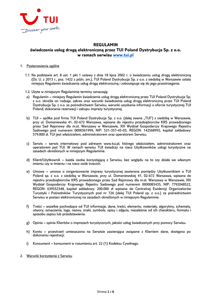 REGULAMIN świadczenia usług drogą elektroniczną przez TUI Poland Dystrybucja Sp. z o.o. w ramach serwisu www.tui.pl 1. Postanowienia ogólne 1.1. Na podstawie art. 8 ust. 1 pkt 1 ustawy z dnia 18 lipca 2002 r. o świadczeniu usług drogą elektroniczną (Dz. U. z 2013 r., poz. 1422 z późn. zm.), TUI Poland Dystrybucja Sp. z o.o. z siedzibą w Warszawie ustala niniejszy Regulamin świadczenia usług drogą elektroniczną i zobowiązuje się do jego przestrzegania. 1.2. Użyte w niniejszym Regulaminie terminy oznaczają: a) Regulamin – niniejszy Regulamin świadczenia usług drogą elektroniczną przez TUI Poland Dystrybucja Sp. z o.o. określa on rodzaje, zakres oraz warunki świadczenia usług drogą elektroniczną przez TUI Poland Dystrybucja Sp. z o.o. za pośrednictwem Serwisu, warunki uzyskania informacji o ofercie turystycznej TUI Poland, dokonania rezerwacji i zakupu imprezy turystycznej. b) TUI – spółka pod firma TUI Poland Dystrybucja Sp. z o.o. (dalej zwana „TUI”) z siedzibą w Warszawie, przy ul. Domaniewska 41, 02-672 Warszawa, wpisana do rejestru przedsiębiorców KRS prowadzonego przez Sad Rejonowy dla m.st. Warszawy w Warszawie, XIII Wydział Gospodarczy Krajowego Rejestru Sadowego pod numerem 0000361999, NIP: 521-357-45-03, REGON: 142568992, kapitał zakładowy: 579.800 zł. TUI jest właścicielem, administratorem oraz operatorem Serwisu. c) Serwis – serwis internetowy pod adresem www.tui.pl, którego właścicielem, administratorem oraz operatorem jest TUI. W ramach serwisu TUI świadczy na rzecz Użytkowników usługi turystyczne na zasadach określonych w niniejszym Regulaminie. d) Klient/Użytkownik – każda osoba korzystającą z Serwisu, bez względu na to czy działa we własnym imieniu czy w imieniu i na rzecz osób trzecich. e) Umowa – umowa o zorganizowanie imprezy turystycznej zawierana pomiędzy Użytkownikiem a TUI Poland sp. z o.o. z siedzibą w Warszawie, przy ul. Domaniewskiej 41, 02-672 Warszawa, wpisana do rejestru przedsiębiorców KRS prowadzonego przez Sad Rejonowy dla m.st. Warszawy w Warszawie, XIII Wydział Gospodarczy Krajowego Rejestru Sadowego pod numerem 0000083435, NIP: 7792048522, REGON: 639552348, kapitał zakładowy: 200.000 zł wpisana do Centralnej Ewidencji Organizatorów Turystyki i Pośredników Turystycznych pod nr 726 (dalej TUI Poland sp. z o.o.) za pośrednictwem Serwisu w postaci elektronicznej na zasadach określonych w niniejszym Regulaminie. f) Treści – wszelkie pochodzące od TUI informacje, dane, treści, elementy, materiały, algorytmy, schematy, utwory, oznaczenia, loga, nazwy, znaki, symbole, opisy i zdjęcia, niezależnie od ich charakteru, formatu i sposobu zapisu lub przedstawienia. g) Opinia – opinia Klientów o imprezach turystycznych, jakości usług świadczonych przy pomocy Serwisu. h) Konto – przestrzeń umieszczona na Serwisie zawierająca związane z Klientem dane, dostępna po dokonaniu rejestracji. i) Konsument – konsument w rozumieniu art. 22 (1) Kodeksu Cywilnego. 2. Warunki korzystania z Serwisu Strona 1 z 6 2.1. Korzystanie z Serwisu w tym w szczególności dokonywanie rezerwacji oraz nabycie imprez turystycznych dostępnych za pośrednictwem Serwisu wymaga od Klienta zapoznania się ze zrozumieniem, zaakceptowania i przestrzegania treści Regulaminu. 2.2. Wymagania techniczne niezbędne do korzystania z Serwisu: a) Urządzenie końcowe posiadające dostęp do sieci Internet. b) Zainstalowana na urządzeniu końcowym przeglądarka Internetowa Internet Explorer 8.0 lub wyższa, Mozilla Firefox 3.6 lub wyższa, z zainstalowaną Java Virtual Machine. c) Zainstalowany na urządzeniu końcowym program Acrobat Reader lub inny program obsługujący pliki w formacie PDF. 3. Rodzaje i zakres usług świadczonych drogą elektroniczną 3.1. TUI w ramach Serwisu umożliwia Użytkownikom zapoznanie się, w szczególności przy użyciu specjalistycznej wyszukiwarki, z rodzajami imprez turystycznych oraz propozycjami wyjazdu na zasadach „Last Minute”, jak również zapisanie się do serwisu ofert specjalnych, otrzymywanych e-mailem w ramach Serwisu. 3.2. TUI w ramach Serwisu umożliwia Użytkownikom uzyskanie aktualnej kalkulacji, to jest ustalenie wstępnej wysokości ceny imprez turystycznych na stronach hotelowych. 3.3. TUI w ramach Serwisu umożliwia Użytkownikom dokonanie rezerwacji miejsc w imprezie turystycznej, jak również nabycie tych miejsc i dokonanie za nie płatności. 3.4. Proponując Użytkownikom imprezy turystyczne, TUI określa w Serwisie następujące niezbędne informacje: - miejsce pobytu, - datę i miejsce wylotu, - czas trwania imprezy turystycznej, - rodzaj/ typ pokoju, - rodzaj, kategorie obiektu hotelarskiego, - cenę imprezy turystycznej wraz z terminem zapłaty, - ogólne informacje dotyczące udziału w imprezie turystycznej. Do dokonania rezerwacji i zawarcia Umowy, a także do rezygnacji z imprezy turystycznej, zmiany rezerwacji lub Umowy oraz do postępowania reklamacyjnego znajdują zastosowanie postanowienia Warunków Imprez Turystycznych, dostępne dla Użytkowników pod adresem: http://www.tui.pl/podroz-ztui/warunki-imprez-i-ubezpieczen. 4. Zasady korzystania z Serwisu 4.1. Wybór kryteriów rezerwacji. Użytkownik dokonuje wyboru dostępnych imprez turystycznych przy użyciu wyszukiwarek na stronie głównej: www.tui.pl, bądź korzystając z zakładek: - Last Minute - All Inclusive - Wakacje rodzinne – wakacje lotnicze z polskiego katalogu TUI Family - Narty – wakacje z dojazdem własnym z polskiego katalogu TUI Narty - Wakacje samochodem - wakacje z dojazdem własnym z polskiego katalogu TUI Samochodem - Egzotyka - Wycieczki objazdowe – wakacje z polskiego katalogu TUI Zwiedzanie - Bilety lotnicze Strona 2 z 6 Użytkownik określa: kierunek podróży, lotnisko wylotowe, datę rozpoczęcia oraz zakończenia wyjazdu, długość pobytu, ilość podróżujących osób (dorośli oraz dzieci). 4.2. Wynik wyszukiwania, prezentacja ofert. Serwis p