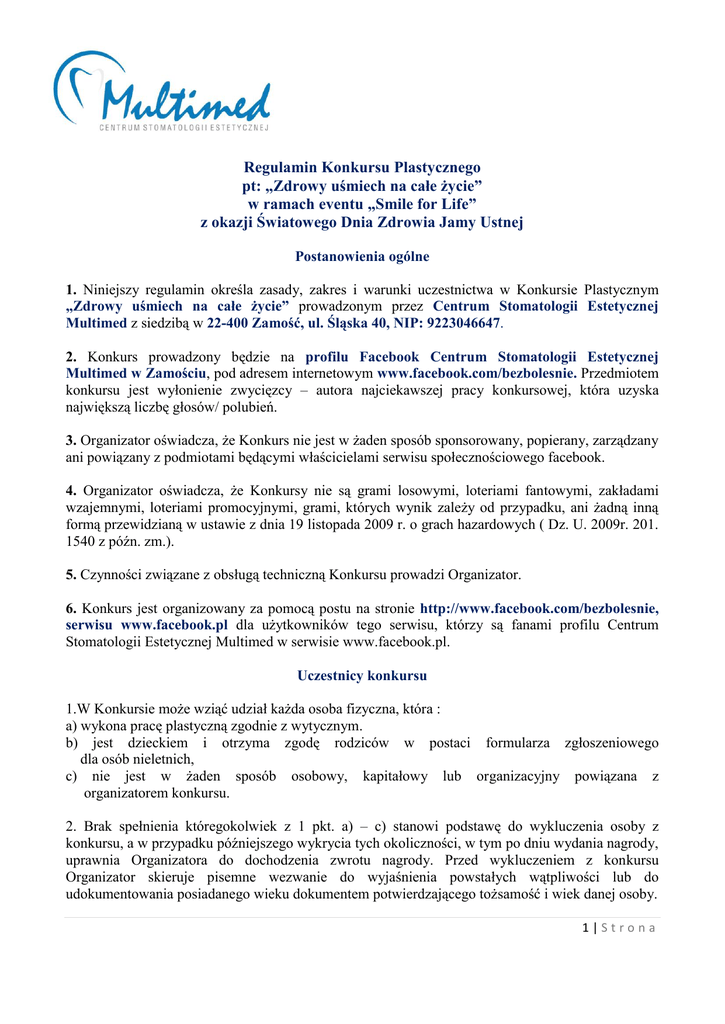 Regulamin Konkursu Plastycznego pt: „Zdrowy uśmiech na całe życie” w ramach eventu „Smile for Life” z okazji Światowego Dnia Zdrowia Jamy Ustnej Postanowienia ogólne 1. Niniejszy regulamin określa zasady, zakres i warunki uczestnictwa w Konkursie Plastycznym „Zdrowy uśmiech na całe życie” prowadzonym przez Centrum Stomatologii Estetycznej Multimed z siedzibą w 22-400 Zamość, ul. Śląska 40, NIP: 9223046647. 2. Konkurs prowadzony będzie na profilu Facebook Centrum Stomatologii Estetycznej Multimed w Zamościu, pod adresem internetowym www.facebook.com/bezbolesnie. Przedmiotem konkursu jest wyłonienie zwycięzcy – autora najciekawszej pracy konkursowej, która uzyska największą liczbę głosów/ polubień. 3. Organizator oświadcza, że Konkurs nie jest w żaden sposób sponsorowany, popierany, zarządzany ani powiązany z podmiotami będącymi właścicielami serwisu społecznościowego facebook. 4. Organizator oświadcza, że Konkursy nie są grami losowymi, loteriami fantowymi, zakładami wzajemnymi, loteriami promocyjnymi, grami, których wynik zależy od przypadku, ani żadną inną formą przewidzianą w ustawie z dnia 19 listopada 2009 r. o grach hazardowych ( Dz. U. 2009r. 201. 1540 z późn. zm.). 5. Czynności związane z obsługą techniczną Konkursu prowadzi Organizator. 6. Konkurs jest organizowany za pomocą postu na stronie http://www.facebook.com/bezbolesnie, serwisu www.facebook.pl dla użytkowników tego serwisu, którzy są fanami profilu Centrum Stomatologii Estetycznej Multimed w serwisie www.facebook.pl. Uczestnicy konkursu 1.W Konkursie może wziąć udział każda osoba fizyczna, która : a) wykona pracę plastyczną zgodnie z wytycznym. b) jest dzieckiem i otrzyma zgodę rodziców w postaci formularza zgłoszeniowego dla osób nieletnich, c) nie jest w żaden sposób osobowy, kapitałowy lub organizacyjny powiązana z organizatorem konkursu. 2. Brak spełnienia któregokolwiek z 1 pkt. a) – c) stanowi podstawę do wykluczenia osoby z konkursu, a w przypadku późniejszego wykrycia tych okoliczności, w tym po dniu wydania nagrody, uprawnia Organizatora do dochodzenia zwrotu nagrody. Przed wykluczeniem z konkursu Organizator skieruje pisemne wezwanie do wyjaśnienia powstałych wątpliwości lub do udokumentowania posiadanego wieku dokumentem potwierdzającego tożsamość i wiek danej osoby. 1|Strona Zasady i przebieg konkursu 1. Konkurs będzie się odbywał w dwóch etapach. 2. Prace mogą zostać wykonane w dowolnej technice. 3. Do pracy należy dołączyć formularz zgłoszeniowy wraz z czytelnym podpisem rodzica/opiekuna prawnego. 4. Organizator konkursu nie zwraca prac uczestników konkursu. ETAP I: 1. Pierwszy etap konkursu rozpoczynamy 22 marca br. 2. Prace mogą zostać wykonane w technice dowolnej. 3. czekamy na prace które zaprezentują jak osiągnąć i utrzymać piękny uśmiech w każdym wieku. 4. Do pracy należy dołączyć formularz zgłoszeniowy. 5. Prace plastyczne należy dostarczyć do dnia 22 kwietnia br. do siedziby Centrum Stomatologii Estetycznej Multimed lub przesłać na adres Multimed ul. Śląska 40, Zamość. ETAP II: 1. Głosujemy od 29 kwietnia br. godzina 9.00. do 14 maja br. godzina 24.00. 2. Na profilu facebook Centrum Stomatologii Estetycznej Multimed, zostanie utworzona galeria zdjęciowa z pracami pt: „Zdrowy uśmiech na całe życie” – w ramach eventu „Smile for Life”. 3. Głosowanie na najlepszą pracę odbywać się będzie poprzez kliknięcie „ lubię to” pod zdjęciem nadesłanej pracy. 4. Ważny głos mają tylko fani fanpag a Centrum Stomatologii Estetycznej Multimed (osoby które polubią stronę), głosować mogą osoby fizyczne posiadające autentyczne konto na www.facebook.pl 5. Pod każdą pracą można oddać tylko jeden głos. Każdy uczestnik konkursu, którego praca znajduje się w galerii może swoimi sposobami zachęcać do głosowania na zdjęcie ze swoją pracą. 6. Zwycięży praca która będzie miała najwięcej polubień, najwięcej głosów w postaci „ lubię to”. W przypadku równej liczby głosów jury podejmie decyzję która praca zwycięży. 7. W konkursie przewidziano atrakcyjną nagrodę rzeczową. 8. O przyznaniu nagrody decyduje ilość ważnych głosów oddanych na dane zdjęcie z pracą. 9. Rozstrzygnięcie konkursu (opublikowanie wyników) nastąpi 15 maja br. na fanpage u Centrum Stomatologii Estetycznej Multimed. 2|Strona 10. Organizator zastrzega, że wszelkie formy nieuczciwej rywalizacji mającej na celu mataczenie w konkursie, są zabronione. Tym samym, w uzasadnionych przypadkach, gdy któryś z uczestników dopuści się takich praktyk, Organizator ma prawo usunąć jego pracę z konkursu. 11. Imię i nazwisko oraz praca laureata zostaną opublikowane w serwisie facebook.com w komentarzu pod postem konkursowym przez osoby odpowiedzialne powołane przez Organizatora. 12. Organizator konkursu skontaktuje się z laureatem w celu odebrania nagrody. 13. Uczestnik traci prawo do nagrody w sytuacji braku możliwości nawiązania kontaktu. 14. Nagroda w konkursie nie może być wymieniona na gotówkę, ani na inne nagrody rzeczowe. Postanowienia końcowe 1. Organizator zastrzega sobie prawo do zmian zasad Konkursu nawet w trakcie jego trwania. Informacja o zmianach będzie umieszczona na profilu Centrum Stomatologii Estetycznej Multimed w serwisie facebook.com. Zmiany wchodzą w życie z dniem ich ogłoszenia na stronach internetowych. 2. Organizator nie ponosi odpowiedzialności za sprawy techniczne, powstałe w trakcie głosowania. 3. Zgłoszenie pracy do konkursu oznacza akceptację powyższego regulaminu przez uczestnika konkursu. 4. Organizator zastrzega sobie prawo do zmiany terminów głosowania. 5. W kwestiach nieuregulowanych Regulaminem stosuje się przepisy kodeksu cywilnego. 3|Strona