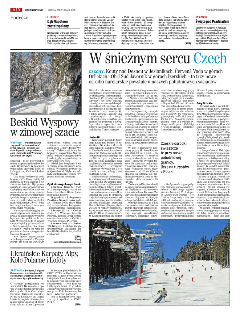A18 Podróże www.dziennikpolski24.pl SOBOTA, 27 LISTOPADA 2010 LUBUSKIE Dąb Napoleon został spalony Najgrubszy w Polsce dąb szypułkowy o imieniu Napoleon, który rósł w okolicach Milska pod Zieloną Górą, spłonął 15 listopada. Jak poinformo- wał Janusz Zawada, rzecznik Regionalnej Dyrekcji Lasów Państwowych w Zielonej Górze, można przypuszczać, że dąb został... podpalony. Był jednym z najcenniejszych pomników przyrody w Lubuskiem. Napoleon bywał podpalany w przeszłości; między innymi dwukrotnie przed II wojną światową, a ostatni raz w 2004 roku, kiedy to z pożaru ocalał tylko jeden jego konar. Miał 10,5 m obwodu i 22 m wysokości; wiek szacowano na ok. 660 lat. Przed wojną, dzięki księżnej Herminie von Schonaich–Carolath, żonie ostatniego niemieckiego cesarza i króla Prus Wilhelma II Hohenzollerna, nosił imię badacza przyrody, miłośnika sta- rych drzew z Wrocławia Teodora Schube; już wtedy uchodził za najgrubszy dąb na Śląsku. Obecną nazwę zawdzięczał legendzie, która głosi, że podczas wyprawy na Rosję w 1812 roku, po przeprawie przez Odrę, odpoczywał pod nim Napoleon Bonaparte. (SUB) JESIONIKI Święta pod Pradziadem Sporthotel Kurzovni w Karlovej Studance – to najwyżej położony hotel górski w Czechach. Za trzy noclegi, śniadania i kolację wigilijną – pakiet „Magiczne Boże Narodzenie pod Pradziadem” – zapłacimy 1540 koron od osoby. W śnieżnym sercu Czech Kouty nad Desnou w Jesionikach, Červená Voda w górach Orlickich i Obří Sud Javorník w górach Izerskich – to trzy nowe ośrodki narciarskie powstałe u naszych południowych sąsiadów CZECHY. Beskid Wyspowy w zimowej szacie WYPRAWY. – Po beskidzkich „wyspach” można wędrować przez cały rok – twierdzi Czesław Szynalik, pomysłodawca akcji „Odkryj Beskid Wyspowy”. I jak mówi, tak czyni! Szczebel – to cel pierwszej zimowej wyprawy miłośników Beskidu Wyspowego. W kolejnych tygodniach przyjdzie kolej na Lubogoszcz, Ćwilin i Luboń Wielki. Czy takie wędrówki będą bezpieczne? – Trasy zostały tak dobrane, by były łagodne i stosunkowo krótkie. Wytyczone zostały po istniejących drogach. Cechują się niewielkim stopniem trudności, a wcześniej zostaną przetarte, oczywiście jeżeli tylko spadnie śnieg – zapewnia Czesław Szynalik. Odkrywcy kolejnych beskidzkich „wysp” będą też mogli nacieszyć oczy malowniczymi widokami. Na szczycie każdej góry zostanie odprawiona msza św. polowa, a na uczestników wyprawy będzie czekał grill i ciepła herbata. Wędrówki będą odbywały się pod opieką przewodników. – Należy pamiętać, aby ciepło się ubrać. Trzeba też mieć odpowiednie obuwie – przypomina Czesław Szynalik. Kto może uczestniczyć w tych wyprawach? – Wszyscy, którzy nie boją się zimowych warunków, nawet rodziny z dziećmi – podkreśla organizator akcji „Odkryj Beskid Wyspowy”. Tylko wyjście na Lubogoszcz – na powitanie Nowego Roku – będzie wymagało dobrej kondycji, gdyż wędrówka będzie odbywała się w nocy. Udział jest bezpłatny i nie wymaga wcześniejszego zgłoszenia. Wystarczy przyjść na miejsce zbiórki. Gdyby warunki były ekstremalnie trudne wyprawa zostanie odwołana. Cykl zimowych wędrówek 5 grudnia – Szczebel: godz. 9 – Glisne (przełęcz) – szlak zielony – Szczebel – Glisne (przełęcz) szlak zielony. 31 grudnia – Lubogoszcz: Powitanie Nowego Roku. godz. 20 – Mszana Dolna (Park Miejski) – szlak zielony – Lubogoszcz – Mszana Dolna – szlak zielony. 6 lutego 2011 r. – Ćwilin: godz. 9 – Wilczyce (osiedle Pietrzki, Tablica Drogi Różańcowej) – bez szlaku – Ćwilin – Wilczyce (osiedle Pietrzki). 6 marca 2011 r. – Luboń Wielki: godz. 9 – Rabka Zaryte (Polczakówka) – bez szlaku – Luboń Wielki – Rabka Zaryte (Polczakówka). (DMA) Więcej: www.odkryjbeskidwyspowy.pl Ukraińskie Karpaty, Alpy, Koło Polarne i Lofoty SPOTKANIA. Borżawa, Gorgany, Czarnohora – ścieżkami ukraińskich Karpat wędrować będziemy razem z Agatą Nowakowską. O swoich przygodach we wschodnich Bieszczadach opowie w poniedziałek (29 listopada) o godz. 19 w Centralnym Ośrodku Turystyki Górskiej PTTK w Krakowie (ul. Jagiellońska 6a, wejście pierwszą bramą po prawej, idąc od ul. Szewskiej, sala nr. 17 na II piętrze). W kolejny poniedziałek do COTG PTTK w Krakowie zapraszają Magda Przesławska i Wojciech Sowa, których ścieżki powiodły na alpejskie czterotysięczniki – Dent Blanche i Obergabelhorn. 13 grudnia Jacek Płonczyński poprowadzi nas przez Koło Polarne na Lofoty („Włóczęgi północy”). I on to zakończy cykl tegorocznych spotkań w COTG PTTK. (DMA) Miliard – tyle koron zainwestowali Czesi w przygotowanie do zbliżającego się sezonu narciarskiego. Co za to będą mieli turyści? Trzy nowe ośrodki, dziewięć nowoczesnych kolejek krzesełkowych, szersze, bezpieczniejsze i sztucznie dośnieżane trasy, snowparki, a także zimowe „ogrody” dla najmłodszych. A ceny? – W większości ośrodków pozostaną na poziomie z ubiegłego roku – zapewnia Ivana Bilkova, szefowa Czeskiej Centrali Ruchu Turystycznego. Jesioniki Największy powód do dumy mają Kouty nad Desnou w Jesionikach. Na stokach Medvedi (1159 m n.p.m.) stanęło pierwsze w Czechach sześcioosobowe krzesełko. Dolna stacja dwukilometrowej kolejki znajduje się na 588 m n.p.m. a górna na 1095 m n.p.m. Narciarze będą mogli korzystać również z dwóch dwuosobowych wyciągów – pierwszy wywiezie ich z 574 na 674 m n.p.m., a drugi z 984 na 1085 m n.p.m. Szefowie stacji podkreślają, że większego ośrodka na Morawach nie ma. Od grudnia narciarze będą więc mogli szusować po 25 hektarach dobrze wyratrakowanych stoków. Najdłuższa trasa, niebiesko–czerwona Hrebenovka ma 2450 m długości, a zjechać nią będzie można od górnej do dolnej stacji krzesełka, tak samo zresztą, jak i czerwoną Medvedi (2150 m długości; obydwie 500 