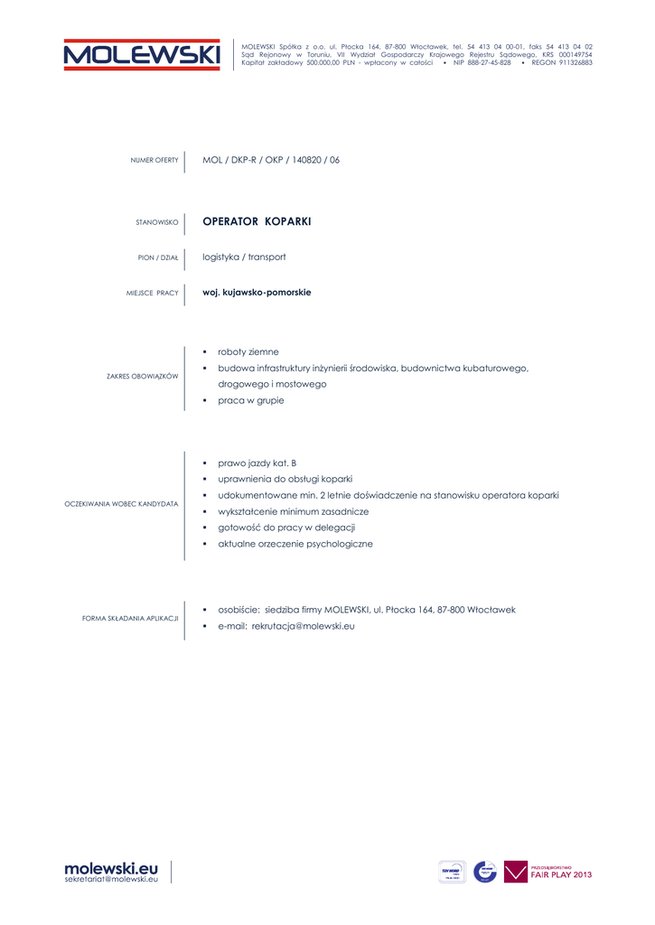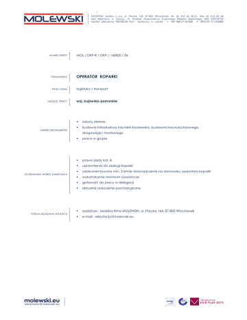 MOLEWSKI Spółka z o.o. ul. Płocka 164, 87-800 Włocławek, tel. 54 413 04 00-01, faks 54 413 04 02 Sąd Rejonowy w Toruniu, VII Wydział Gospodarczy Krajowego Rejestru Sądowego, KRS 000149754 Kapitał zakładowy 500.000,00 PLN - wpłacony w całości • NIP 888-27-45-828 • REGON 911326883 NUMER OFERTY MOL / DKP-R / OKP / 140820 / 06 STANOWISKO OPERATOR KOPARKI PION / DZIAŁ logistyka / transport MIEJSCE PRACY ZAKRES OBOWIĄZKÓW OCZEKIWANIA WOBEC KANDYDATA FORMA SKŁADANIA APLIKACJI woj. kujawsko-pomorskie roboty ziemne budowa infrastruktury inżynierii środowiska, budownictwa kubaturowego, drogowego i mostowego praca w grupie prawo jazdy kat. B uprawnienia do obsługi koparki udokumentowane min. 2 letnie doświadczenie na stanowisku operatora koparki wykształcenie minimum zasadnicze gotowość do pracy w delegacji aktualne orzeczenie psychologiczne osobiście: siedziba firmy MOLEWSKI, ul. Płocka 164, 87-800 Włocławek e-mail: [email protected]