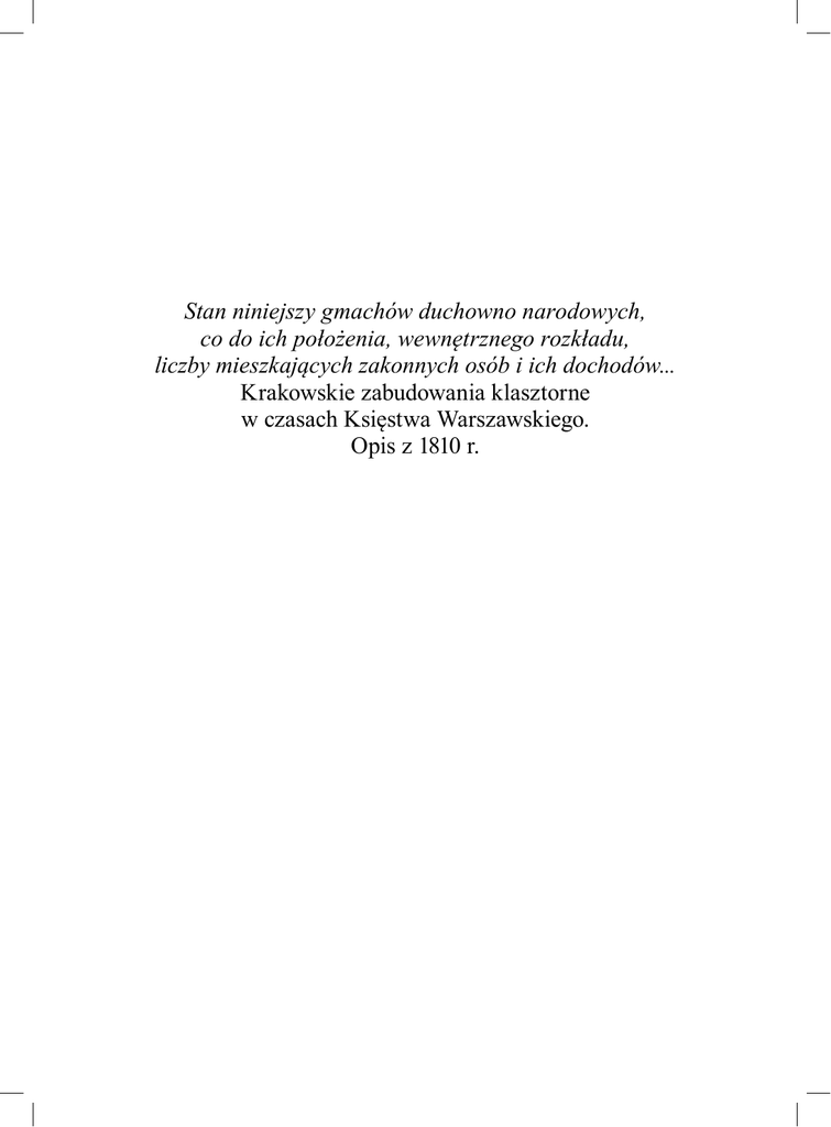 Stan niniejszy gmachów duchowno narodowych, co do ich położenia, wewnętrznego rozkładu, liczby mieszkających zakonnych osób i ich dochodów... Krakowskie zabudowania klasztorne w czasach Księstwa Warszawskiego. Opis z 1810 r. Dziedzictwo Kulturowe po Skasowanych Klasztorach redakcja Marek DERWICH Tom 5 Stan niniejszy gmachów duchowno narodowych, co do ich położenia, wewnętrznego rozkładu, liczby mieszkających zakonnych osób i ich dochodów... Krakowskie zabudowania klasztorne w czasach Księstwa Warszawskiego. Opis z 1810 r. wydała Kamila FOLLPRECHT Stan niniejszy gmachów duchowno narodowych, co do ich położenia, wewnętrznego rozkładu, liczby mieszkających zakonnych osób i ich dochodów... Krakowskie zabudowania klasztorne w czasach Księstwa Warszawskiego. Opis z 1810 r. wydała Kamila FOLLPRECHT Wrocławskie Towarzystwo Miłośników Historii Wrocław 2016 Praca naukowa finansowana w ramach programu Ministra Nauki i Szkolnictwa Wyższego pod nazwą „Narodowy Program Rozwoju Humanistyki” w latach 2012–2016 Seria wydawnicza „Dziedzictwo Kulturowe po Skasowanych Klasztorach” jest publikowana w otwartym dostępie na stronie internetowej www.kasaty.pl (licencja Creative Commons – CC by 4.0). Wersją pierwotną jest edycja drukowana Recenzenci ks. Mieczysław RÓŻAŃSKI, ks. Jacek URBAN Redakcja Maria DERWICH Tłumaczenie streszczenia Anna KIJAK Layout Andrzej SZNEJWEIS, Marek J. BATTEK Korekta Zofia SMYK Projekt okładki Andrzej SZNEJWEIS Indeksy Zofia SMYK, Marek DERWICH Skład i łamanie Jarosław DANIELAK © Copyright by Wrocławskie Towarzystwo Miłośników Historii, oddział Polskiego Towarzystwa Historycznego, Wrocław 2016 ISSN 2300-7885 ISBN 978-83-87843-39-7 Wydawca Wrocławskie Towarzystwo Miłośników Historii, oddział Polskiego Towarzystwa Historycznego ul. Szewska 49, PL 50-139 Wrocław www.wtmh.pl e-mail: [email protected] Druk i oprawa Drukarnia SOWA – Druk na życzenie www.sowadruk.pl, tel. +48-22-431-81-40