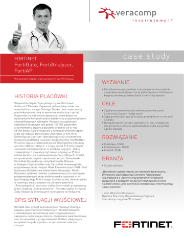 case study FORTINET FortiGate, FortiAnalyzer, FortiAP Wojewódzki Szpital Specjalistyczny we Wrocławiu HISTORIA PLACÓWKI Wojewódzki Szpital Specjalistyczny we Wrocławiu działa od 1984 roku. Zapewnia stałą opiekę medyczną mieszkańcom całego Dolnego Śląska. Jest nowoczesną placówką wyposażoną w aparaturę medyczną i sprzęt diagnostyczny najnowszej generacji, pozwalający na wykonywanie kompleksowych badań oraz przeprowadzanie skomplikowanych zabiegów. Rocznie na szpitalnych oddziałach leczonych jest ponad 100 000 pacjentów, a od momentu otwarcia placówki urodziło się w niej 68 000 dzieci. Dzięki wsparciu z funduszy unijnych szpital stale się rozwija. Dotychczas utworzono w nim m.in. Dolnośląskie Centrum Teleradiologii oraz uruchomiono medyczną platformę naukowo-diagnostyczną TeleMedNet. W sumie szpital zrealizował ponad 20 projektów o łącznej wartości 188 mln złotych, z czego ponad 112 mln złotych stanowiło dofinansowanie ze środków unijnych. Jedną z największych inwestycji był zakup jedynego w Polsce robota da Vinci do wykonywania operacji zdalnych. Szpital otrzymał wiele nagród i wyróżnień, w tym: Dolnośląski Certyfikat Gospodarczy, certyfikat Gazele Biznesu w kategorii Szpitalnictwo oraz Certyfikat Innowacyjności przyznawany przez Instytut Nauk Ekonomicznych PAN i Sieć Naukową Ministerstwa Szkolnictwa Wyższego i Nauki. Placówka zdobywa również czołowe miejsca w rankingach przeprowadzanych przez polskie media, uzyskała m.in. tytuł Najlepszego Publicznego Szpitala w woj. dolnośląskim w rankingu zrealizowanym na zlecenie dziennika „Rzeczpospolita” oraz tytuł Lidera Informatyki przyznawany przez redakcję „Computerworld”. Ponadto szpital otrzymał Złoty Skalpel za innowacyjne rozwiązania w medycynie. OPIS SYTUACJI WYJŚCIOWEJ Od 2004 roku szpital konsekwentnie realizuje strategię rozwoju systemów informatycznych. Zmodernizowano i rozbudowano serwerownię wraz z wyposażeniem, zakupiono nowe stacje robocze, zbudowano światłowodową sieć strukturalną o przepustowości 10 Gb/s, obejmującą wszystkie budynki szpitala – w tym również sale dla chorych. WYZWANIE • Umożliwienie personelowi oraz pacjentom korzystania z zasobów internetowych przy jednoczesnym zachowaniu bezpieczeństwa przetwarzania i transmisji danych CELE • Zagwarantowanie bezpieczeństwa przetwarzania i transmisji danych medycznych • Zapewnienie dostępu do rozwiązań mobilnych na terenie szpitala • Odseparowanie fizyczne wewnętrznej sieci medycznej dla personelu od sieci ogólnodostępnej dla pacjentów i gości szpitala ROZWIĄZANIE • FortiGate-1240B • FortiAnalyzer-1000C • FortiAP-220B BRANŻA • Służba zdrowia „Wrocławski szpital rozwija się niezwykle dynamicznie... Utworzenie Dolnośląskiego Centrum Teleradiologii i Dolnośląskie e-Zdrowie oraz programów krajowych związanych z dostępem do danych medycznych to tylko niektóre efekty, jakie przyniosła kompleksowa informatyzacja naszej placówki.” - prof. Wojciech Witkiewicz Dyrektor Naczelny Wojewódzkiego Szpitala Specjalistycznego we Wrocławiu. case study Stały dostęp do sieci usprawnił pracę personelu medycznego, tym samym zwiększając jej efektywność. Istotny element strategii stanowiło również wdrożenie systemów informatycznych, m.in. utworzenie Dolnośląskiego Centrum Teleradiologii oraz wdrożenie systemów klasy HIS , ERP oraz BI. Przy rozbudowie infrastruktury informatycznej dużo uwagi poświęcono również bezpieczeństwu systemu. Wraz z rozwojem placówki szpital poszukiwał rozwiązania zapewniającego bezpieczeństwo wrażliwych danych (dane osobowe pacjentów oraz historie ich choroby) przetwarzanych przez pracowników medycznych przed wyciekiem lub kradzieżą. Duże wyzwanie dla działu informatyki stanowił wzrost zapotrzebowania personelu medycznego na zdalny dostęp do danych medycznych znajdujących się poza szpitalem – w ramach Dolnośląskiego Centrum Teleradiologii – oraz za pośrednictwem projektu Dolnośląskie e-Zdrowie. Stały i szybki dostęp do sieci umożliwiający korzystanie z zasobów internetowych oraz komunikację za pośrednictwem sieci lokalnej na terenie placówki okazał się być niezbędnym dla personelu. Kierownictwo szpitala chciało również stworzyć możliwość dostępu do Internetu pacjentom szpitala, bez ryzyka kradzieży poufnych danych, a także ataków z zewnątrz oraz ze strony sieci lokalnej. W związku z pojawiającymi się nowymi wyzwaniami wydajność zastosowanego rozwiązania zabezpieczającego okazała się ograniczona. Dlatego dyrekcja szpitala podjęła decyzję o wdrożeniu zintegrowanej ochrony pod postacią urządzenia klasy UTM, które byłoby skuteczne i wydajne, a jednocześnie dostosowane do potrzeb placówki. Nowe rozwiązanie miało umożliwiać tworzenie reguł bezpieczeństwa zarówno dla grup komputerów, jak i pojedynczych maszyn, a także stwarzać możliwość analizy zagrożeń i na ich podstawie podejmować działania mające na celu ich wykrycie. W 2011 roku Wojewódzki Szpital Specjalistyczny we Wrocławiu ogłosił przetarg na dostawcę kompleksowego oraz elastycznego rozwiązania bezpieczeństwa sieci, które pozwoliłoby na zabezpieczenie infrastruktury IT i ochronę wrażliwych danych przed wyciekiem. Spośród dostępnych na rynku UTM-ów brano pod uwagę rozwiązania firm Sonicwall, Netasq, Juniper oraz FORTINET. W przetargu wygrało kompleksowe rozwiązanie firmy FORTINET, które w pełni odpowiadało potrzebom placówki przy zachowaniu korzystnej ceny. W 2012 roku zostało ogłoszone postępowanie przetargowe na zbudowanie sieci Wi-Fi. W tym przypadku również wygrało rozwiązanie oparte na technologii firmy FORTINET. ROZWIĄZANIE I WDROŻENIE Do ochrony sieci Wojewódzkiego Szpitala Specjalistycznego we Wrocławiu wybrano urządzenie zabezpieczające klasy UTM – FortiGate-1240B. Pozwala ono z dużą wydajnością wykorzystywać firewall w różn