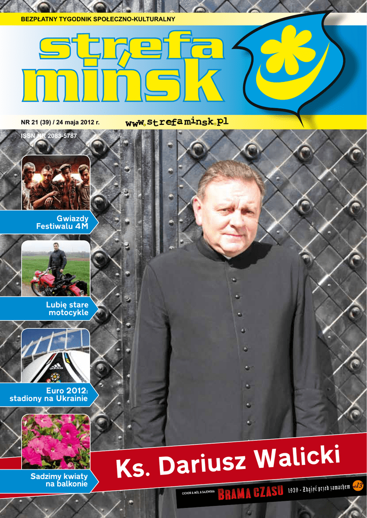 BEZPŁATNY TYGODNIK SPOŁECZNO-KULTURALNY NR 21 (39) / 24 maja 2012 r. ISSN NR 2083-5787 Gwiazdy Festiwalu 4M Lubię stare motocykle Sadzimy kwiaty na balkonie fot.PawełJ Euro 2012: stadiony na Ukrainie i k c i l a W z s u i Ks. Dar odc13 Dariusz Mól Redaktor naczelny tygodnika „Strefa Mińsk” Już w piątek rusza wielkie muzyczne wydarzenie, czyli tegoroczna edycja Festiwalu 4M – Mińsk Mazowiecki Miasto Muzyki. Przez trzy festiwalowe dni na scenie zagrają lokalne zespoły, kapele biorące udział w konkursie „Rock In Mińsk Fest 2012”, a także gwiazdy – Hey, Izrael, Luxtorpeda, Power of Trinity, Krzysztof Napiórkowski i Jarosław Wasik. Zapraszam na str. 12, na której przedstawiamy festiwalowych gości. 27 maja ksiądz dziekan Dariusz Walicki, proboszcz parafii pw. Narodzenia Najświętszej Maryi Panny będzie świętował 25-lecie kapłaństwa. Z kolei 8 września odbędą się uroczystości 590-lecia powstania najstarszego kościoła w naszym mieście. W związku z tymi rocznicami postanowiłem podpytać księdza proboszcza, prawie jak na spowiedzi, o jego pracę duszpasterską i nie tylko. Wartością tego wywiadu są archiwalne zdjęcia – myślę, że razem z tekstem tworzą one bardzo ciekawą całość. W dniach 1-3 czerwca odbędzie się siedemnasta edycja Mazowieckiego Rajdu Weteranów Szos „MAGNET”. Organizuje go Klub Dawnych Motocykli „Magnet”, który skupia zarówno motocyklistów dosiadających dawne jednoślady, jak i kolekcjonerów, pasjonatów i restauratorów zabytkowych pojazdów. Jednym z nich jest Daniel Gągol, prezes KDMM, który w „Strefie” opowiada o swoich maszynach i zbliżającym się rajdzie. „Zimni ogrodnicy” już za nami, a to oznacza, że najwyższa pora zacząć rozglądać się za sadzonkami kwiatów, które za kilka tygodni staną się ozdobą balkonów. Izabella Walewska-Ogrodnik przygotowała krótki przewodnik dla wszystkich, którzy zamierzają posadzić np. kolorowe pelargonie, surfinie, begonie, werbeny, lobelie, bakopy i fuksje. W „Strefie kibica EURO 2012 Mariusz Kamiński tym razem zabiera nas na Ukrainę i przedstawia stadiony w Kijowie, Charkowie i Doniecku. A wielbicieli naszego komiksu „Brama czasu” jak zwykle zapraszam na str. 17. Miłej lektury i wszystkiego dobrego :) Strefa informacji str. 4 „Mazowiecka Piętnastka”, nowe tablice PKP, Marcin Ciszewski w Miejskiej Bibliotece Publicznej, Dzień Miasta na Starym Rynku, turniej w grę karcianą „Jakub Wędrowicz” Strefa obyczajów str. 5 Iza Furdal o Dniu Matki Strefa osobowości str. 6 „To Pan Bóg wybiera” – wywiad z księdzem dziekanem Dariuszem Walickim, proboszczem parafii pw. Narodzenia Najświętszej Maryi Panny Strefa porad str. 10 Izabella Walewska-Ogrodnik o kwiatach na balkon Strefa wydarzenie str. 12 „Gwiazdy Festiwalu 4M”, czyli krótki przewodnik po artystach i zespołach, którzy wystąpią w naszym mieście Strefa pasji str. 14 „Lubię stare motocykle” – przekonuje Daniel Gągol, prezes Klubu Dawnych Motocykli „Magnet” Strefa kibica Euro 2012 str. 16 Stadiony w Kijowie, Charkowie i Doniecku Gdzie dostaniesz Strefę Mińsk: rano, w czwartek nasi kurierzy są na stacji PKP w Mińsku; tygodnik jest do wzięcia m.in.: w Miejskiej Bibliotece Publicznej, ul. Piłsudskiego 1a; w miejskim Aquaparku MOSiR, ul. Wyszyńskiego 56; w Miejskim Domu Kultury, w restauracji La Bella, ul. Piłsudskiego; w przychodni Melisa, ul. 11 listopada 4/18; w sklepie Office 1, ul. Warszawska; w sklepie spożywczym przy ul. Łupińskiego i przy ul. Śniadeckich, w sklepach „Topaz”, a także w wielu sklepach na terenie miasta. Strefa wydarzenie str. 17 Trzynasty odcinek komiksu „Brama czasu” Strefa flesz str. 18 Fotorelacja z mińskich wydarzeń Nie przegap – kalendarz miejskich imprez Ogłoszenia drobne str. 19 R e k l a m a W trudnej chwili żałoby jesteśmy do Państwa dyspozycji o każdej porze dnia i nocy Mińsk Mazowiecki, ul. Kościelna 6, tel. (25) 759 05 05, 503 823 712 3 Nowe tablice PKP „Mazowiecka Piętnastka” R e k l a m a Marcin Ciszewski w MBP Jak podaje portal minskmaz.com, na peronach PKP w Mińsku i okolicznych stacjach pojawiły się nowe gabloty informacyjne, w których podróżni mogą znaleźć rozkłady jazdy pociągów i inne ważne informacje. Właścicielem gablot jest spółka Koleje Mazowieckie, która w ramach całego projektu od drugiej połowy 2011 r. zamontowała 144 gabloty na 104 stacjach i przystankach osobowych. W celu zabezpieczenia ich przed zniszczeniem zastosowano odpowiednią szybę oraz wzmocniono tył przez zastosowanie grubszej blachy. Dodatkowo gabloty są pokryte powłoką antygraffitową. Gry karciane Tego jeszcze w Mińsku nie było – w sobotę, 2 czerwca odbędzie się turniej dla początkujących w grę karcianą „Jakub Wędrowicz” opartą na powieściach Andrzeja Pilipiuka. BURMISTRZ MIASTA MIŃSK MAZOWIECKI Marcin Jakubowski zaprasza na DZIEŃ MIASTA 1421-2012 „Między Menskiem a Sendomierzem” 29 MAJA 2012 ROKU (wtorek) 18.00-21.00 PLAC STARY RYNEK W programie: • Uroczysta Sesja Rady Miasta • Konkurencje wytrzymałościowo-sprawnościowe: - jazda na rowerze stacjonarnym - wyciskanie odważnika, brzuszki • Pokaz walk rycerskich Bractwa Rycerskiego Ziemi Mińskiej • Atrakcje zręcznościowe dla dzieci • Mała gastronomia 4 Miejska Biblioteka Publiczna zaprasza na spotkanie z Marcinem Ciszewskim, autorem popularnych powieści „Upał”, „www.ru2012.pl”, „Mróz”, „Major”, które odbędzie się w czwartek, 24 maja o godz. 18.30 w sali konferencyjnej MBP. Wstęp wolny. „Gdyby ktoś przed 11 września powiedział, że to jest możliwem, roześmiałbym się. [...] Po 11 września i po przeczytaniu tej książki nie zdecydowałbym się na [...]sformułowanie, że to w Polsce jest niemożliwe. Niezwykła akcja, niezwykłe okoliczności i niezwykły pomysł autora: po raz pierwszy w polskiej literaturze ktoś próbuje się zmierzyć z terroryzmem